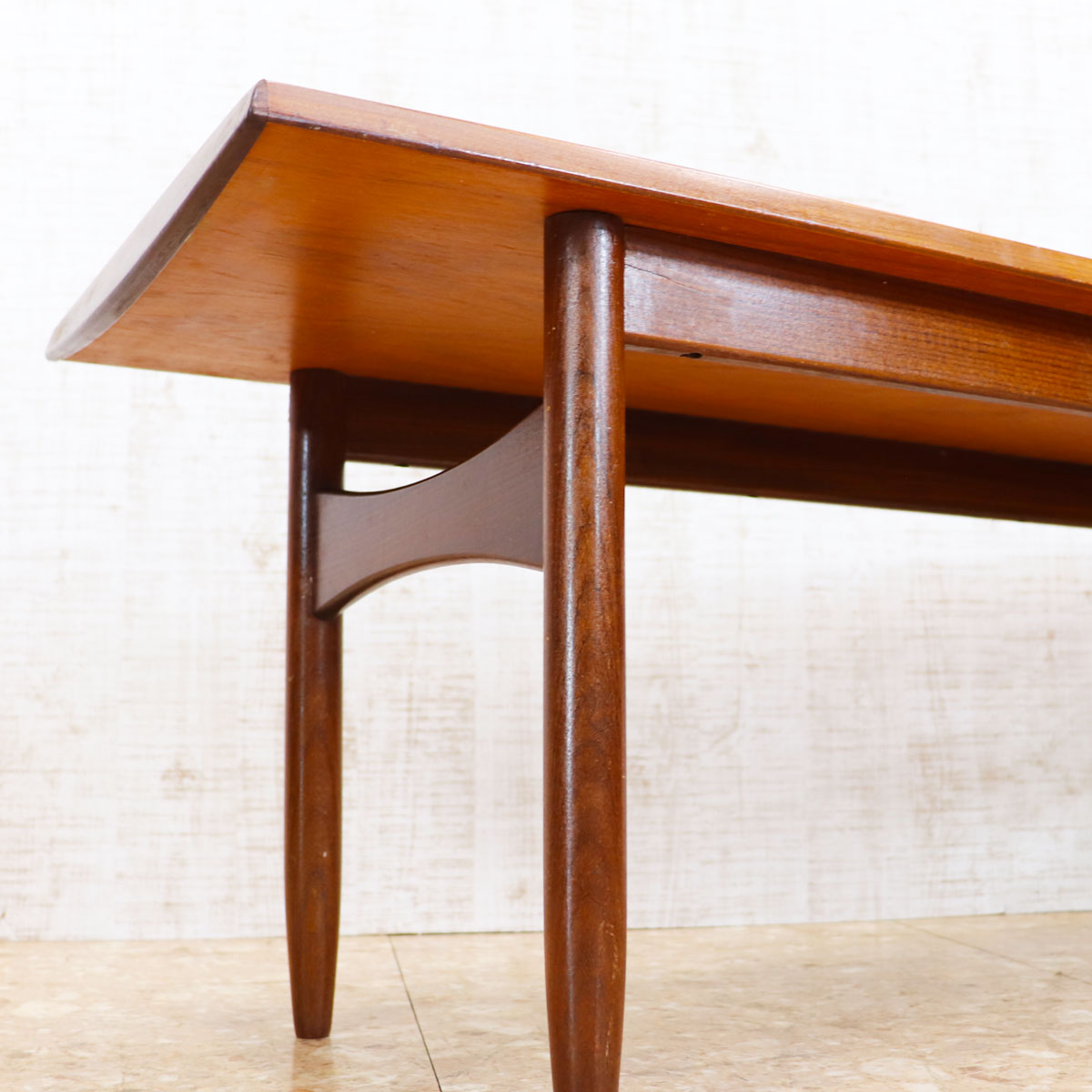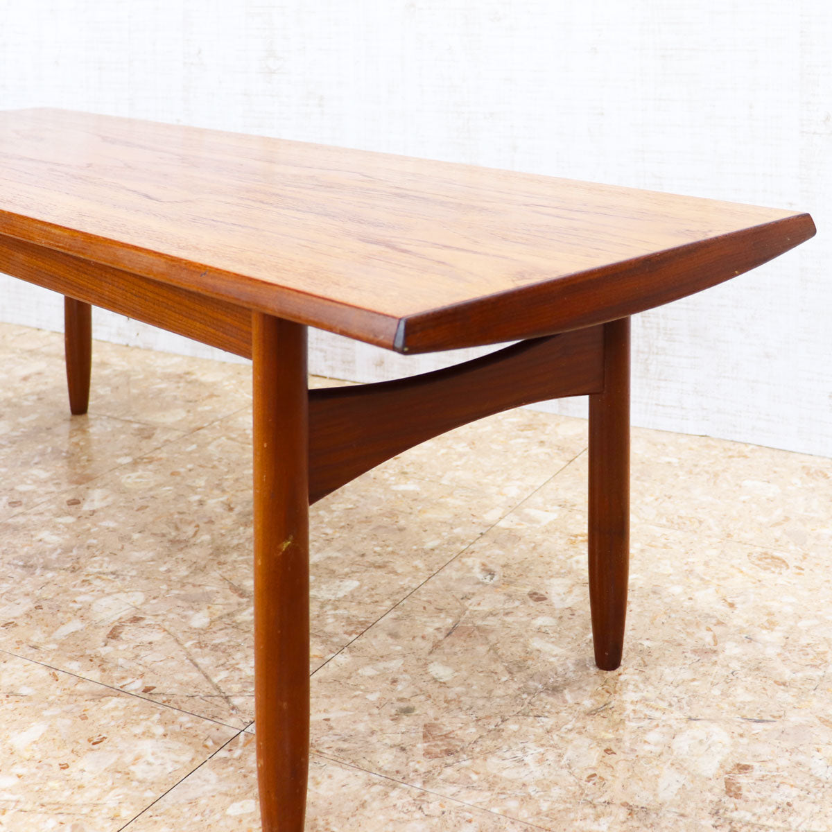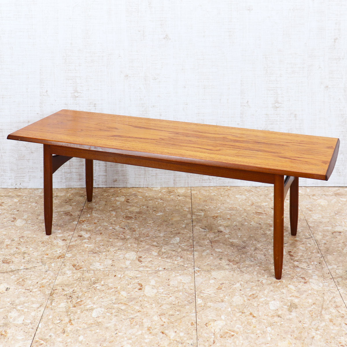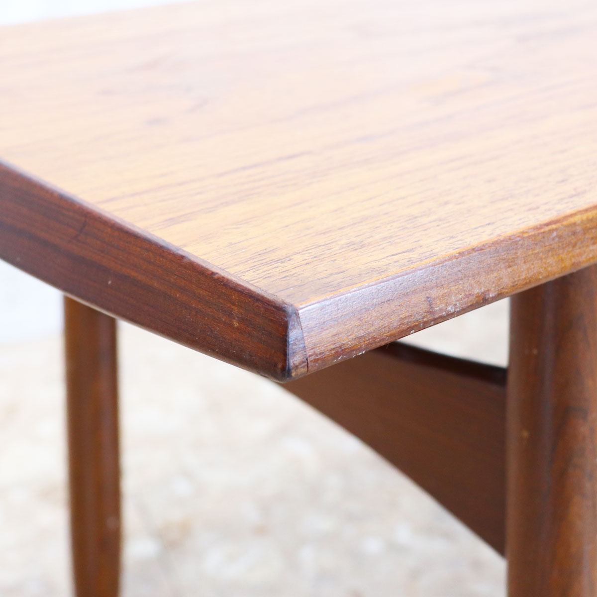 美しいチーク材の木目と、緩やかなテーパードレッグのシルエットが特徴です。無駄のない直線的なデザインながらも、天板のエッジには柔らかな曲線が施されており、北欧デザインの影響を感じさせます。ソファ前のテーブルとしてはもちろん、ディスプレイ台としても映える上品な佇まい。時を経たチークの深い色味が空間に温もりを添えます。