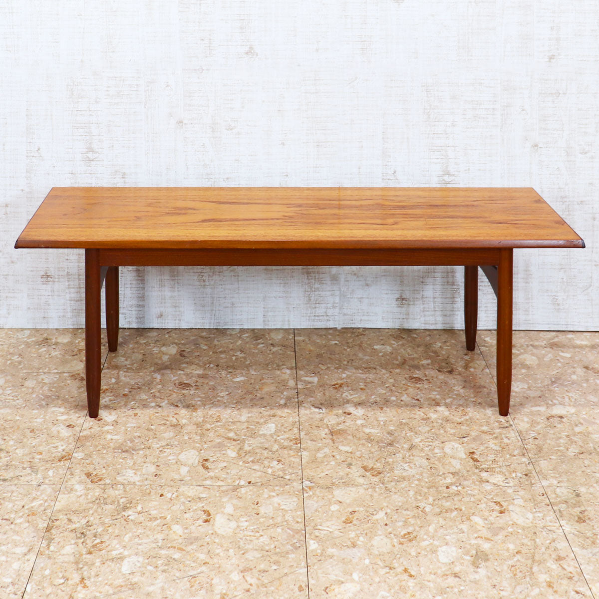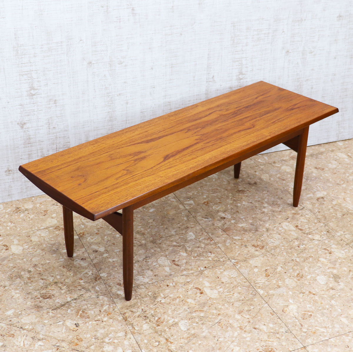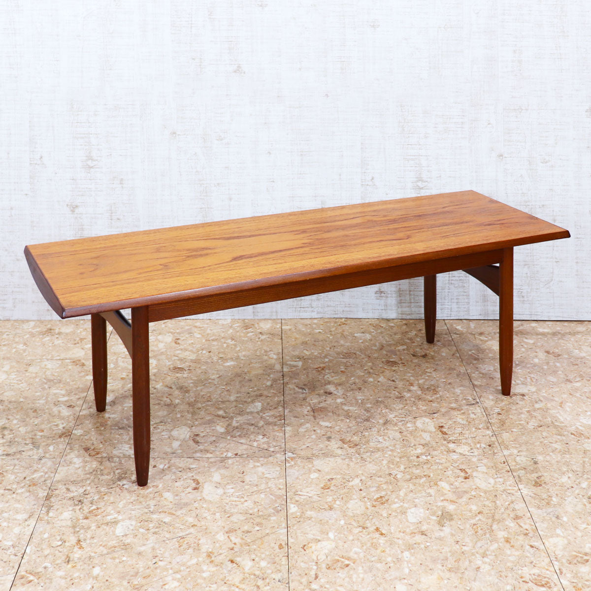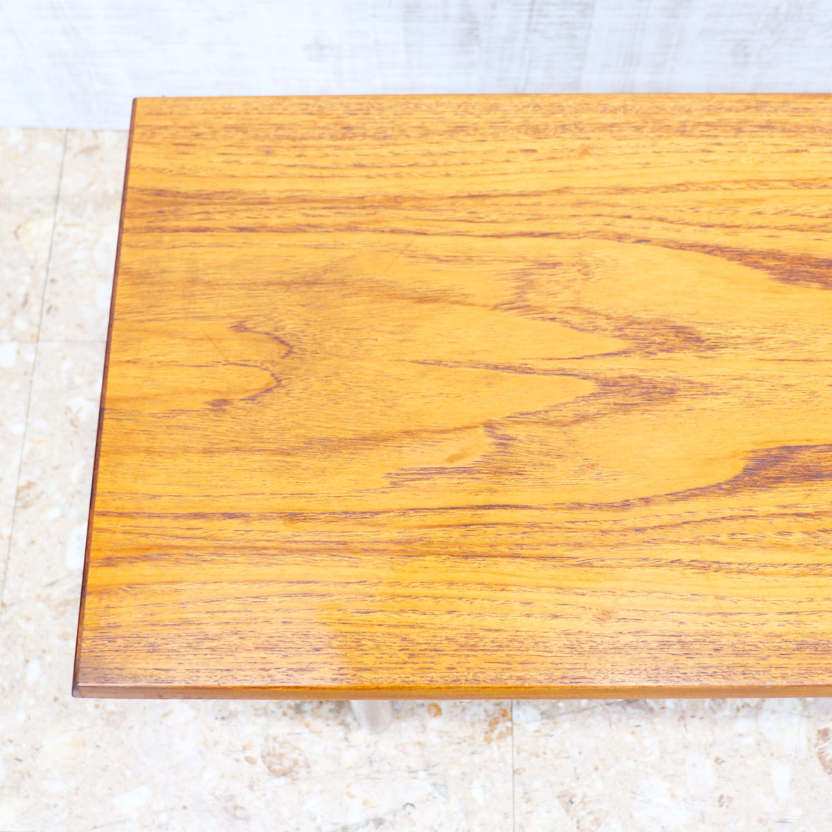 美しいチーク材の木目と、緩やかなテーパードレッグのシルエットが特徴です。無駄のない直線的なデザインながらも、天板のエッジには柔らかな曲線が施されており、北欧デザインの影響を感じさせます。ソファ前のテーブルとしてはもちろん、ディスプレイ台としても映える上品な佇まい。時を経たチークの深い色味が空間に温もりを添えます。