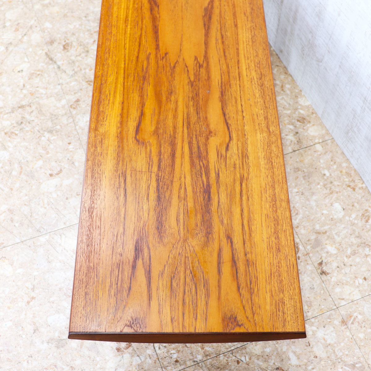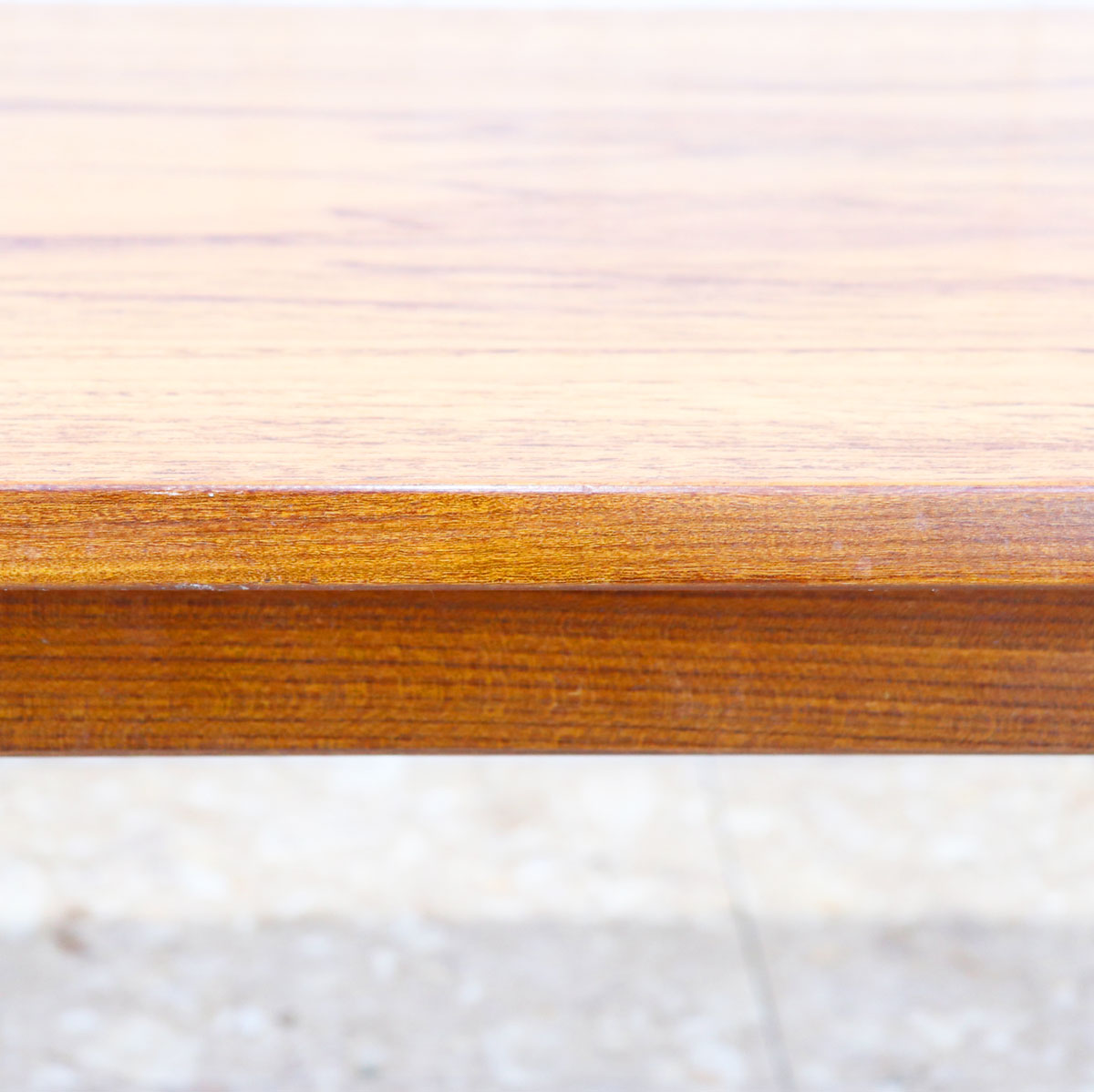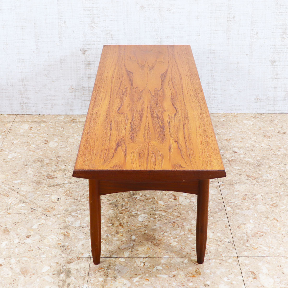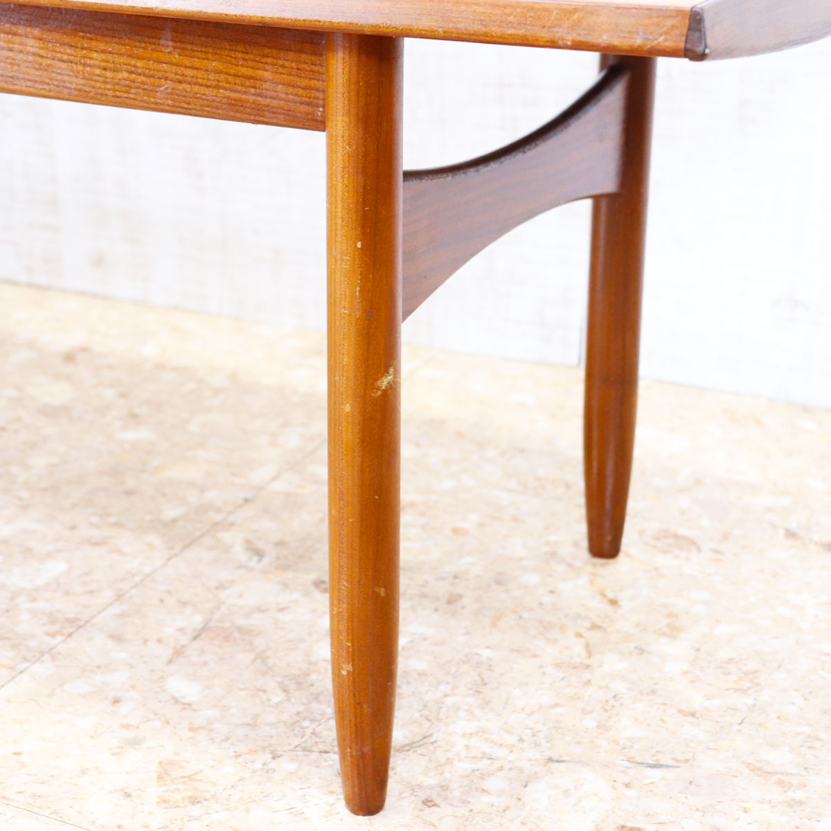 美しいチーク材の木目と、緩やかなテーパードレッグのシルエットが特徴です。無駄のない直線的なデザインながらも、天板のエッジには柔らかな曲線が施されており、北欧デザインの影響を感じさせます。ソファ前のテーブルとしてはもちろん、ディスプレイ台としても映える上品な佇まい。時を経たチークの深い色味が空間に温もりを添えます。