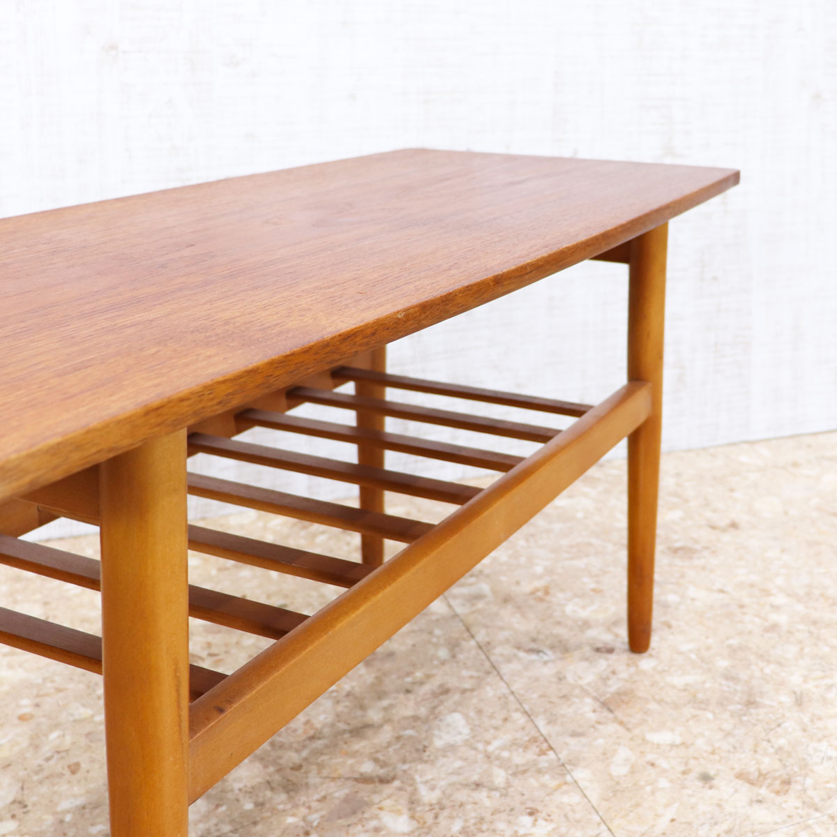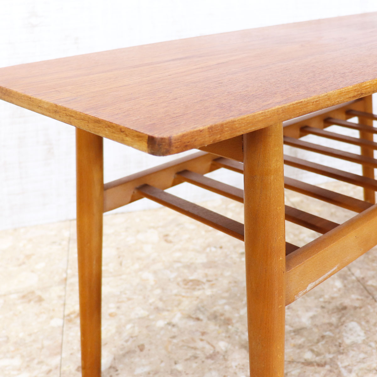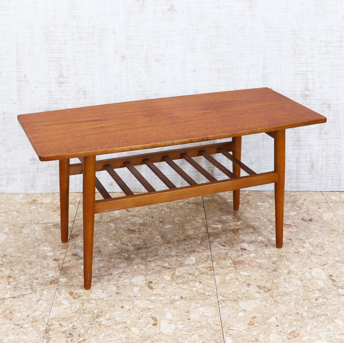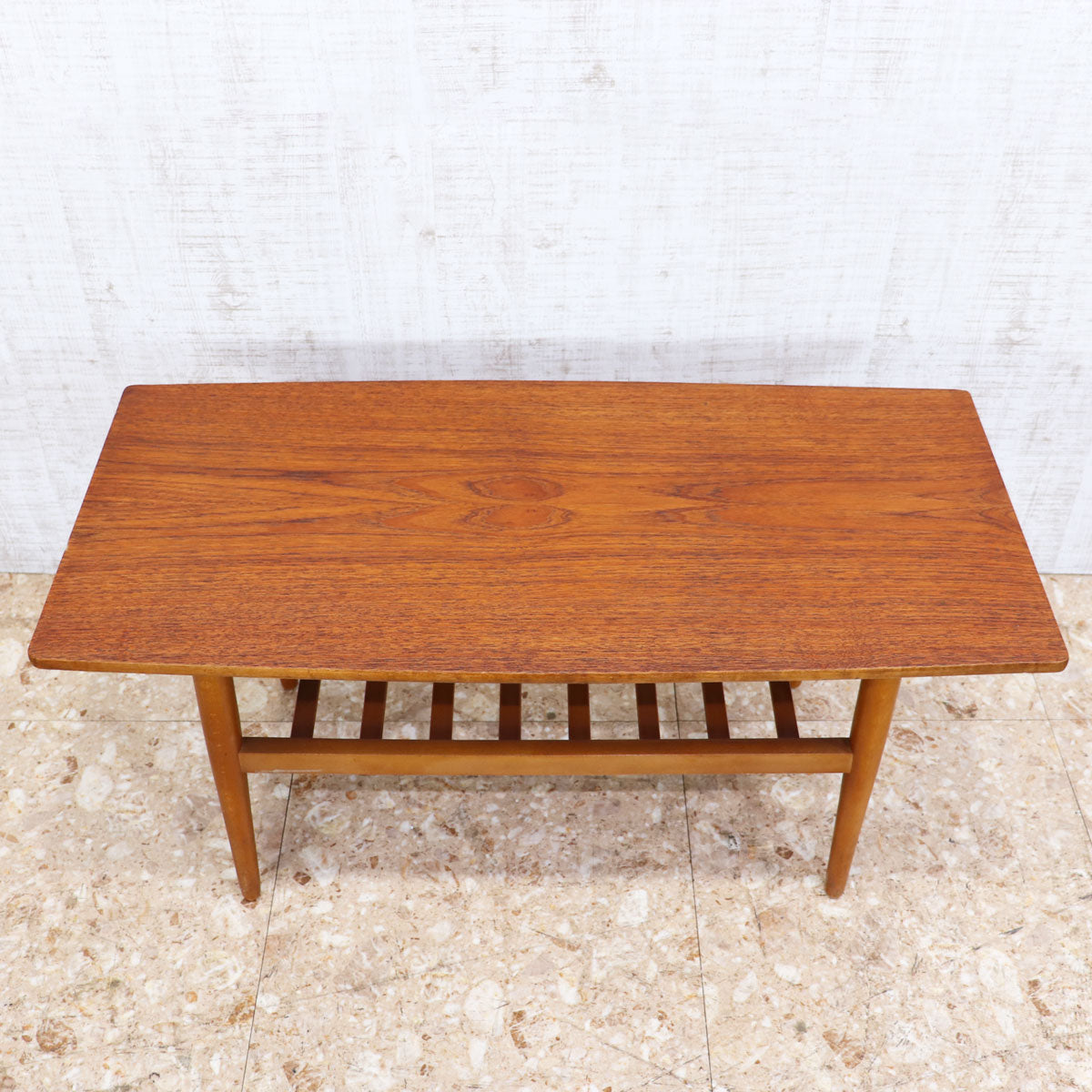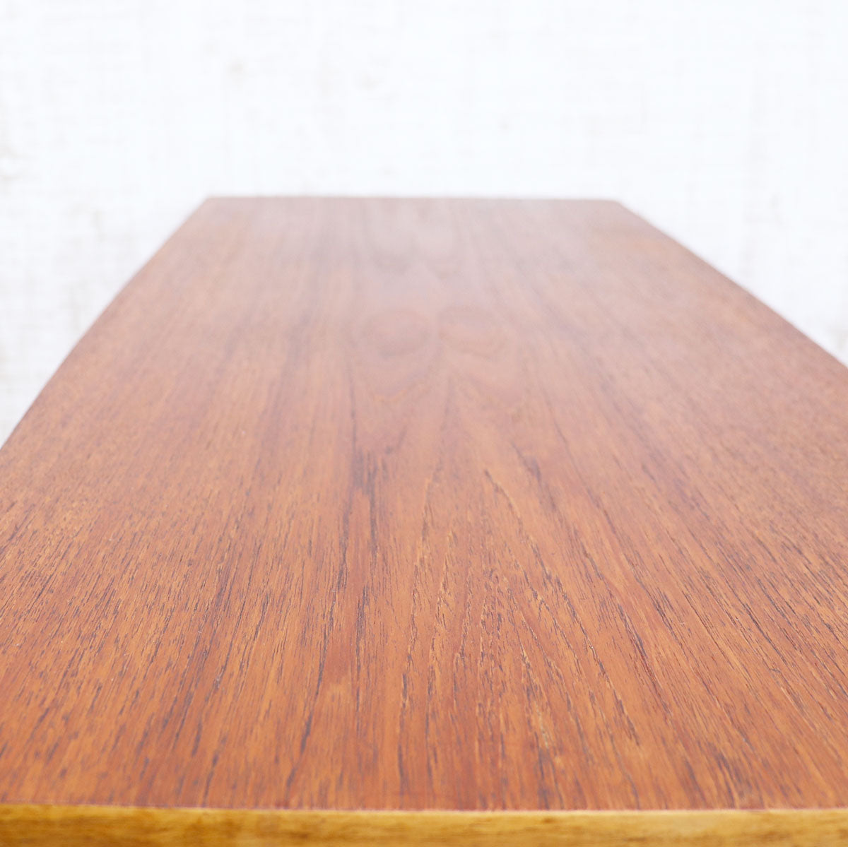 すっきりとしたシルエットと温もりのある木肌が魅力の一台です。天板はチーク材の美しい木目が引き立ち、ミッドセンチュリーデザインならではの上品さと実用性を兼ね備えています。