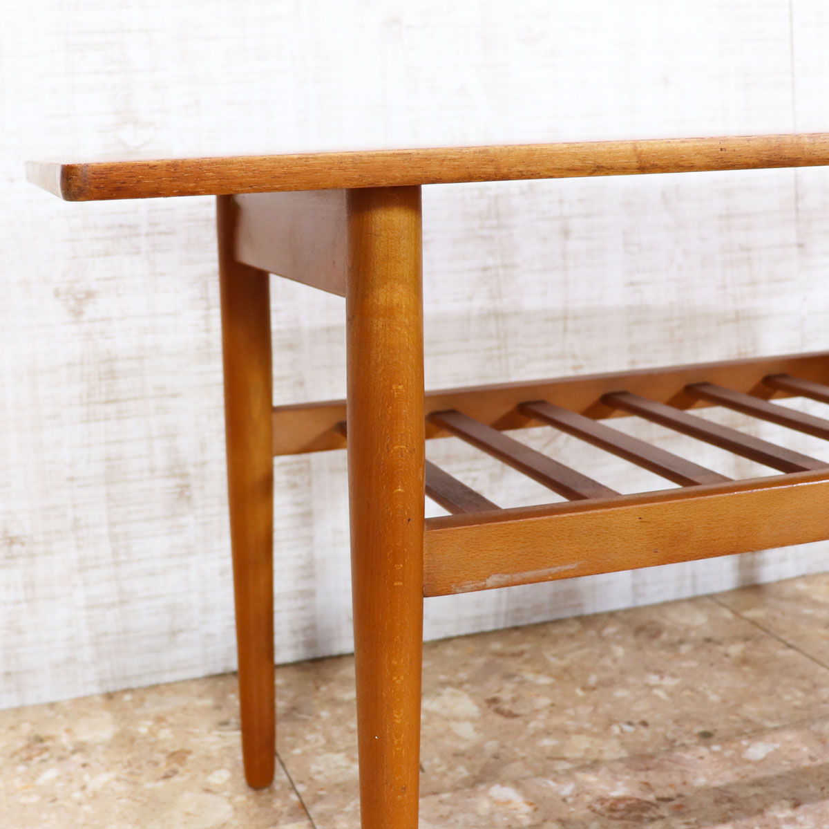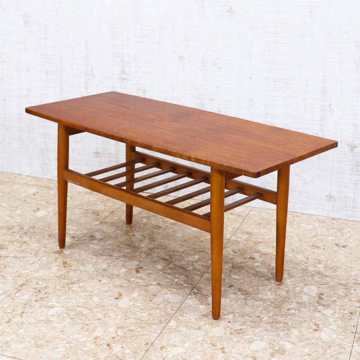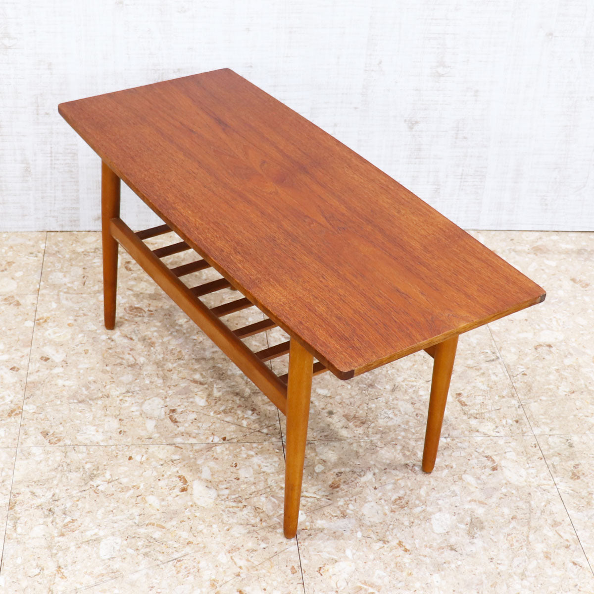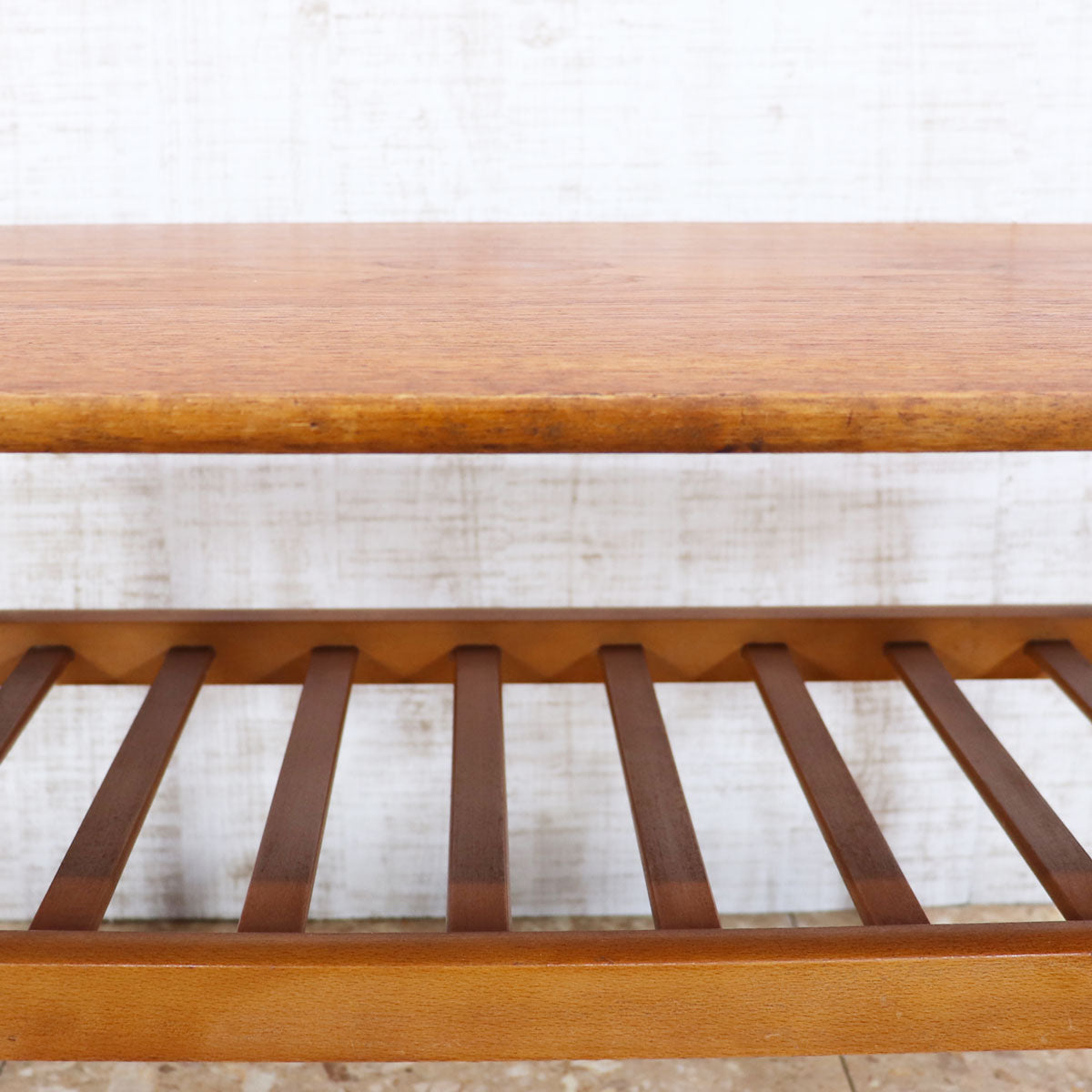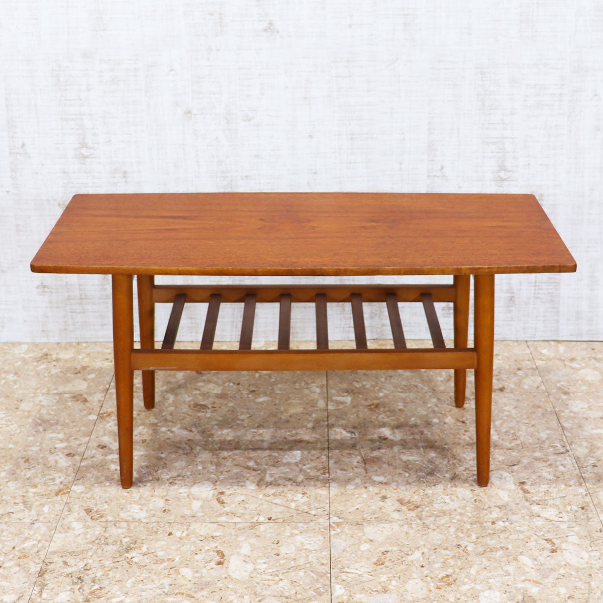 すっきりとしたシルエットと温もりのある木肌が魅力の一台です。天板はチーク材の美しい木目が引き立ち、ミッドセンチュリーデザインならではの上品さと実用性を兼ね備えています。