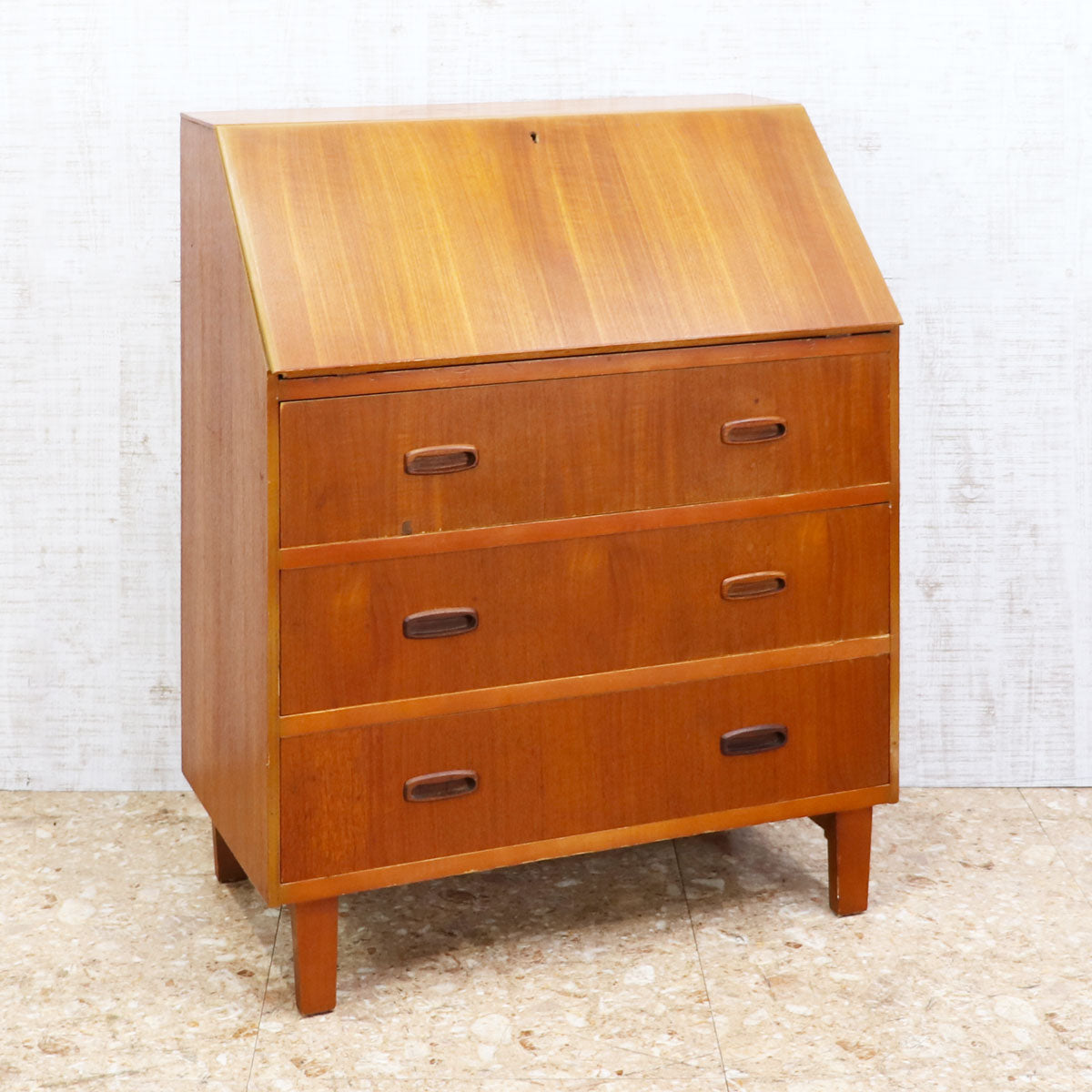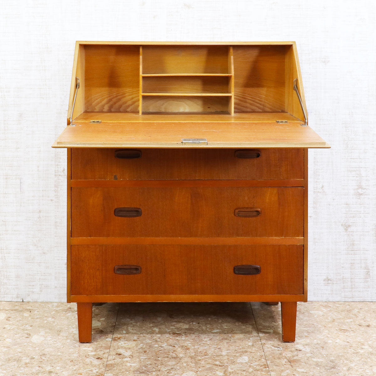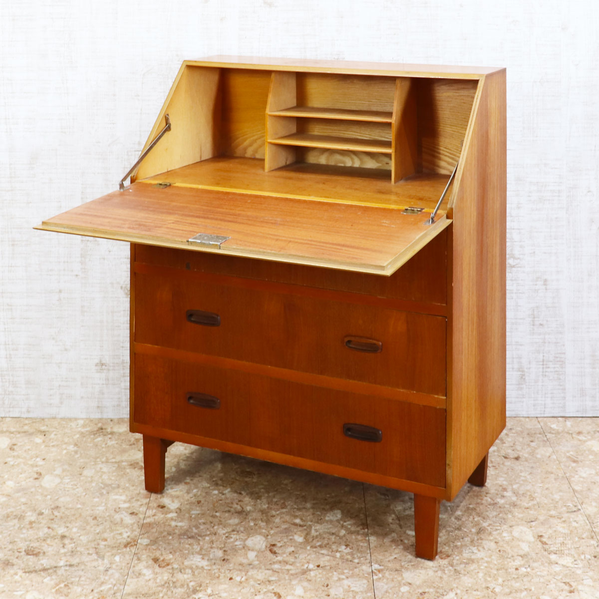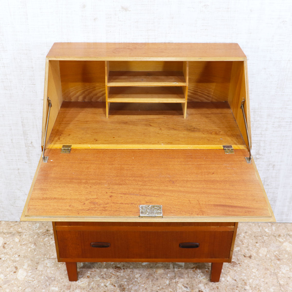 シンプルで直線的なフォルムに、脚部を持ち上げた軽やかなデザインが特徴。上部のフラップ扉を開けると、仕切りや小棚が備わった実用的なデスクスペースが現れ、手紙や文具、ノートパソコンなどの収納・作業に便利です。