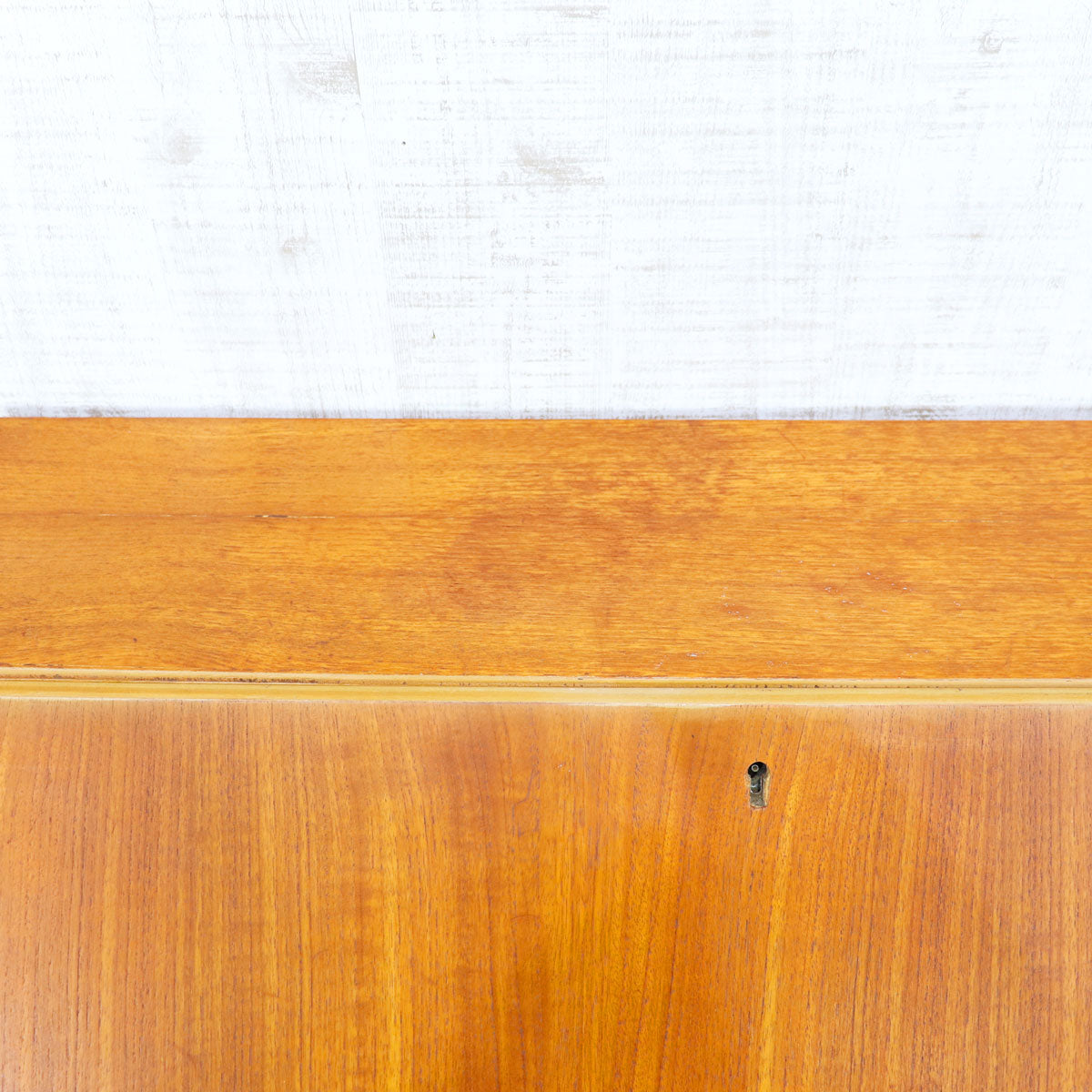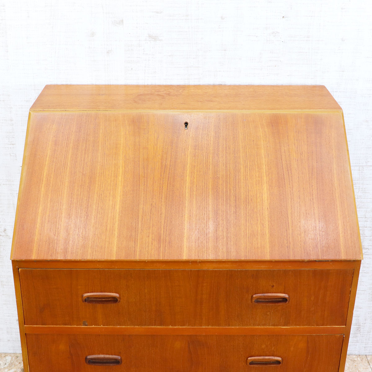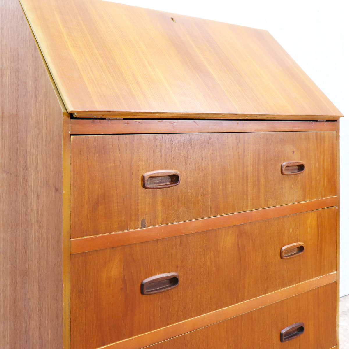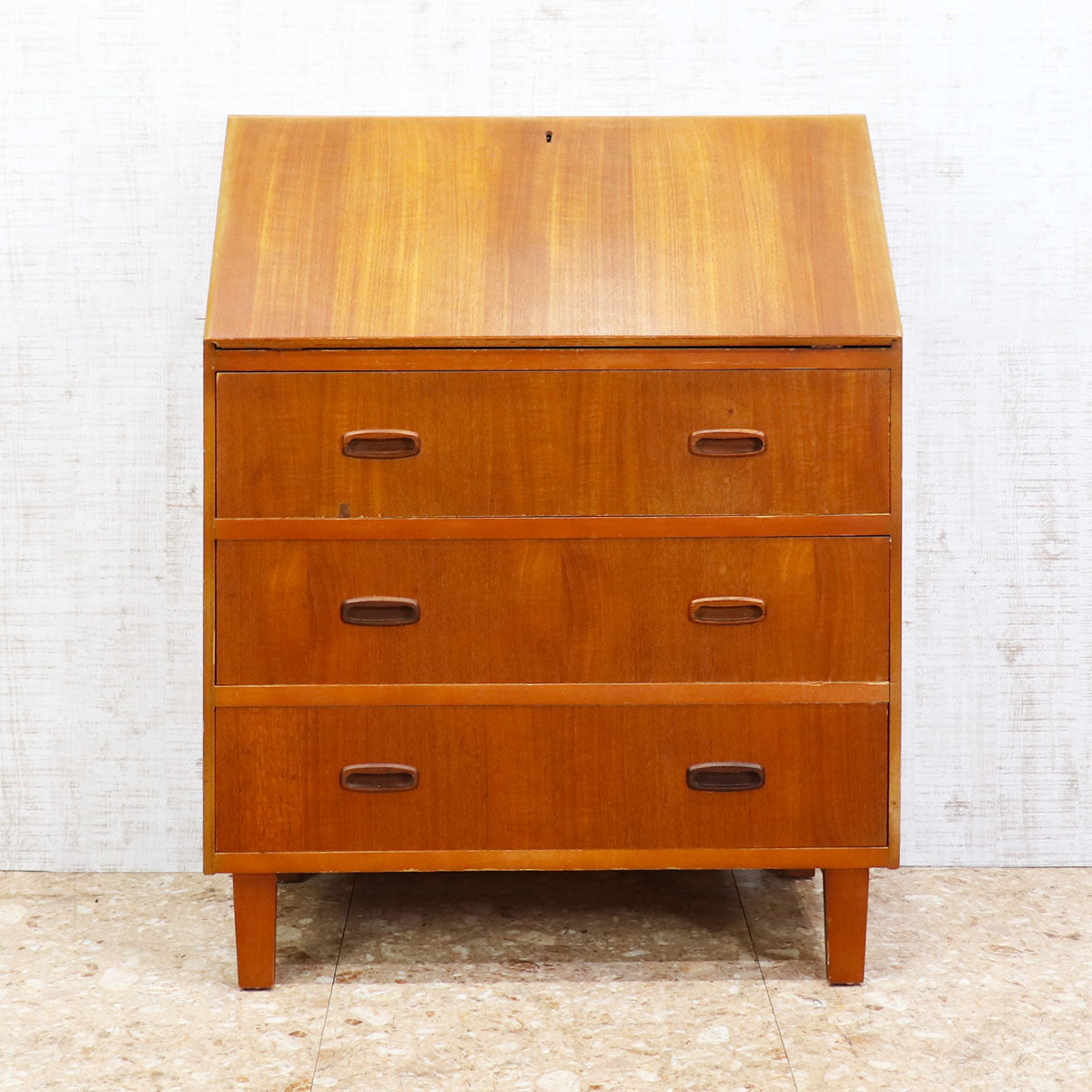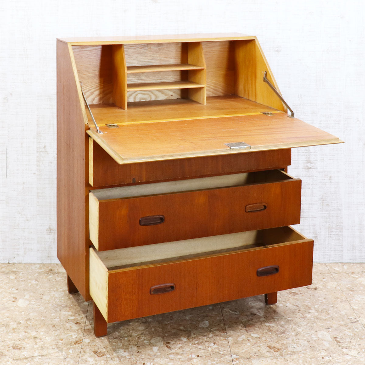 シンプルで直線的なフォルムに、脚部を持ち上げた軽やかなデザインが特徴。上部のフラップ扉を開けると、仕切りや小棚が備わった実用的なデスクスペースが現れ、手紙や文具、ノートパソコンなどの収納・作業に便利です。