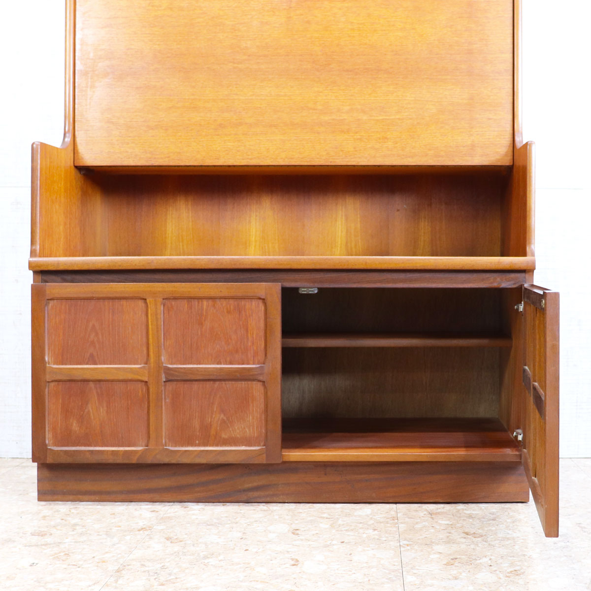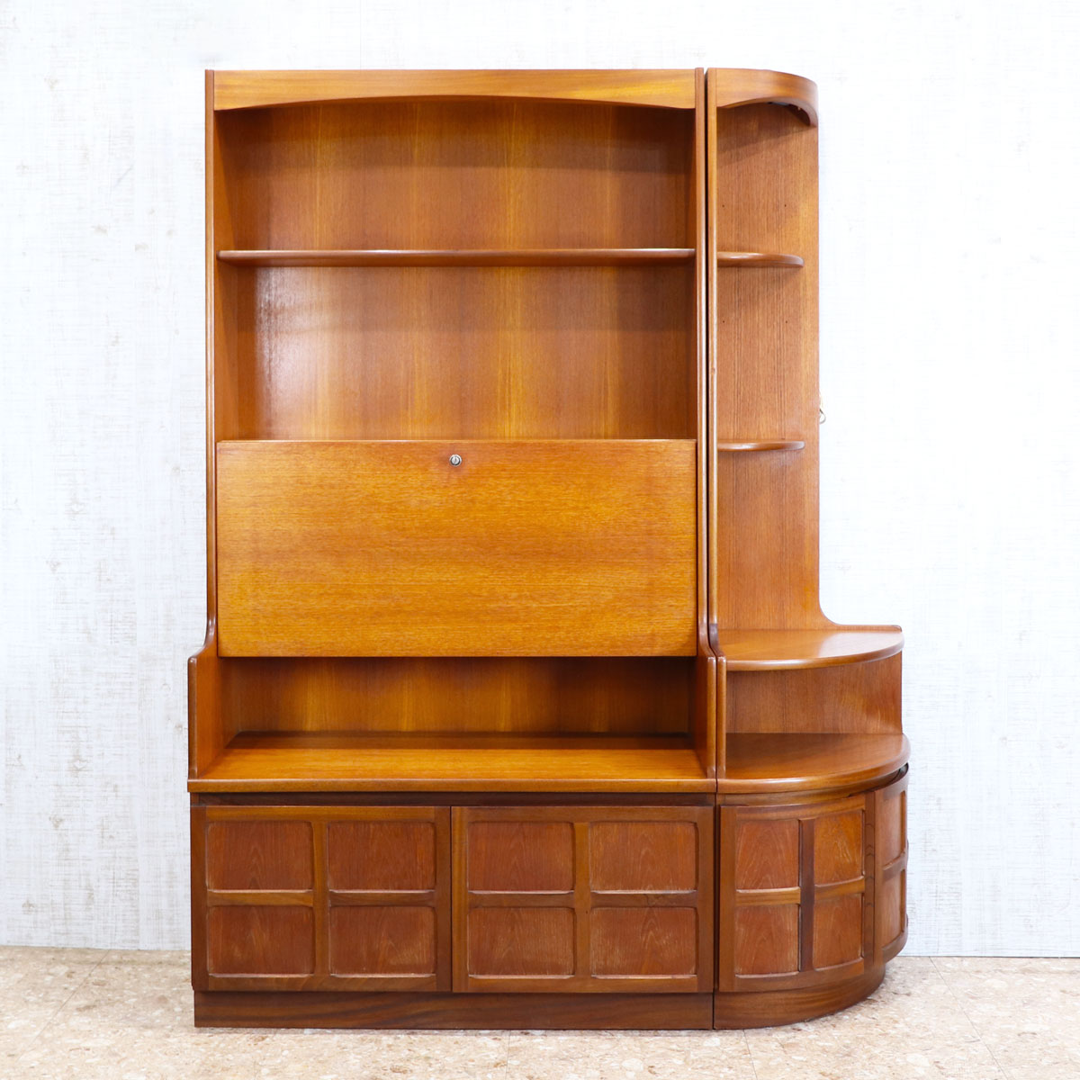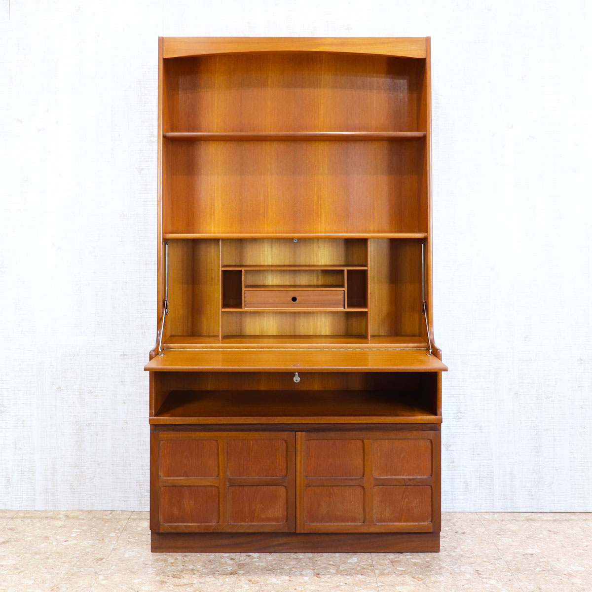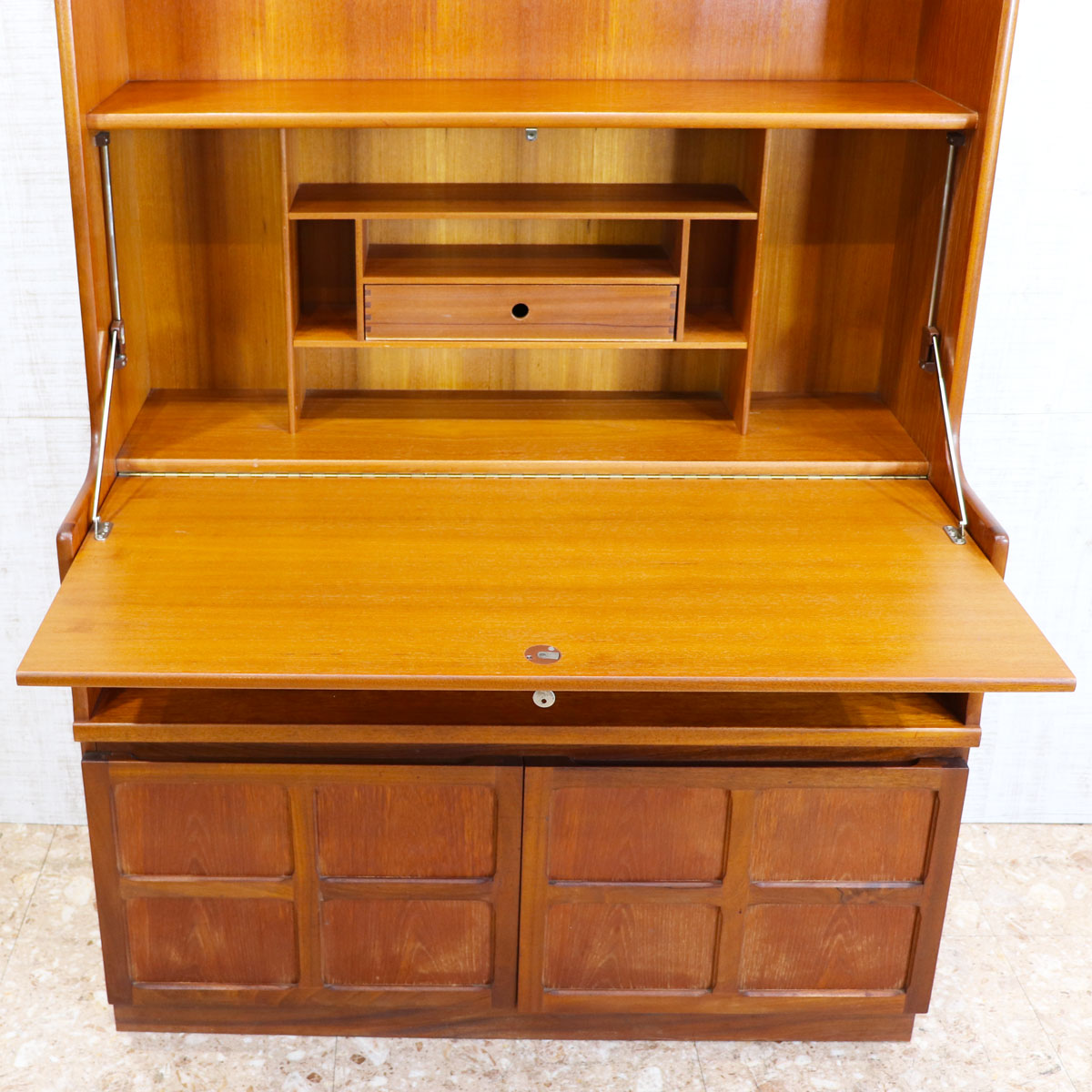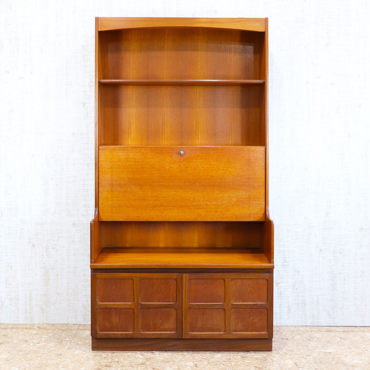 上部には飾り棚やブックシェルフ、中央にはフラップ式のビューローデスク、下部には収納キャビネットを備え、収納力と実用性を兼ね備えています。特に正面下段のクロスデザインはネイサンらしいデザインアイコンで、英国ミッドセンチュリーの気品を感じさせます。