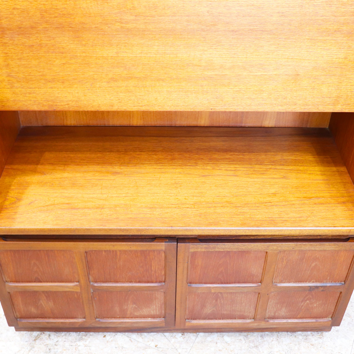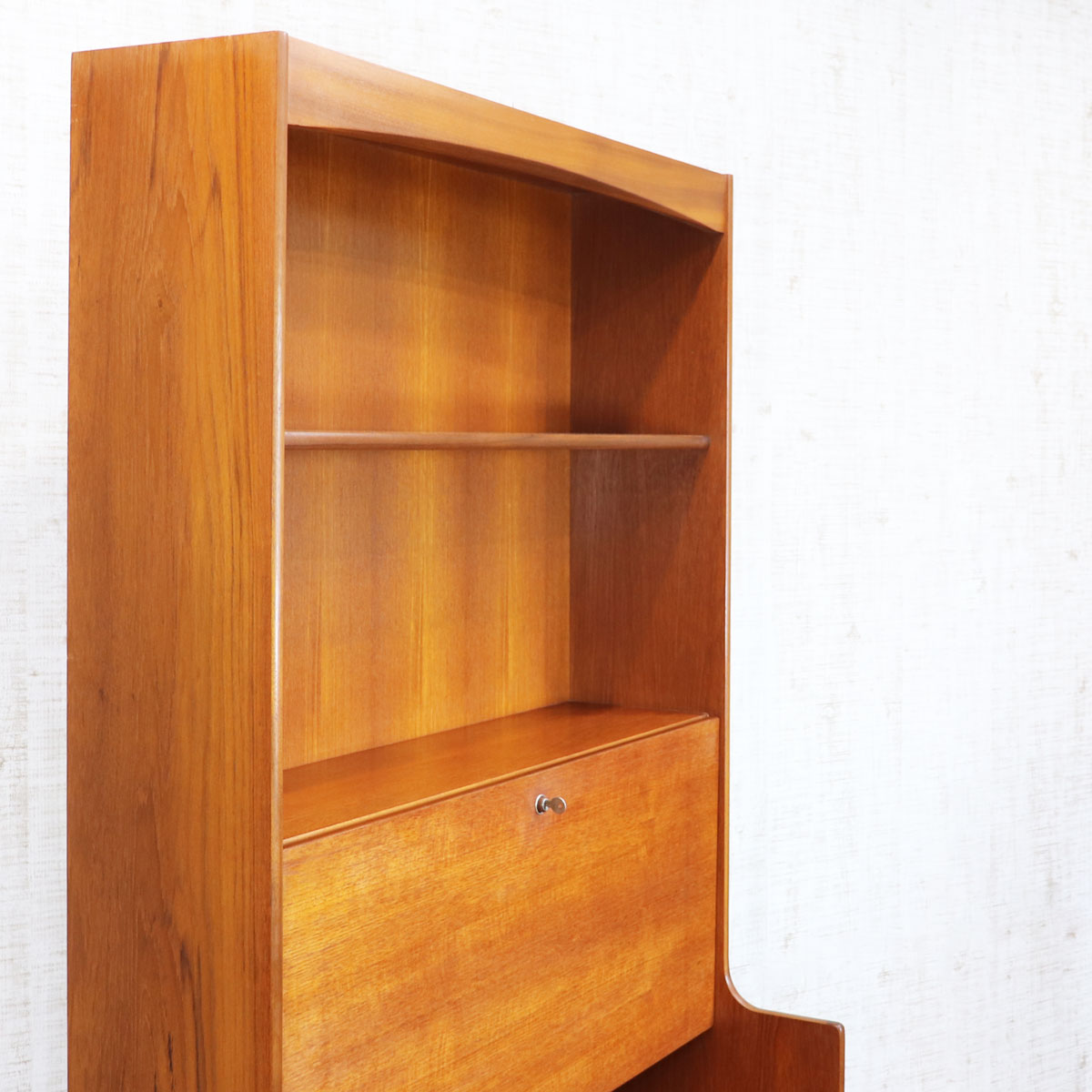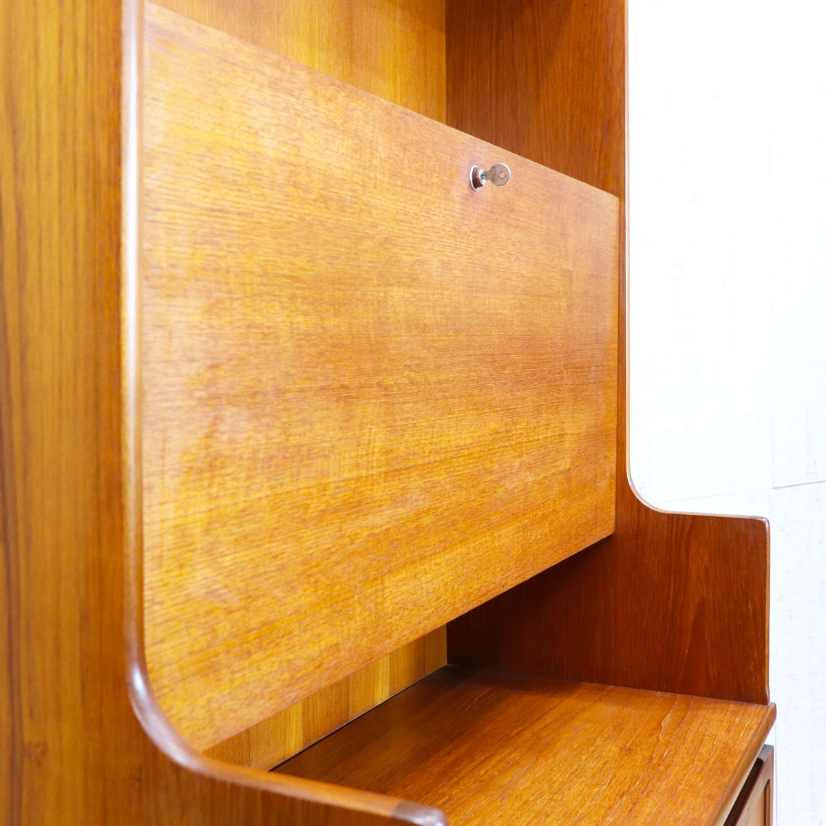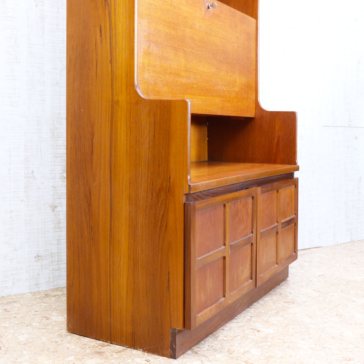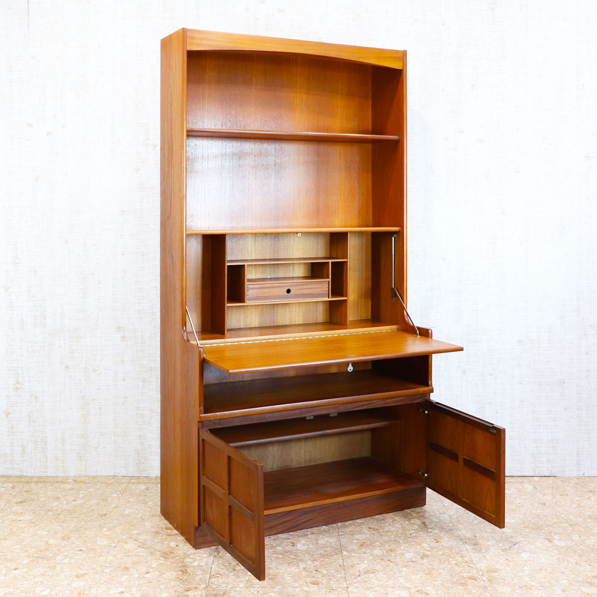 上部には飾り棚やブックシェルフ、中央にはフラップ式のビューローデスク、下部には収納キャビネットを備え、収納力と実用性を兼ね備えています。特に正面下段のクロスデザインはネイサンらしいデザインアイコンで、英国ミッドセンチュリーの気品を感じさせます。