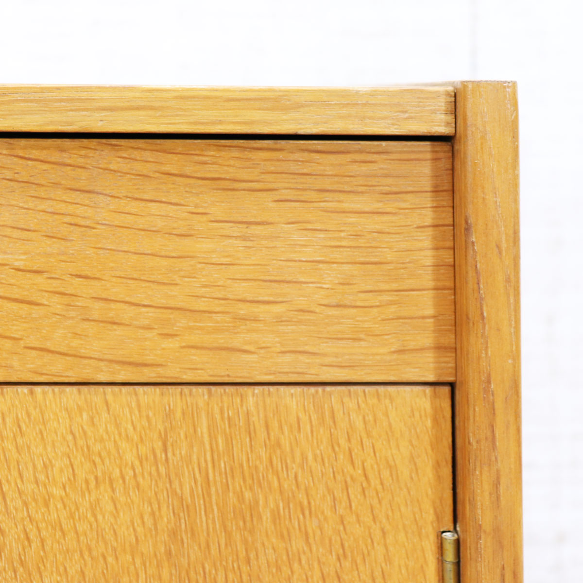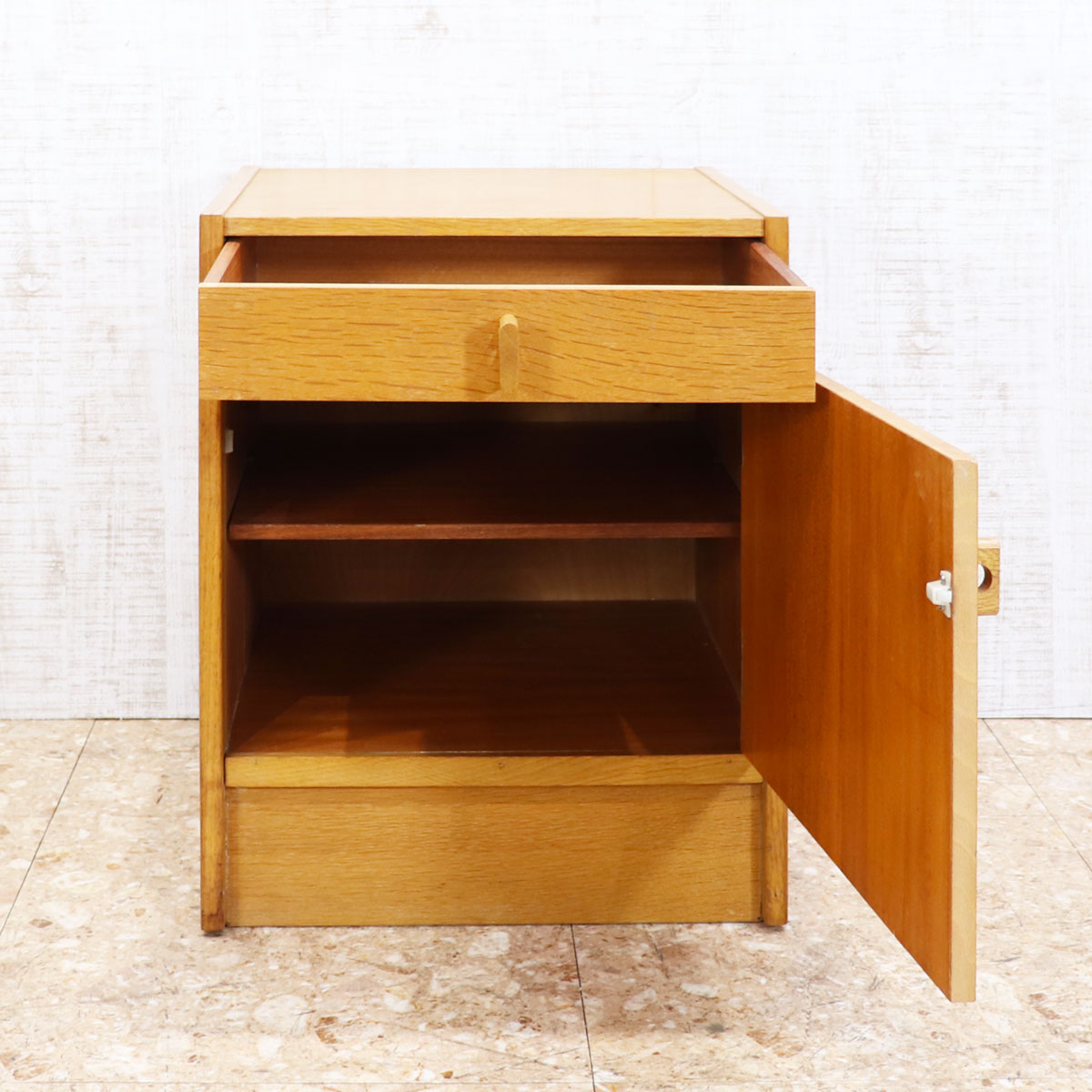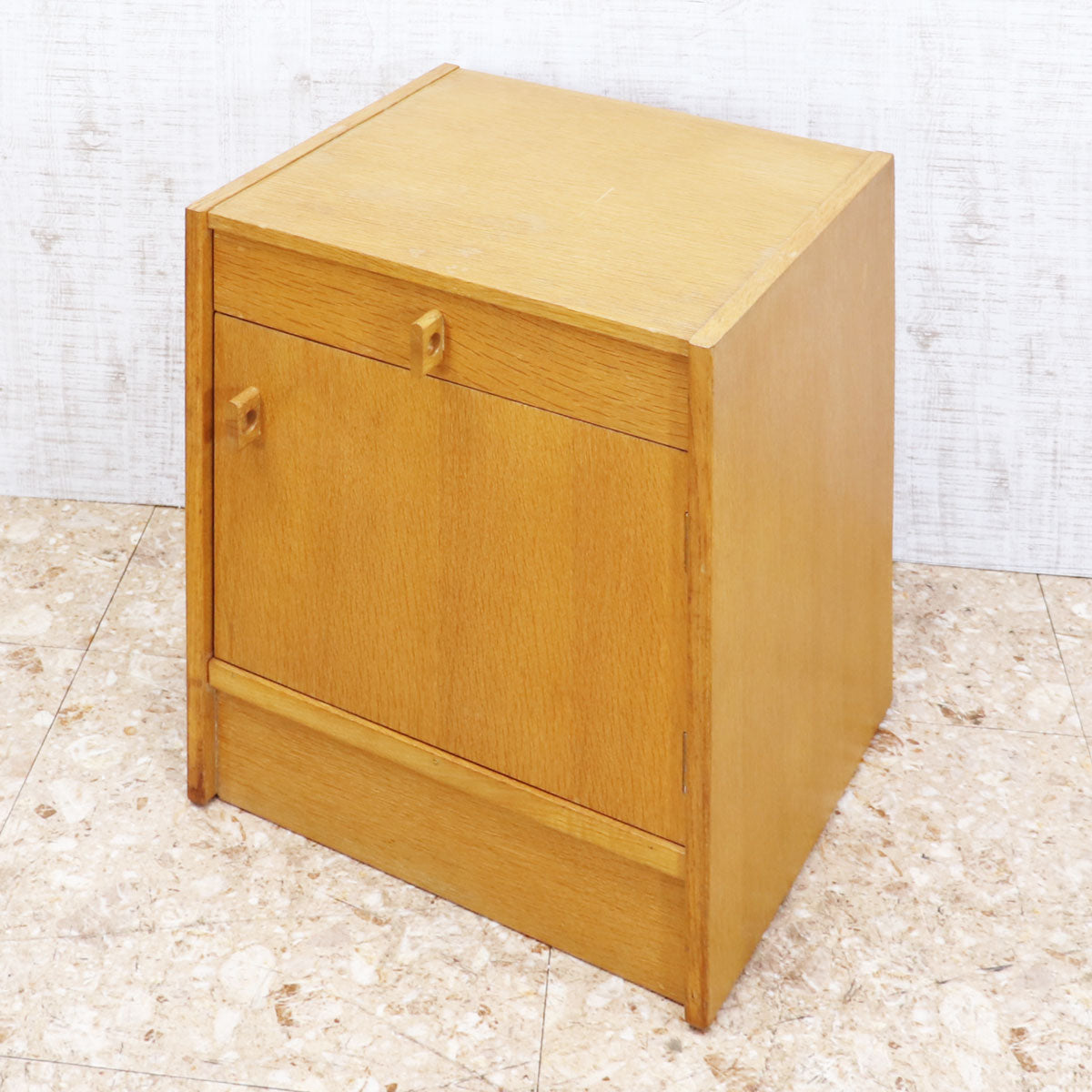 ナチュラルなオーク材の美しい木目が魅力で、引き出しと開き戸を備え、ちょっとした収納に便利な一台。