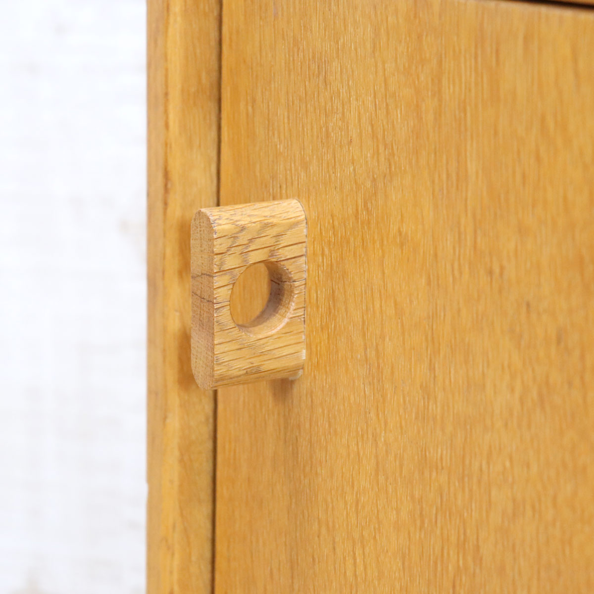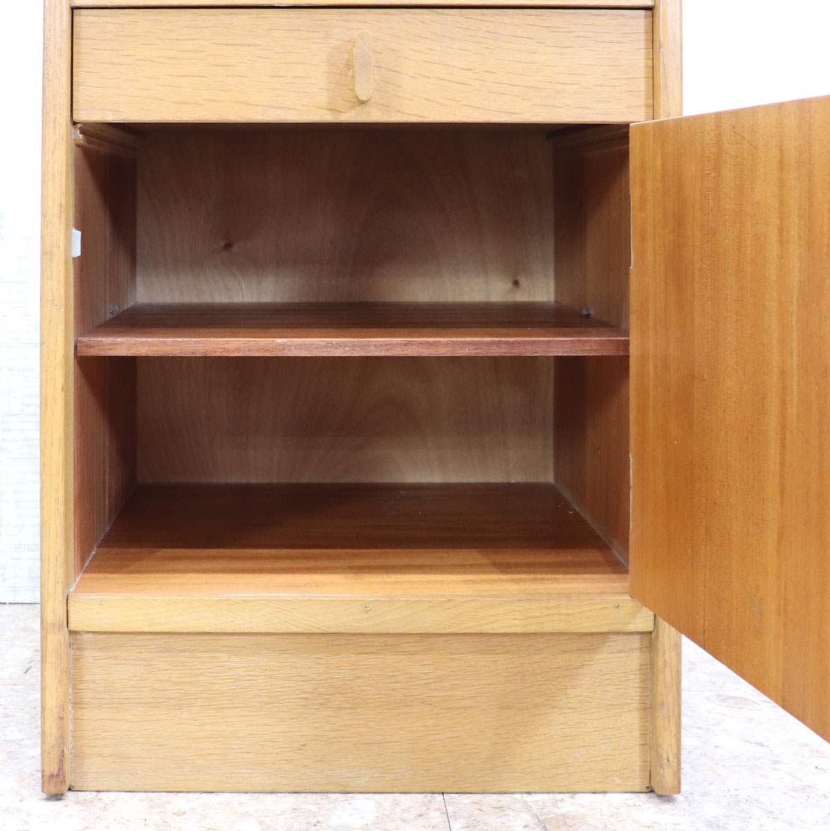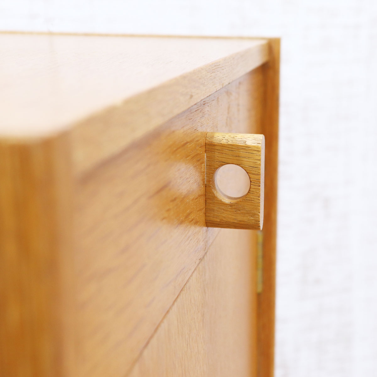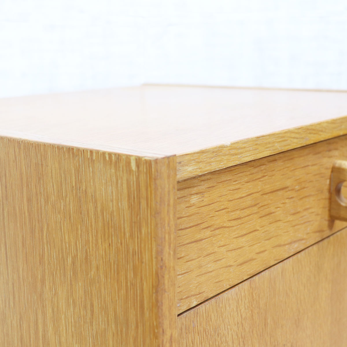 ナチュラルなオーク材の美しい木目が魅力で、引き出しと開き戸を備え、ちょっとした収納に便利な一台。