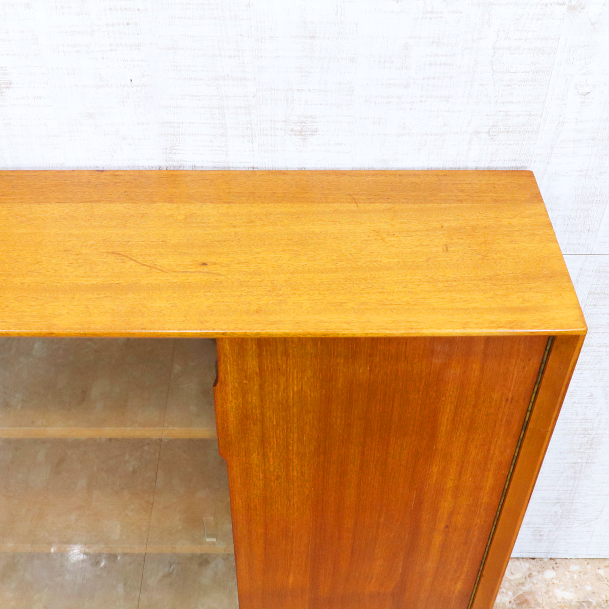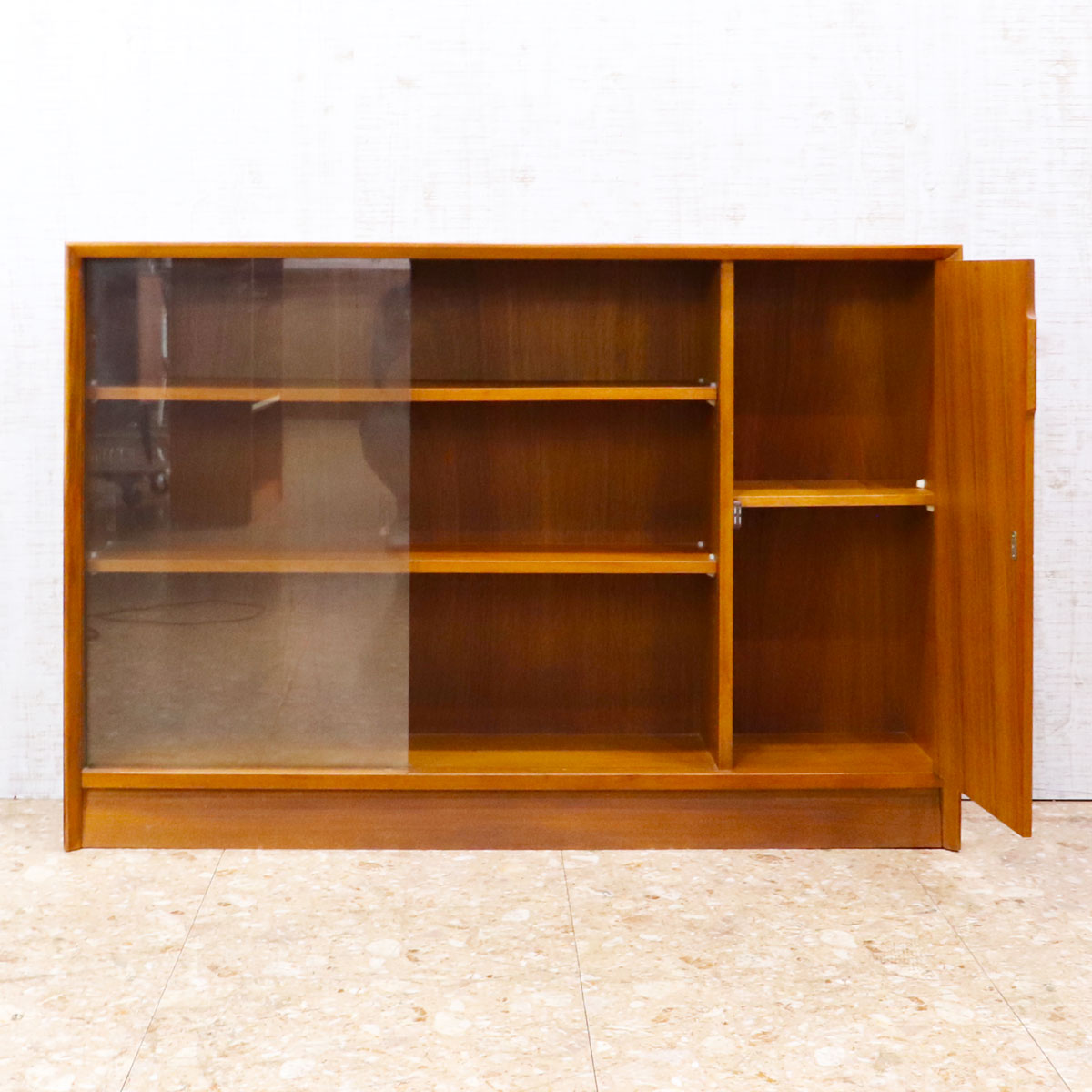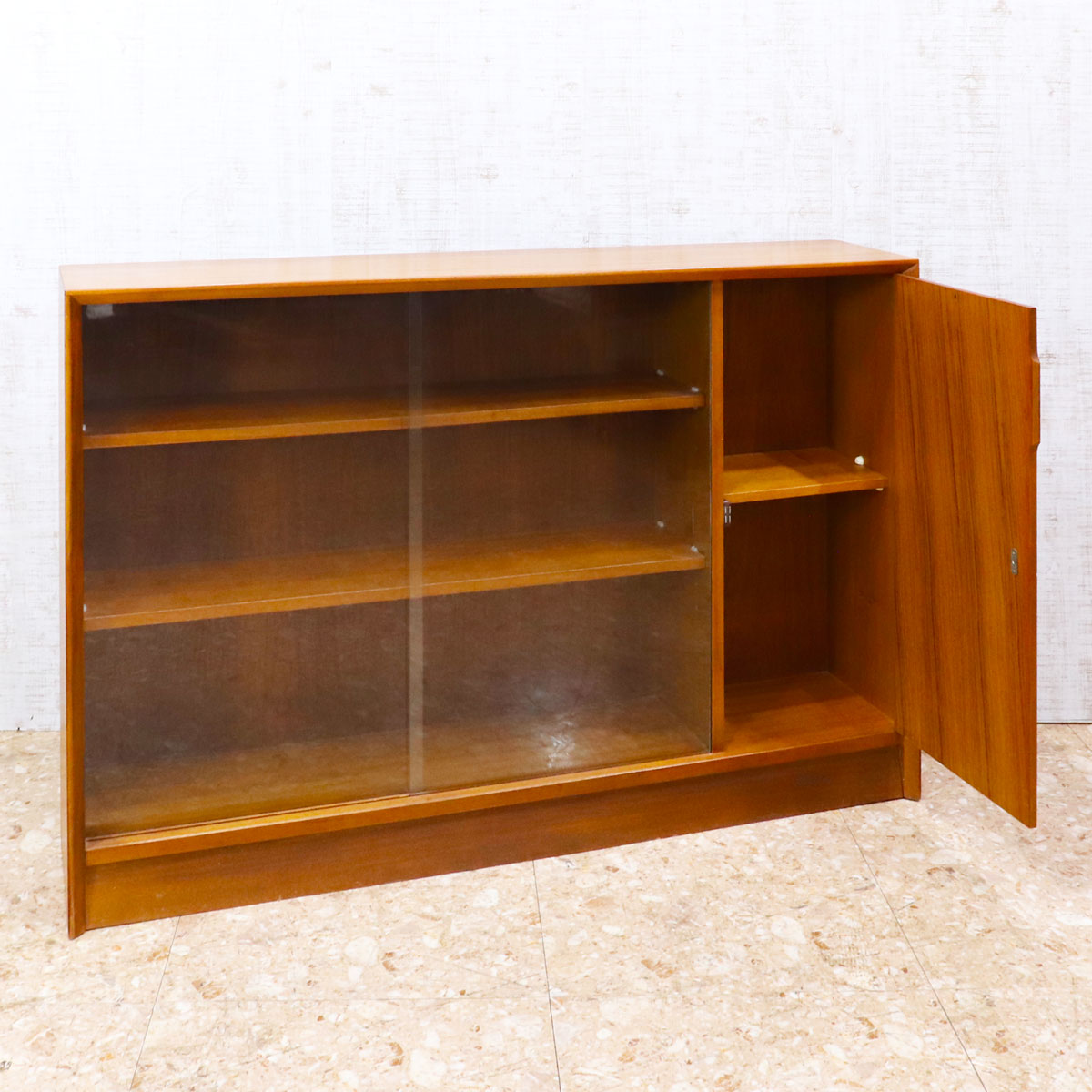直線的で無駄のないデザインと、美しいチーク材の木目が特徴。ガラスの引き戸は軽やかな印象を与えつつ、内部の収納物を埃から守ります。