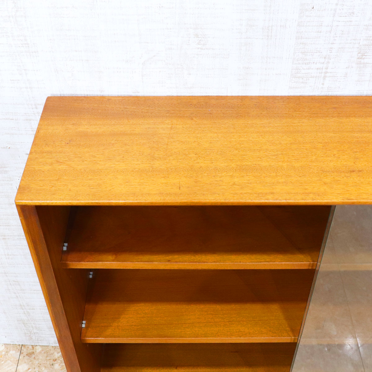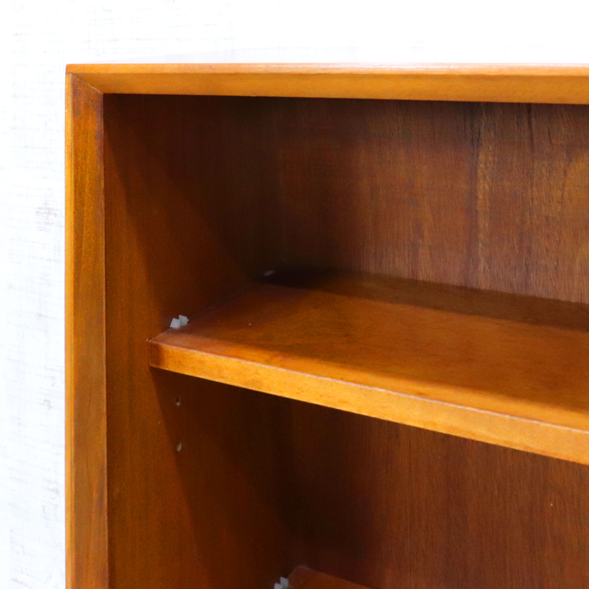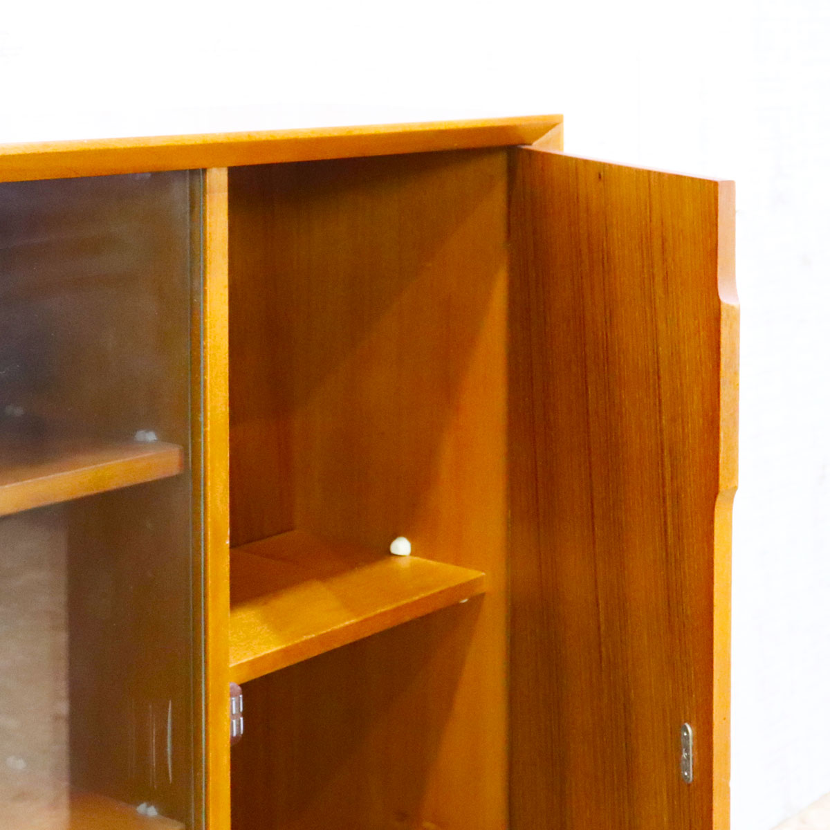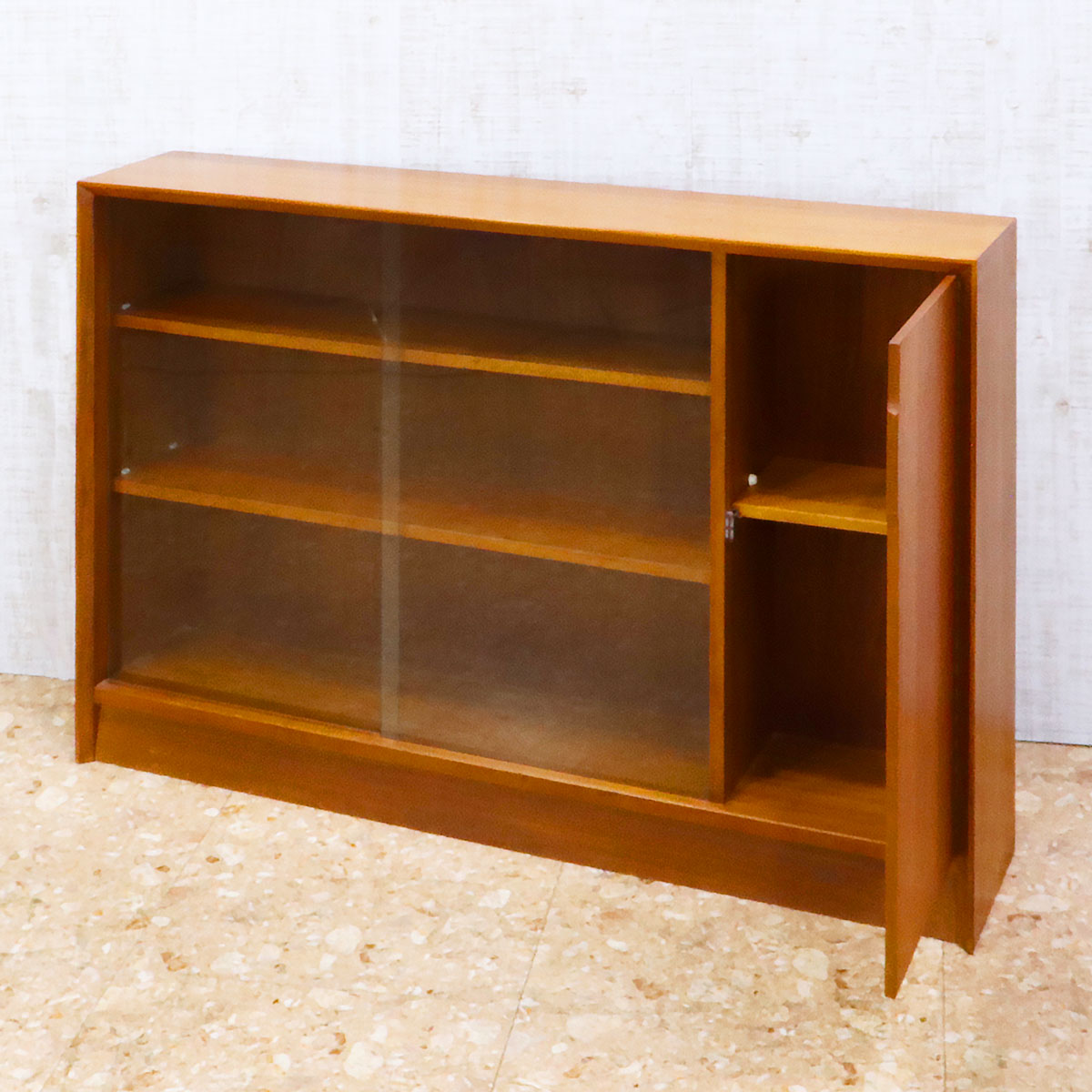 直線的で無駄のないデザインと、美しいチーク材の木目が特徴。ガラスの引き戸は軽やかな印象を与えつつ、内部の収納物を埃から守ります。