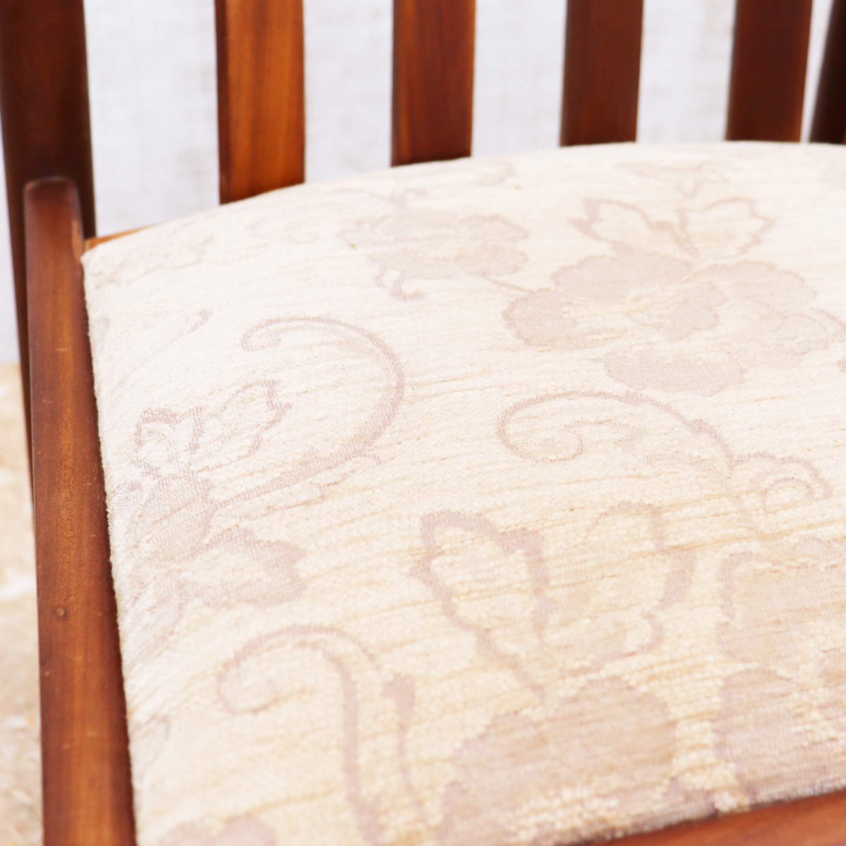 フレームには温かみのある木肌が活きており、長い年月を経たヴィンテージならではの深みのある風合いを楽しめます。座面には希少なオリジナルファブリックを使用しており、当時の雰囲気をそのままに残したコレクタブルなポイントも魅力です。