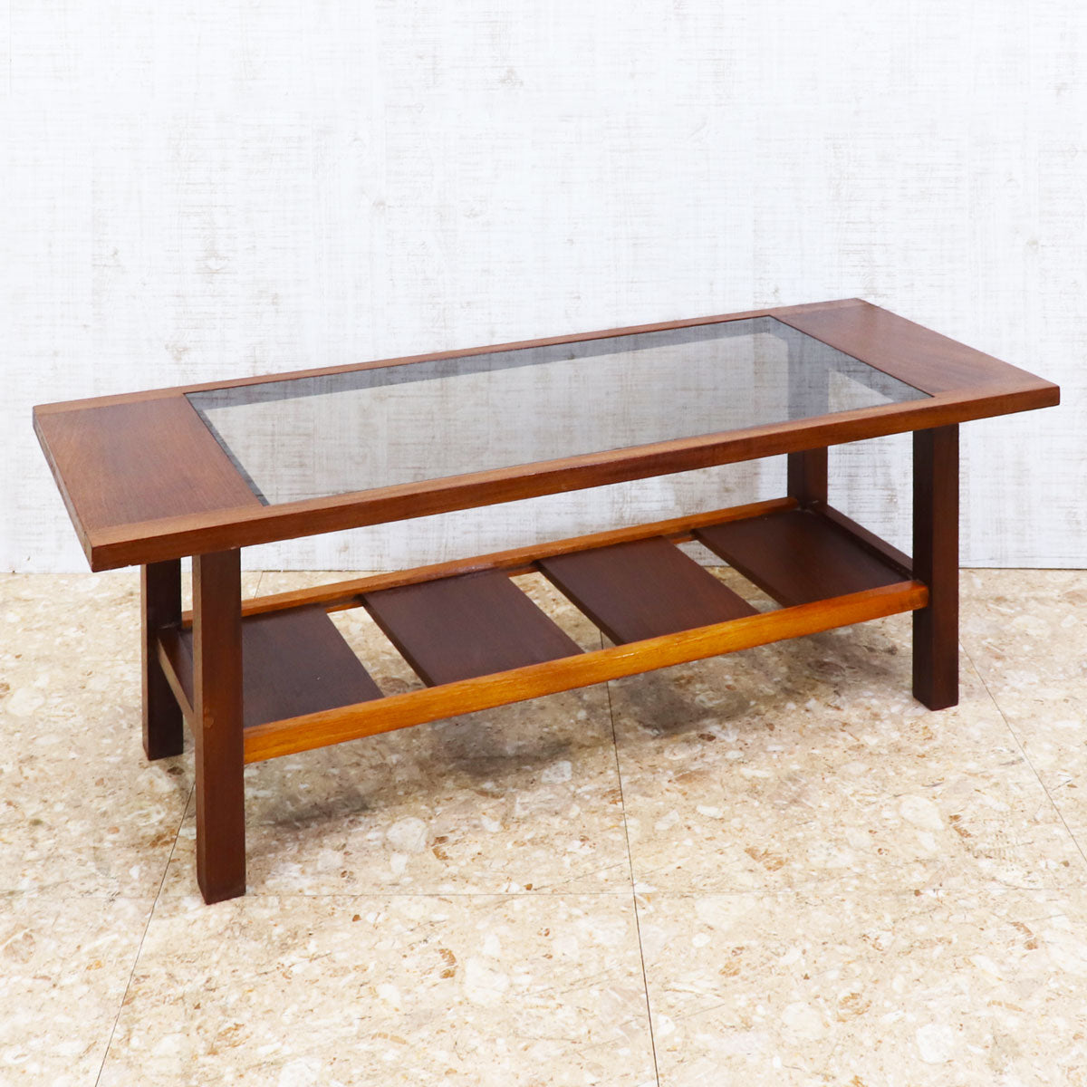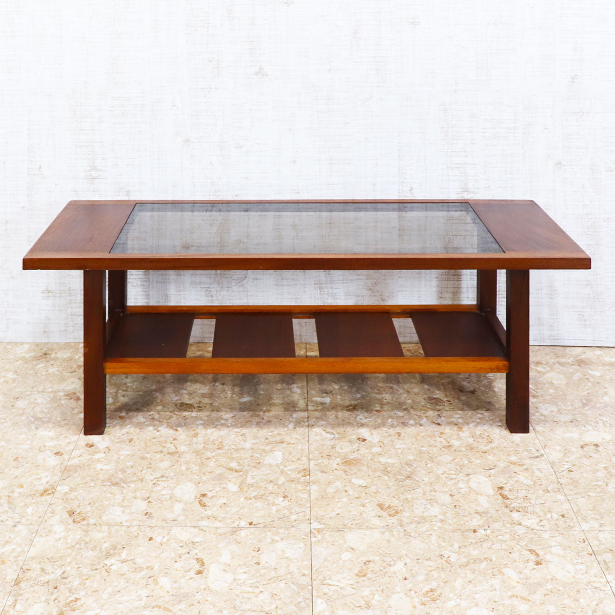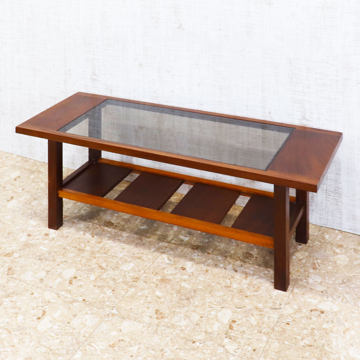 イギリス製ヴィンテージのガラストップ コーヒーテーブルです。1960~70年代頃に製造されたとみられる一台で、チーク材フレームとガラス天板の組み合わせが軽やかで洗練された印象を与えます。