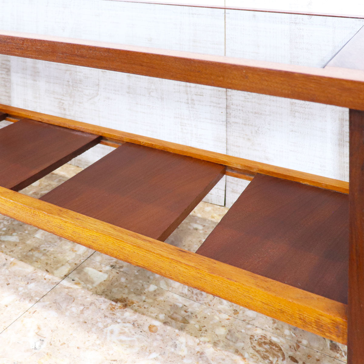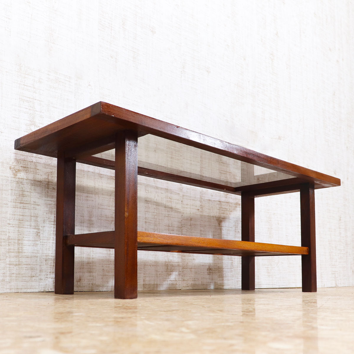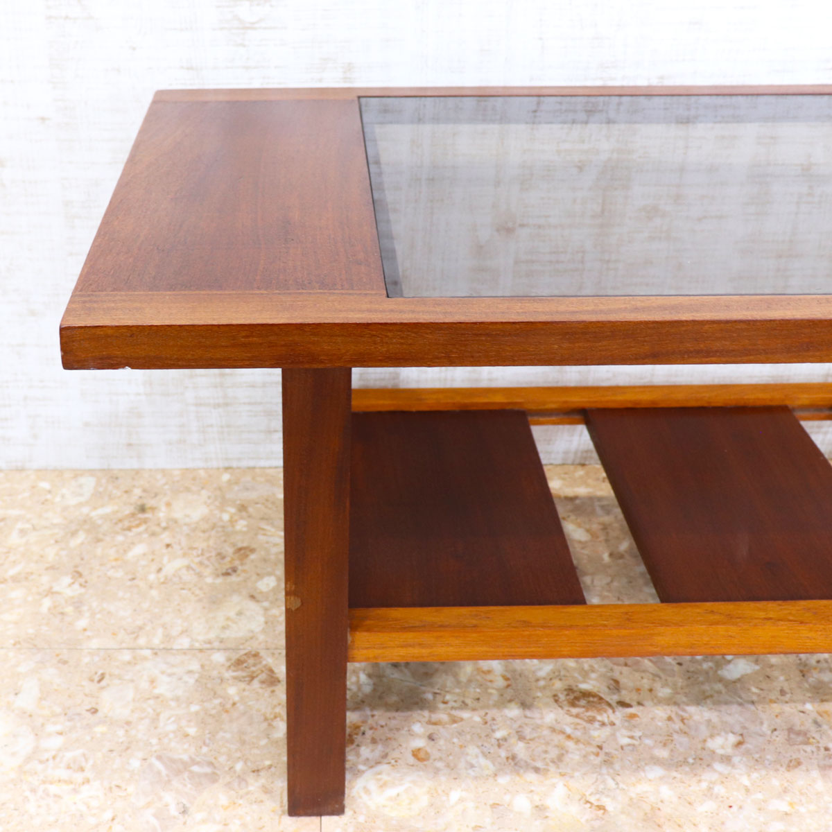 イギリス製ヴィンテージのガラストップ コーヒーテーブルです。1960~70年代頃に製造されたとみられる一台で、チーク材フレームとガラス天板の組み合わせが軽やかで洗練された印象を与えます。