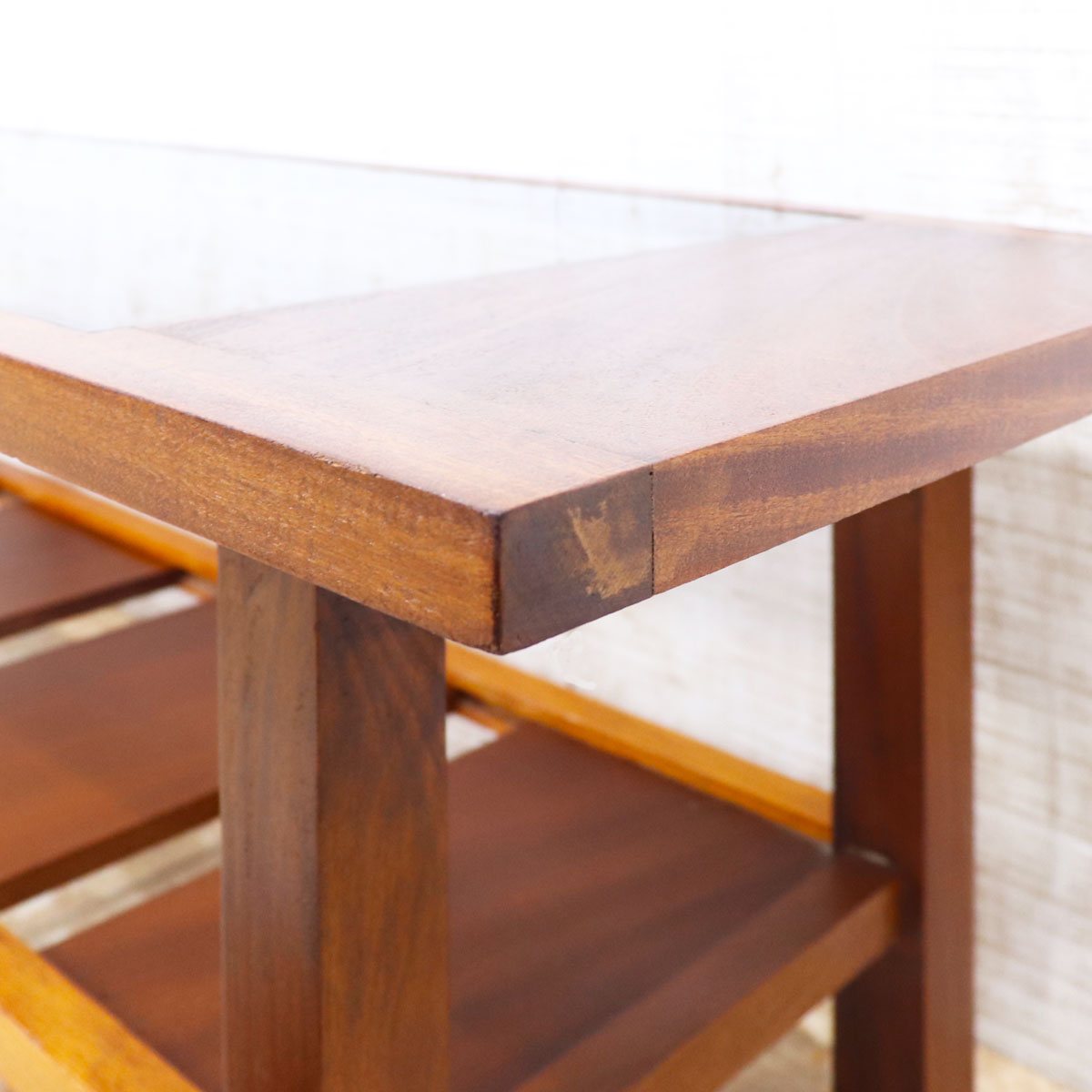 天板下にはマガジンラックとして活用できる棚が備わり、収納性と実用性も兼ね備えています。直線的でシンプルなフォルムはミッドセンチュリーらしい落ち着きを感じさせ、現代のインテリアにも自然に調和。リビングのセンターテーブルとして空間を引き立てます。