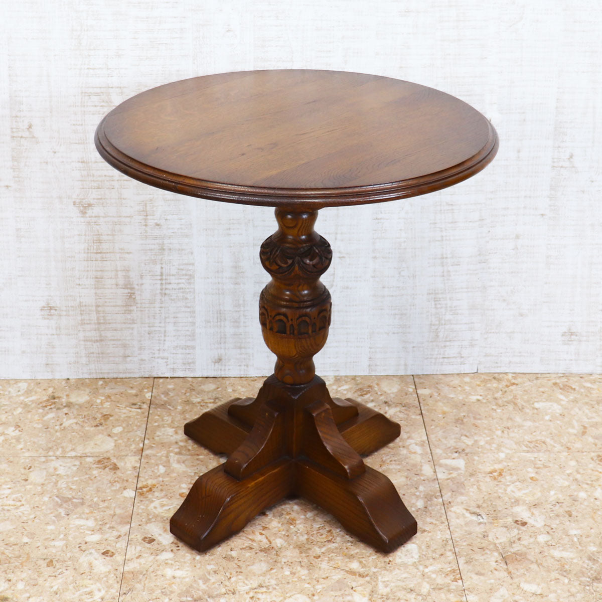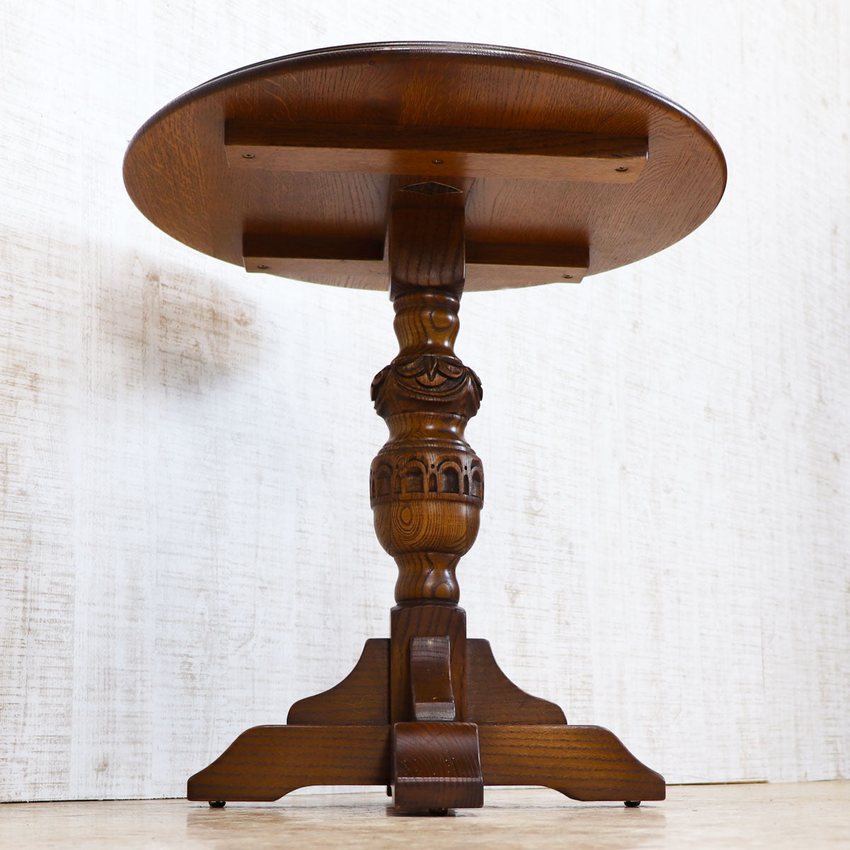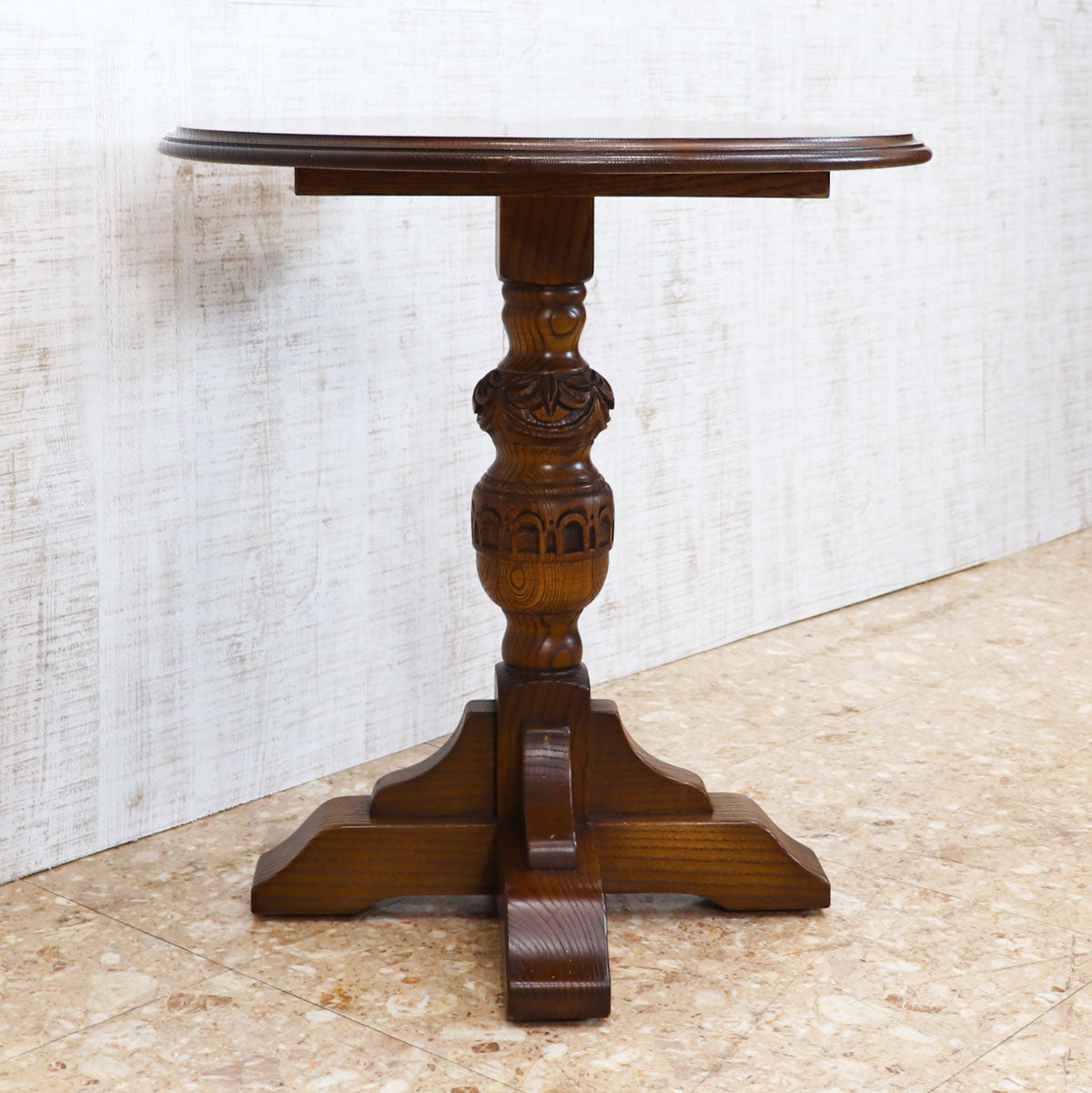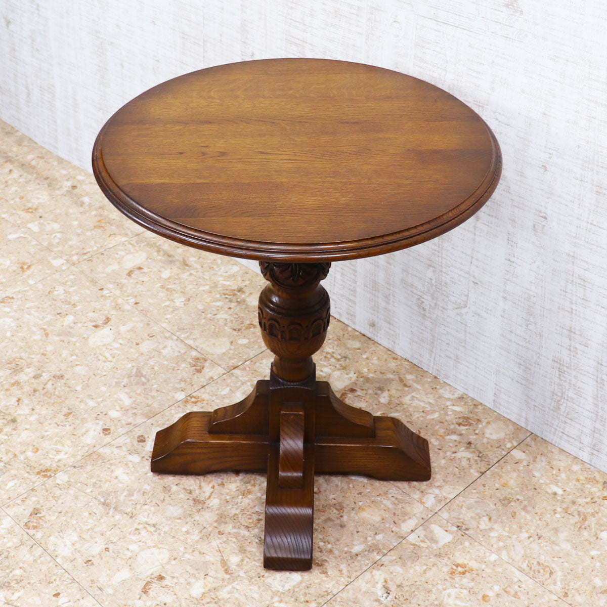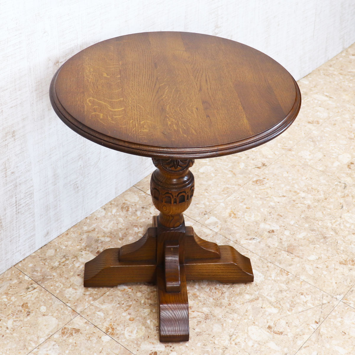 伝統的なオーク材を用いた重厚感ある佇まいと、手仕事を感じさせる彫刻が魅力の一台。丸型の天板はコンパクトながら存在感があり、ティーテーブルやサイドテーブルとしてお使いいただけます。安定感のある脚部デザインがクラシカルな雰囲気を醸し出し、アンティークやクラシックスタイルのインテリアと相性抜群です。