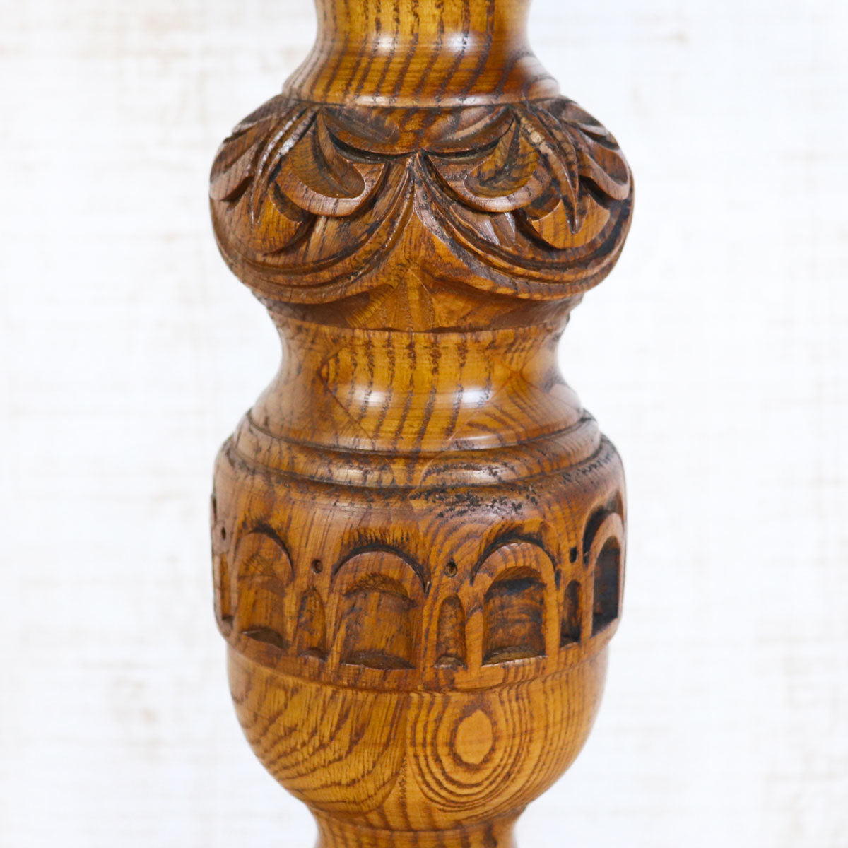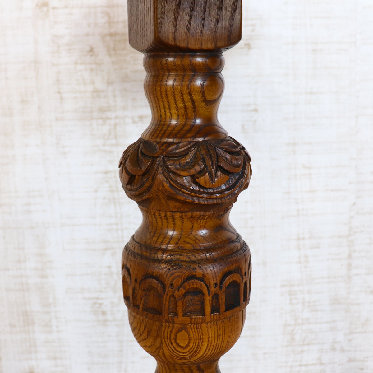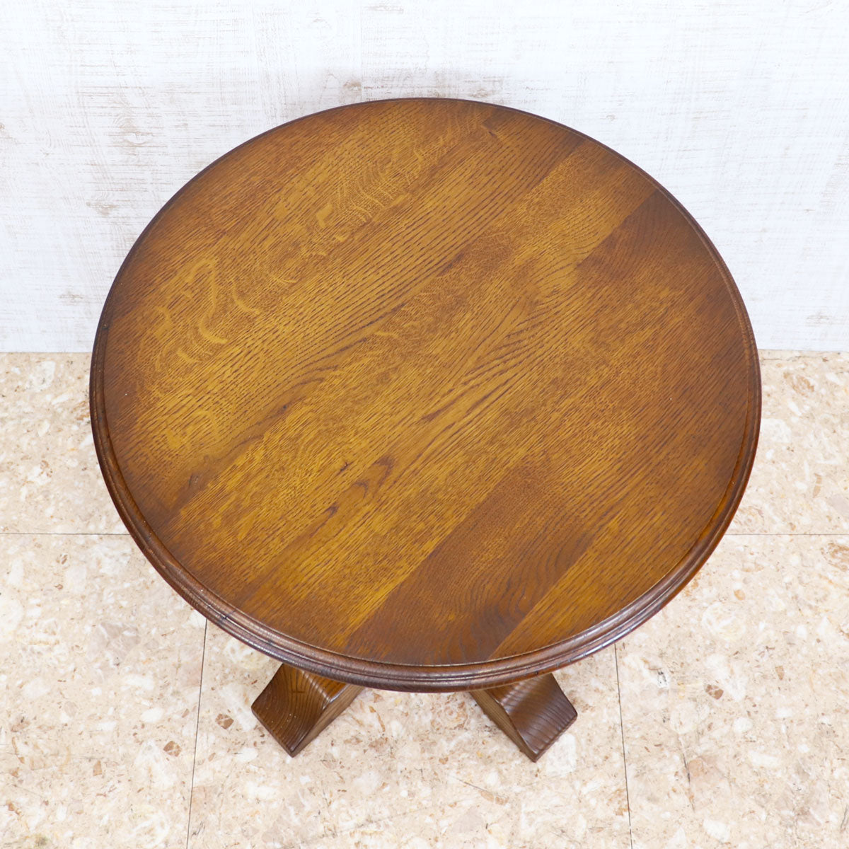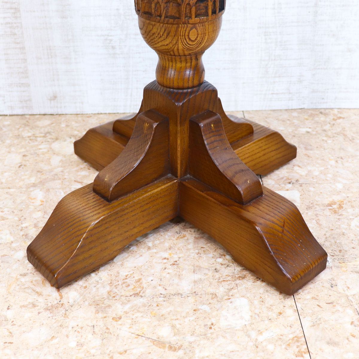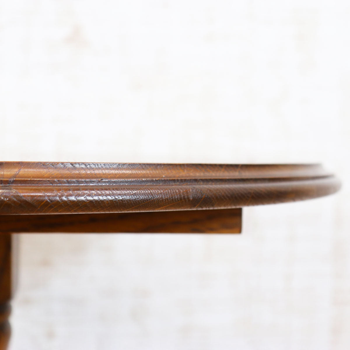 伝統的なオーク材を用いた重厚感ある佇まいと、手仕事を感じさせる彫刻が魅力の一台。丸型の天板はコンパクトながら存在感があり、ティーテーブルやサイドテーブルとしてお使いいただけます。安定感のある脚部デザインがクラシカルな雰囲気を醸し出し、アンティークやクラシックスタイルのインテリアと相性抜群です。