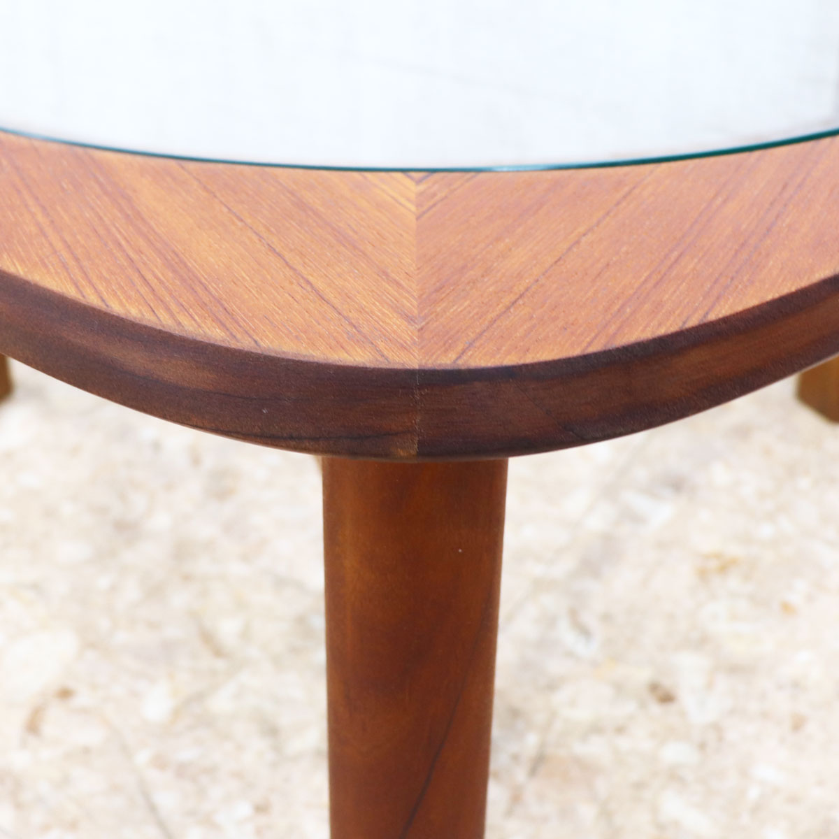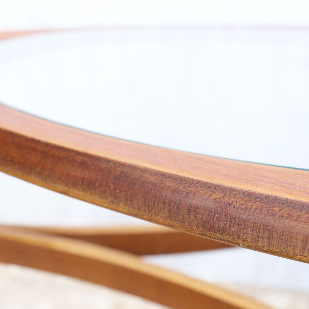 軽やかなガラスとチーク材の温もりを組み合わせたデザインは、空間に自然な抜け感をもたらします。丸みを帯びた三角形のフォルムは、配置の自由度が高く、ソファ前はもちろん、ラウンジチェアの間に置いても心地よいバランスを演出。光を取り込みやすいガラストップが、リビングをより開放的に見せてくれます。