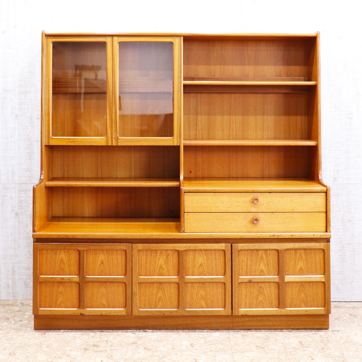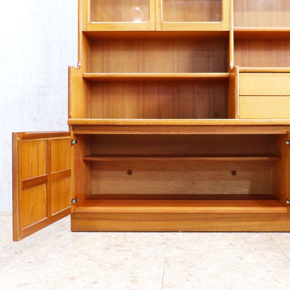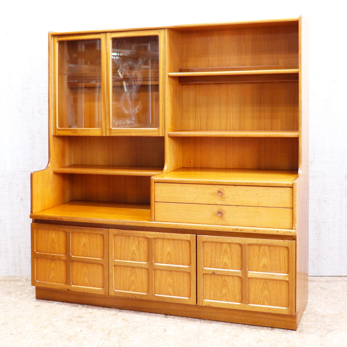 上段はガラス扉付きのシェルフやオープン棚を備え、食器やコレクションをディスプレイ可能。引き出しや下段の木製扉収納も備えており、実用性も抜群です。