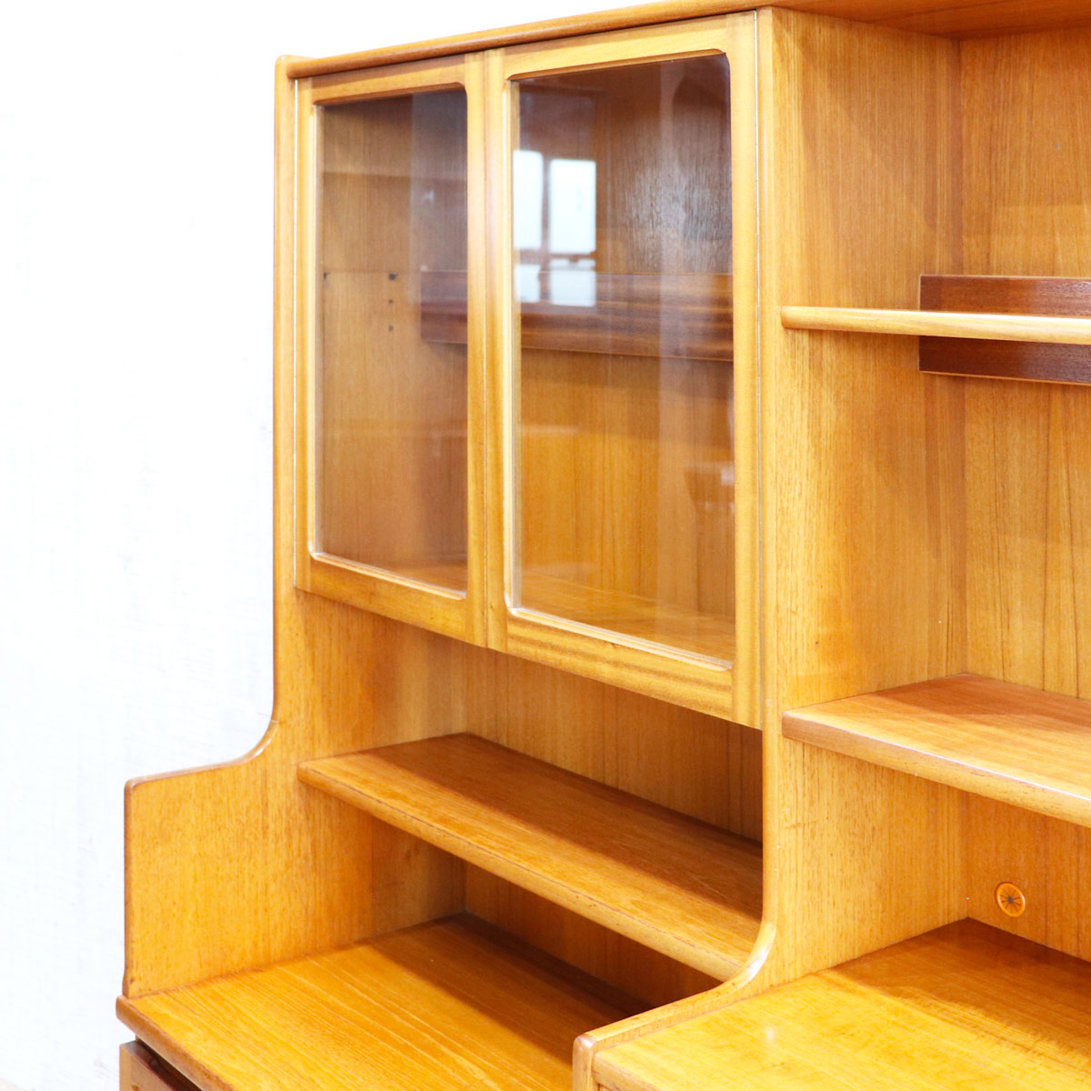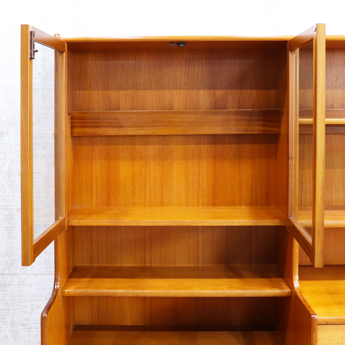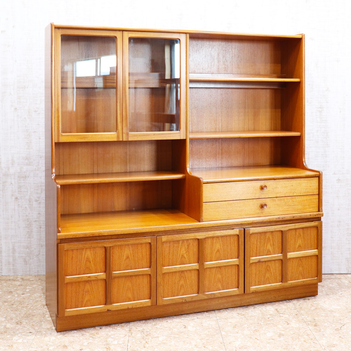 上段はガラス扉付きのシェルフやオープン棚を備え、食器やコレクションをディスプレイ可能。引き出しや下段の木製扉収納も備えており、実用性も抜群です。