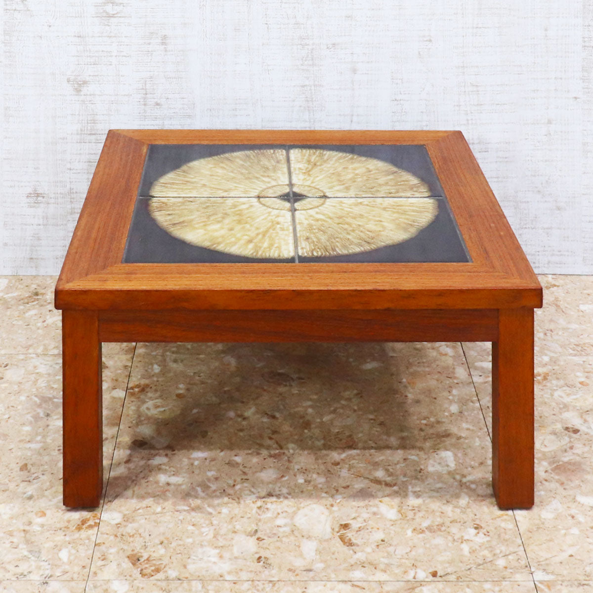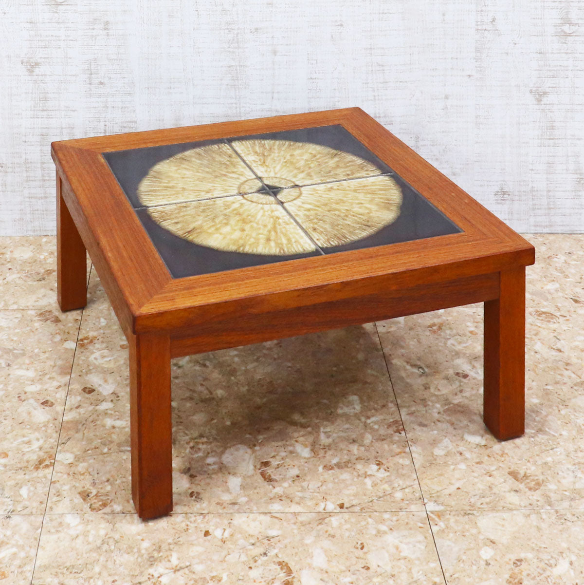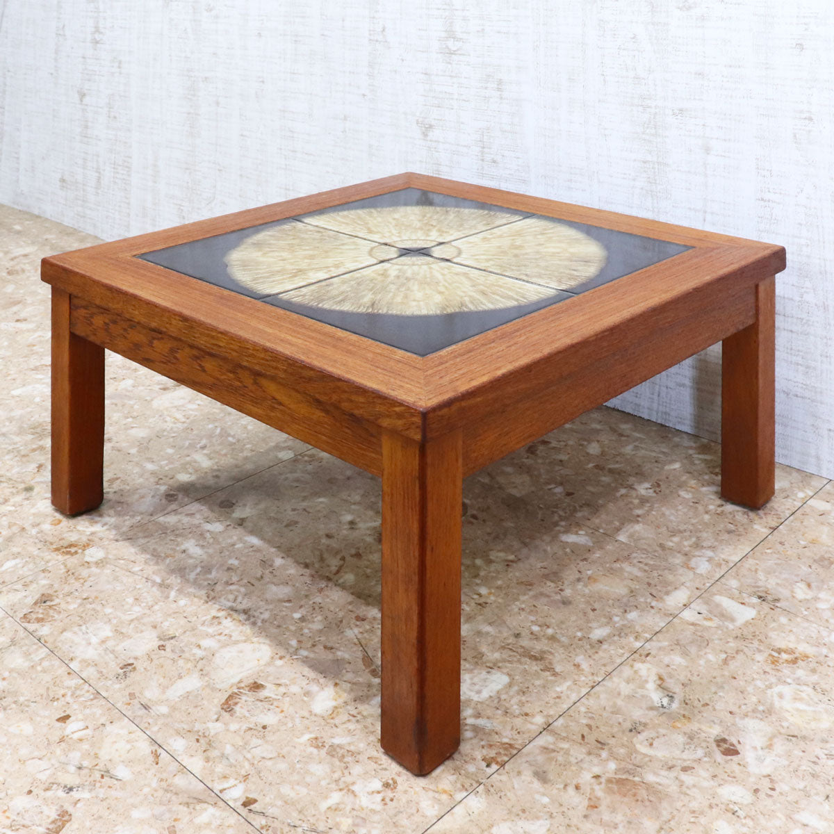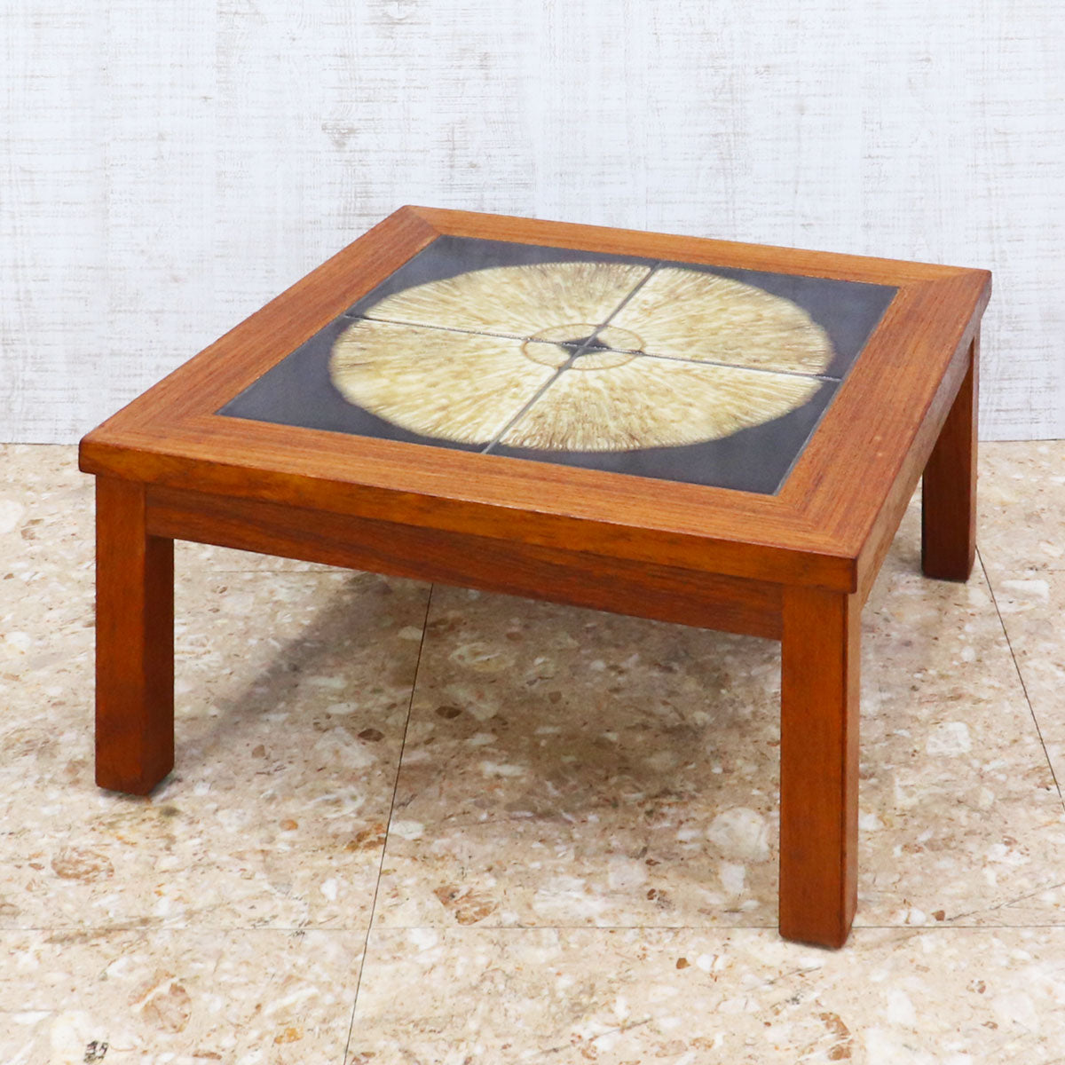 チーク材の温かみあるフレームと、トップにあしらわれた印象的なタイル装飾が特徴の一台です。タイルは大胆な円形モチーフで構成され、落ち着きの中にもアート性を感じさせるデザイン。北欧家具ならではのシンプルで機能的なフォルムに、クラフトマンシップが宿っています。