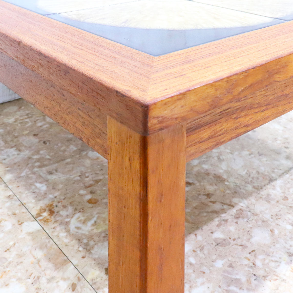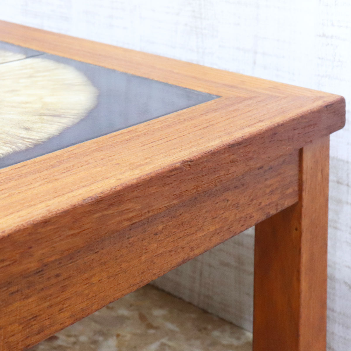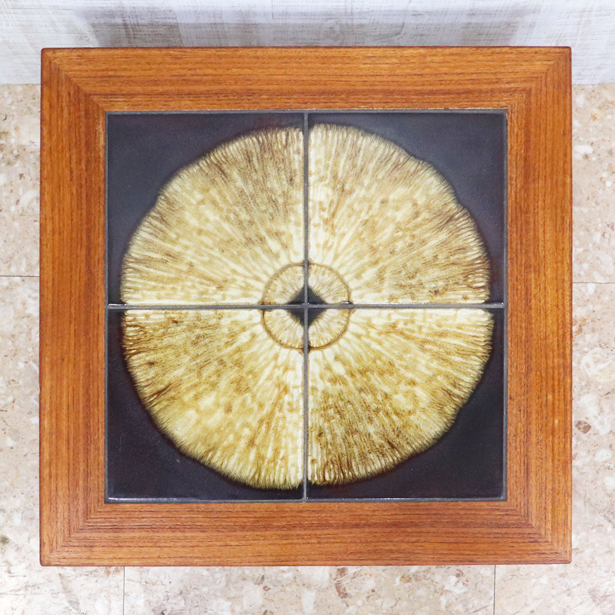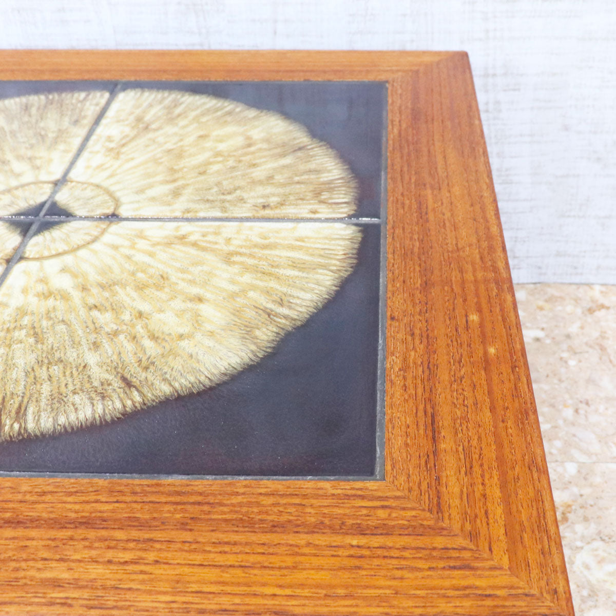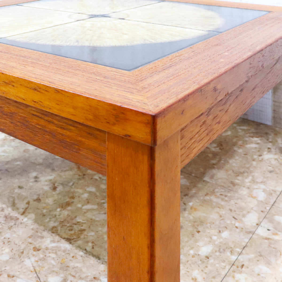 チーク材の温かみあるフレームと、トップにあしらわれた印象的なタイル装飾が特徴の一台です。タイルは大胆な円形モチーフで構成され、落ち着きの中にもアート性を感じさせるデザイン。北欧家具ならではのシンプルで機能的なフォルムに、クラフトマンシップが宿っています。