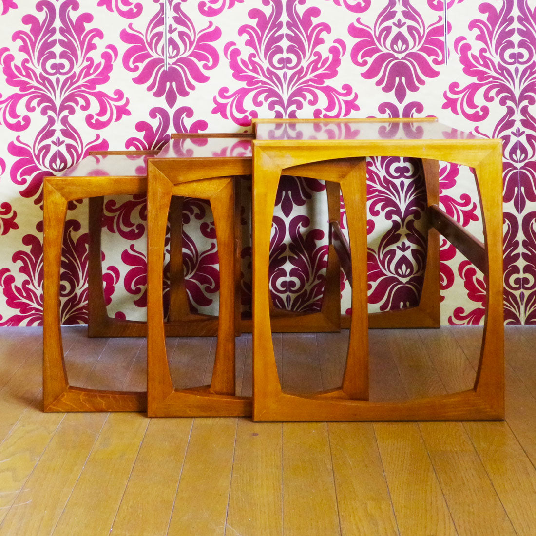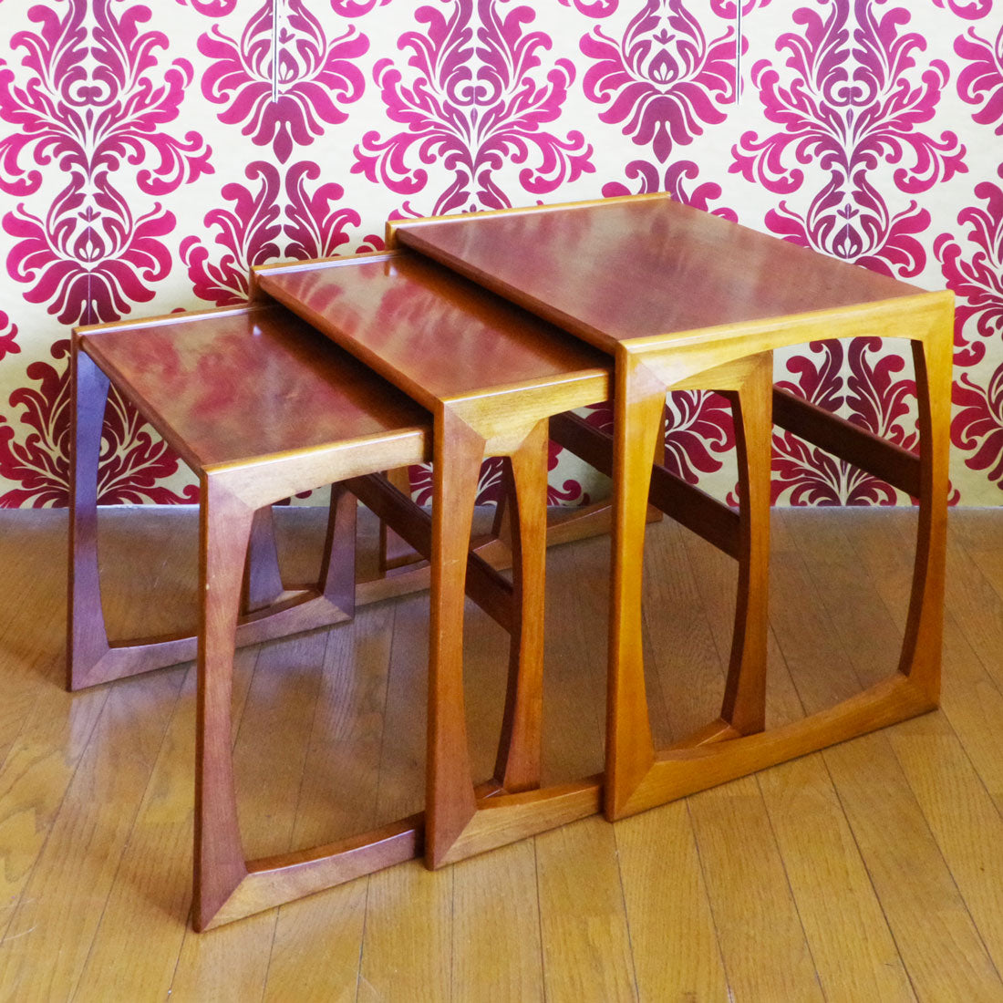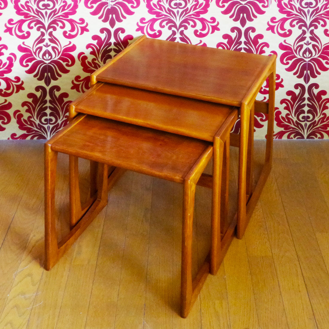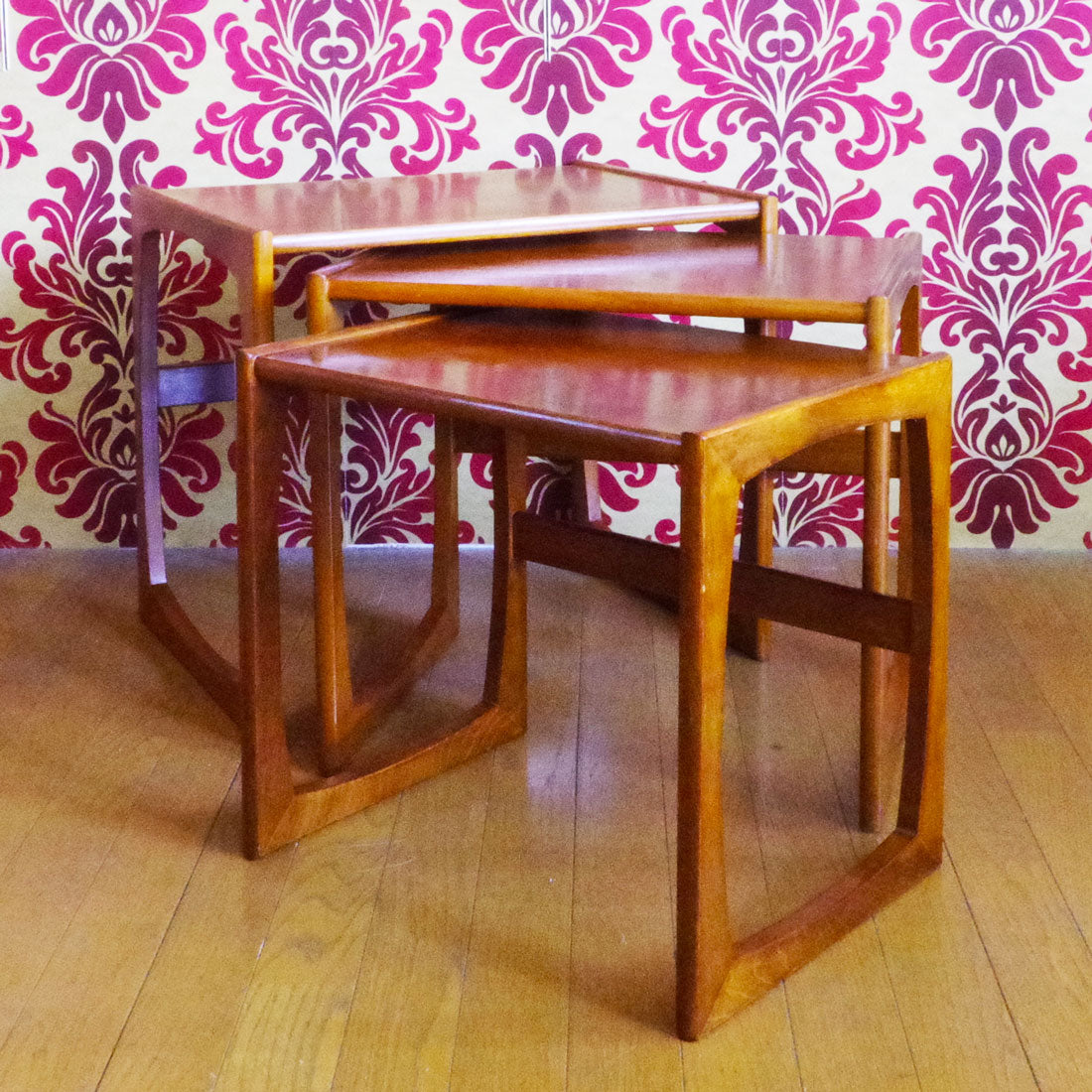 英国ミッドセンチュリー家具の象徴、G-PLAN(ジープラン)によるQUADRILLEシリーズのヴィンテージ・ネストテーブル。チーク材のやわらかな色合いと、彫刻のような有機的な脚部デザインが特徴的です。