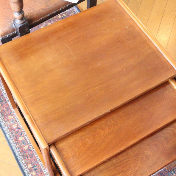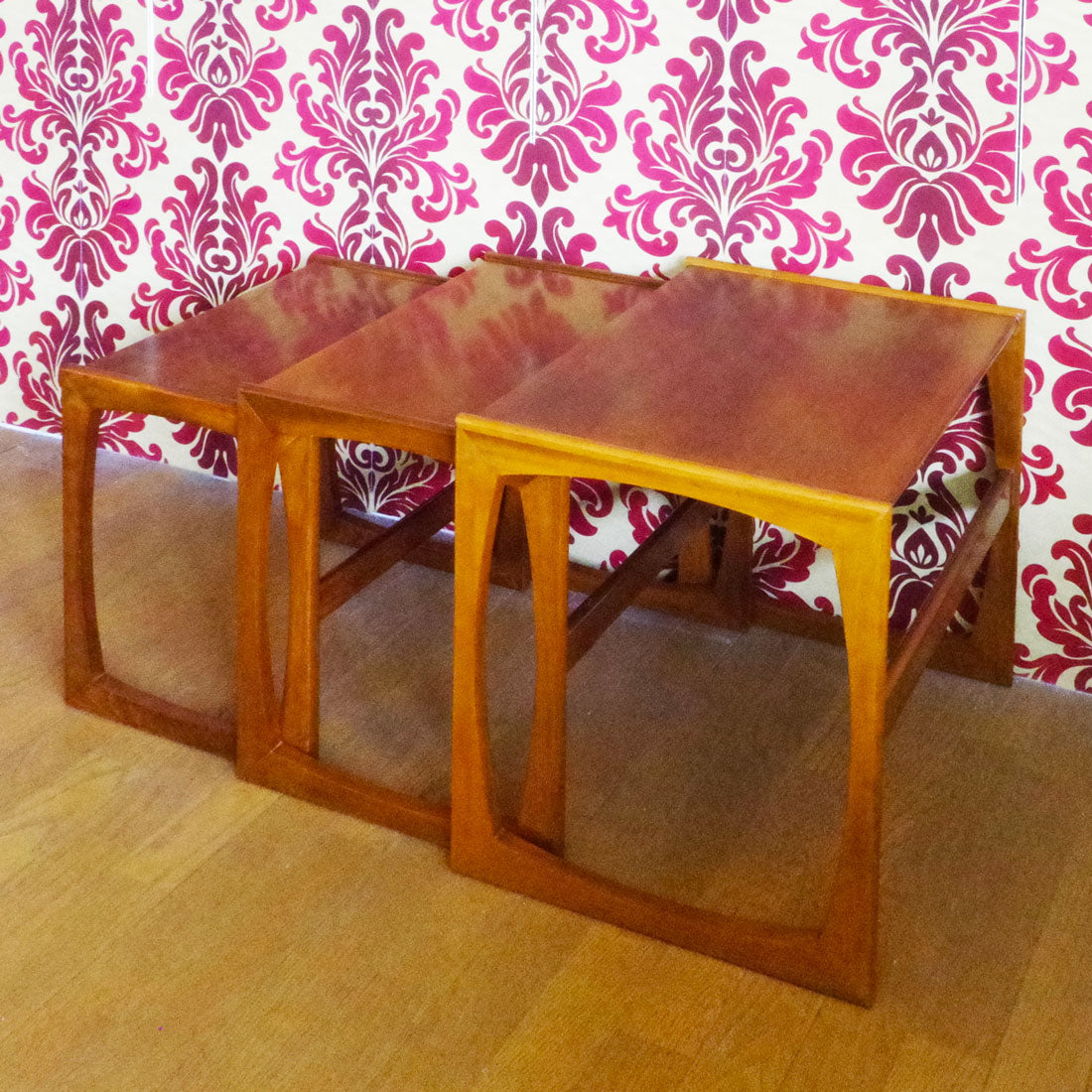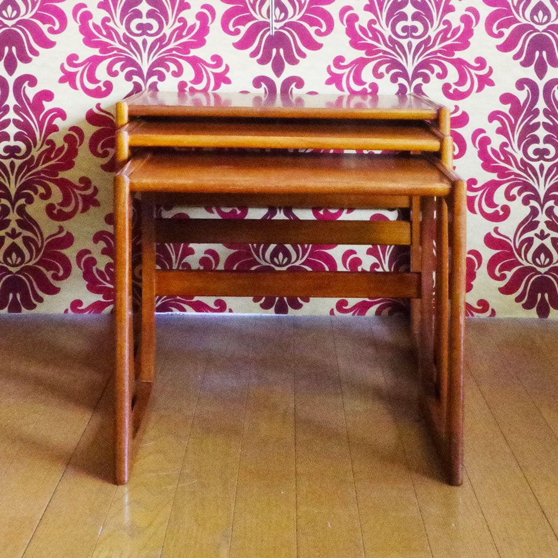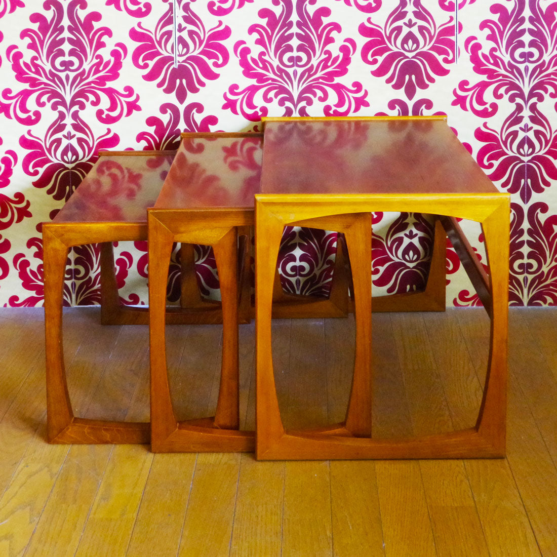 英国ミッドセンチュリー家具の象徴、G-PLAN(ジープラン)によるQUADRILLEシリーズのヴィンテージ・ネストテーブル。チーク材のやわらかな色合いと、彫刻のような有機的な脚部デザインが特徴的です。