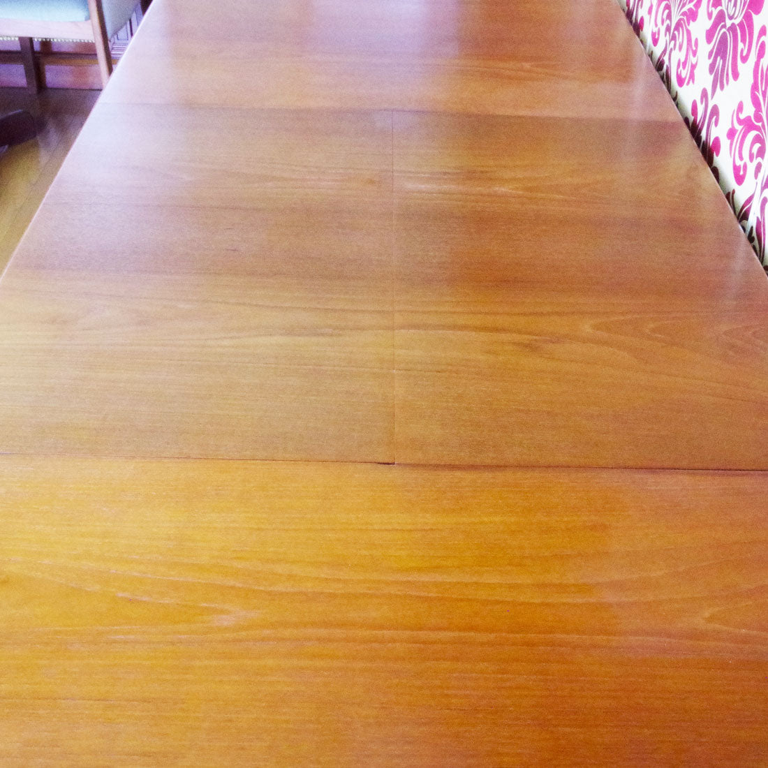 丸脚とすっきりとしたラインが特徴的なデザインで、チーク材の美しい木目と温かみのあるトーンが、空間に優しい印象を与えます。左右にスライド式のエクステンション(拡張天板)を備えており、来客時など必要に応じて広げることで、実用性と機能美を両立。