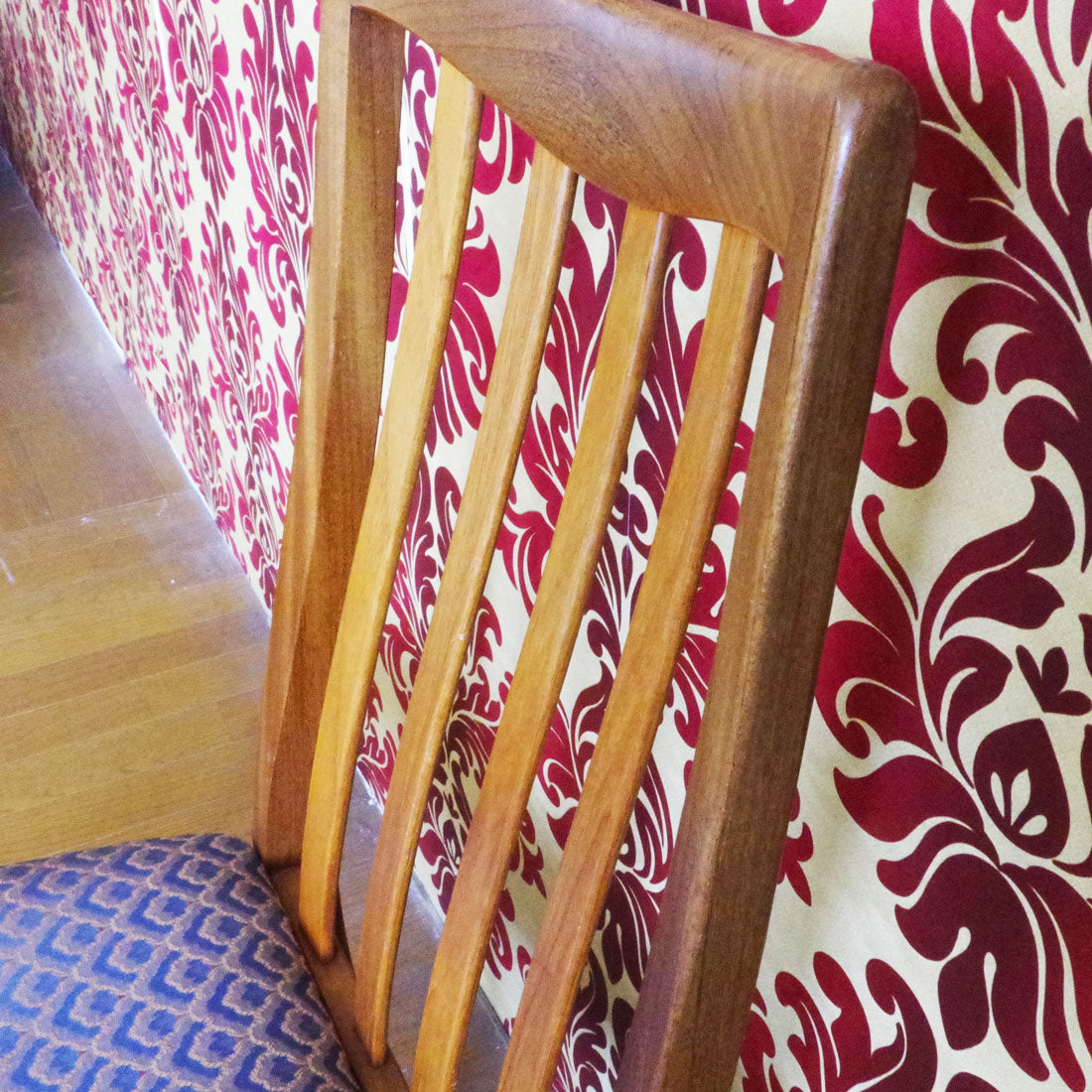 背もたれの繊細なスラット(縦桟)デザインは、シンプルでありながら温かみがあり、チーク材の美しい木目と相まって、空間に上品な存在感を与えます。
