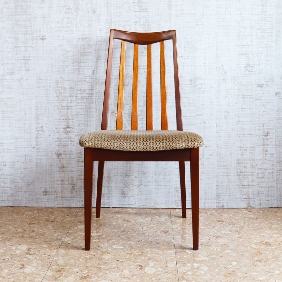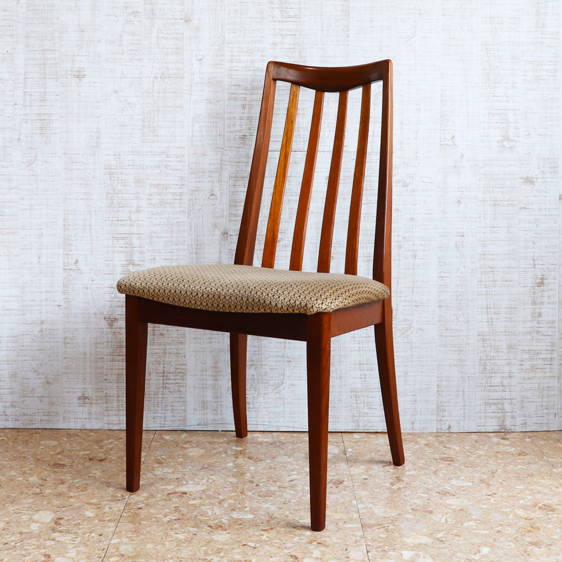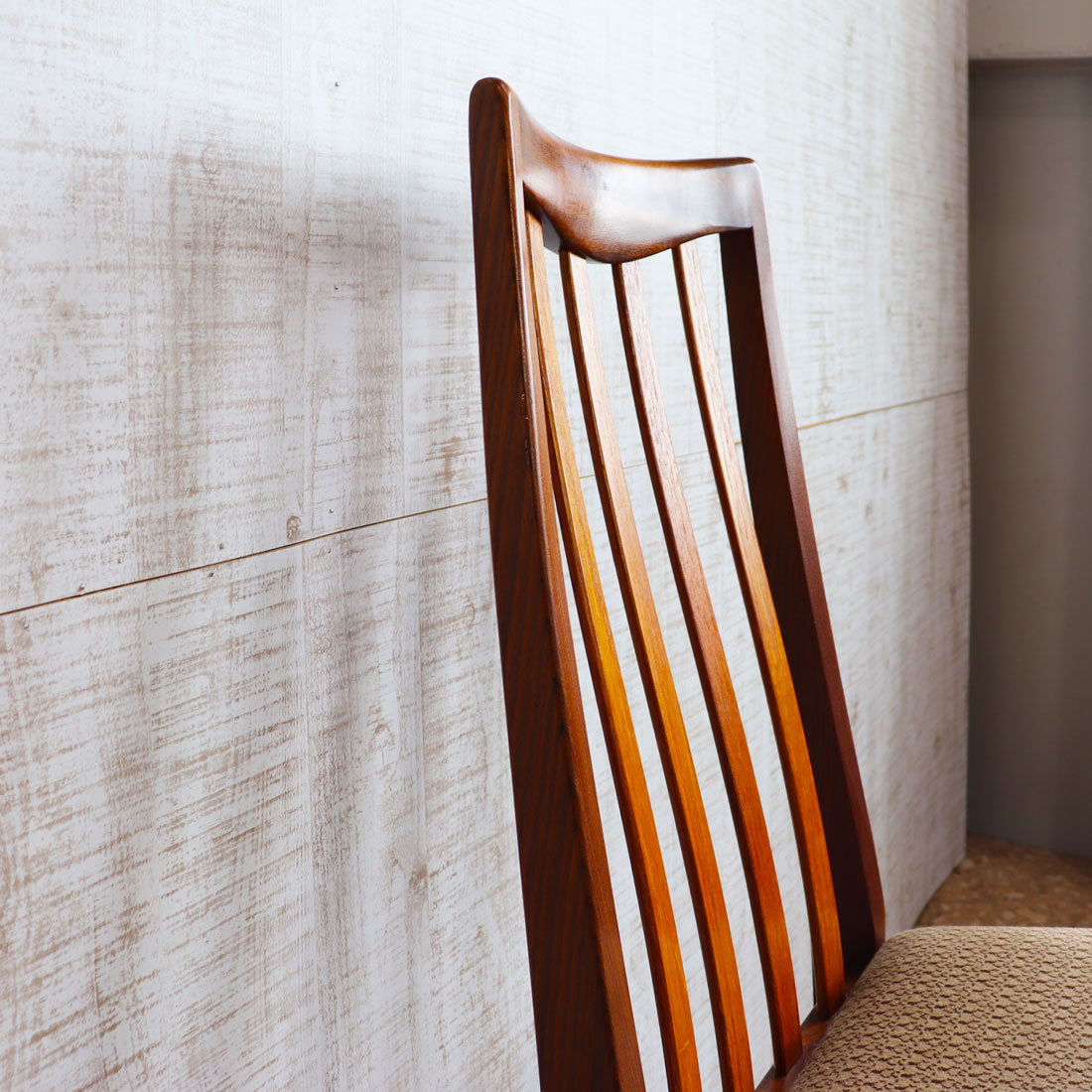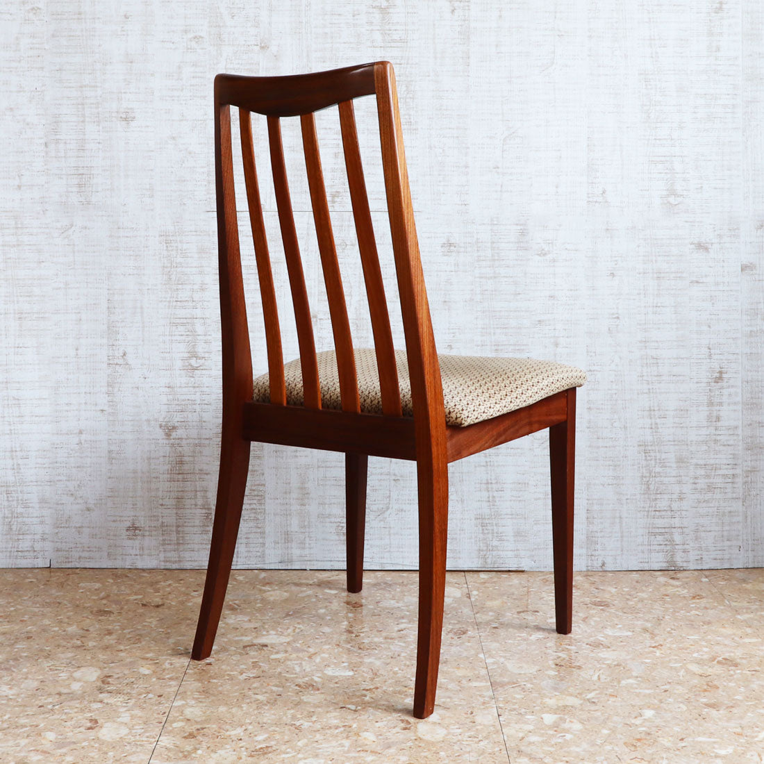 1960〜70年代の英国ミッドセンチュリーデザインを代表する、G-PLANの「Fresco(フレスコ)」シリーズのダイニングチェア。背もたれに緩やかなカーブを描くスラット(縦桟)を配し、軽やかでありながら視覚的な美しさと快適な背あたりを両立しています。
