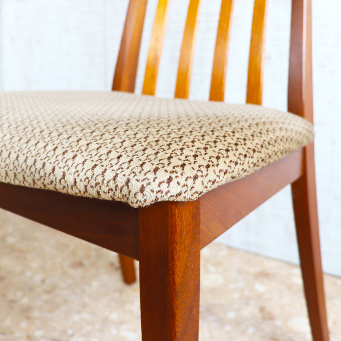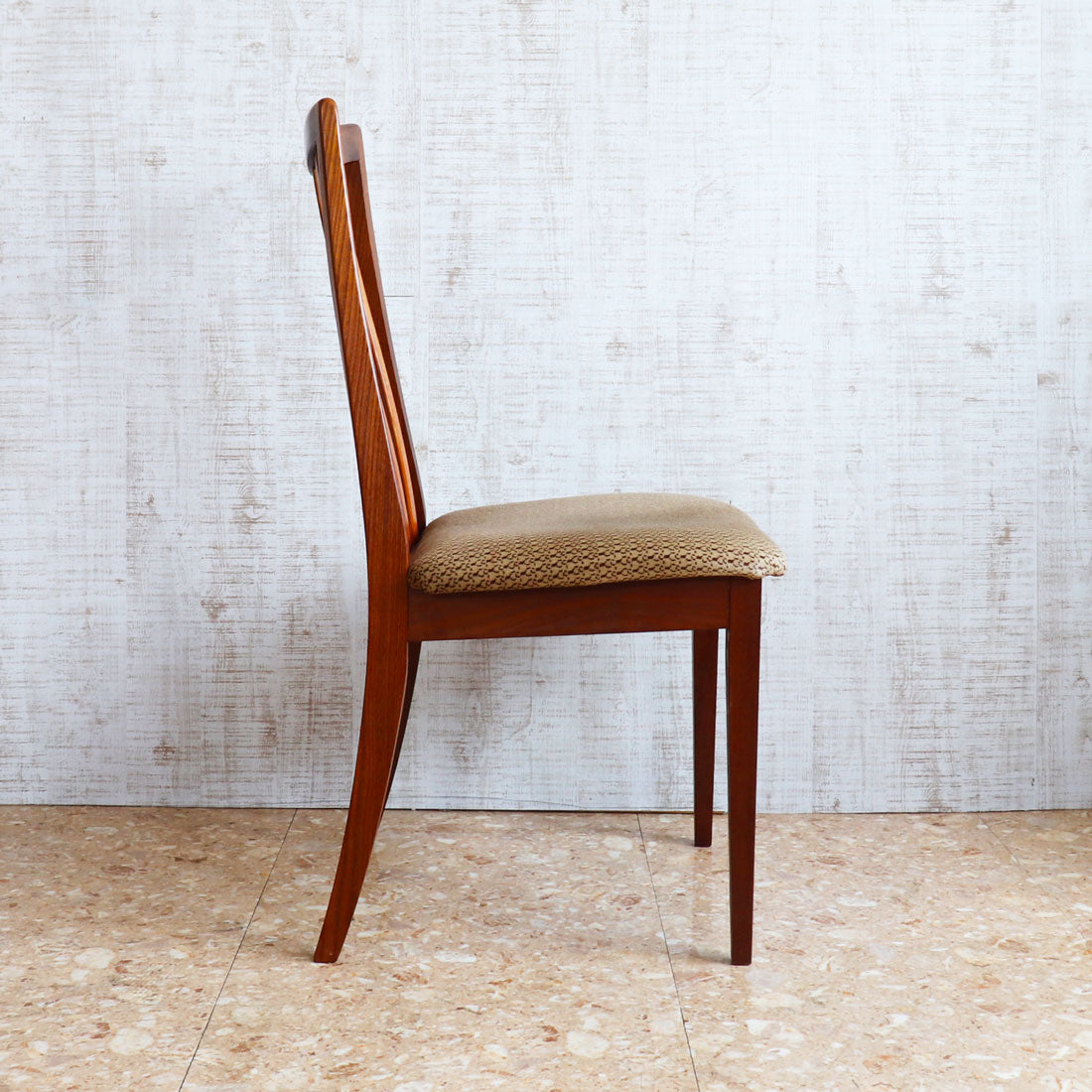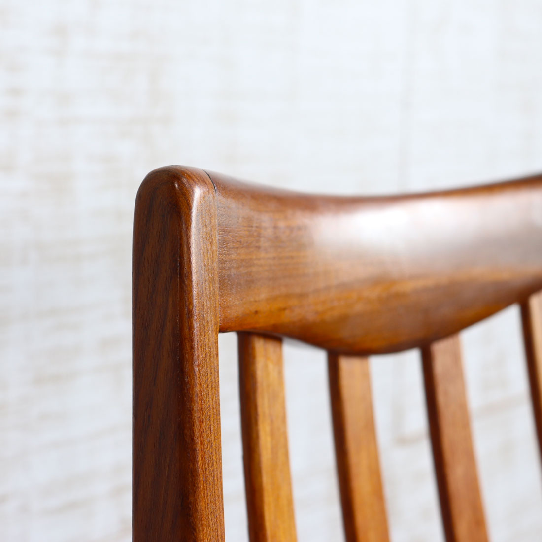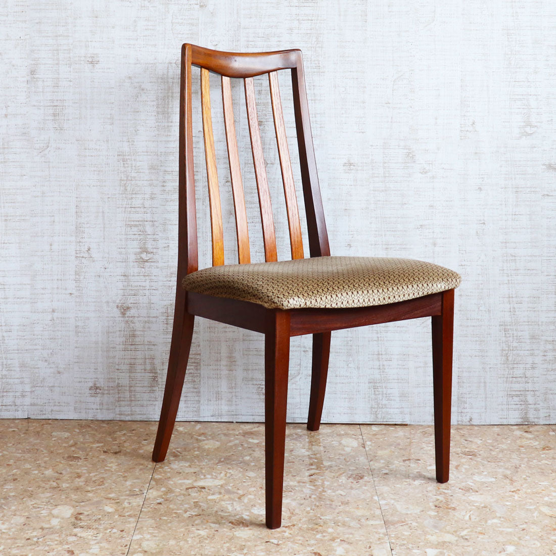 1960〜70年代の英国ミッドセンチュリーデザインを代表する、G-PLANの「Fresco(フレスコ)」シリーズのダイニングチェア。背もたれに緩やかなカーブを描くスラット(縦桟)を配し、軽やかでありながら視覚的な美しさと快適な背あたりを両立しています。