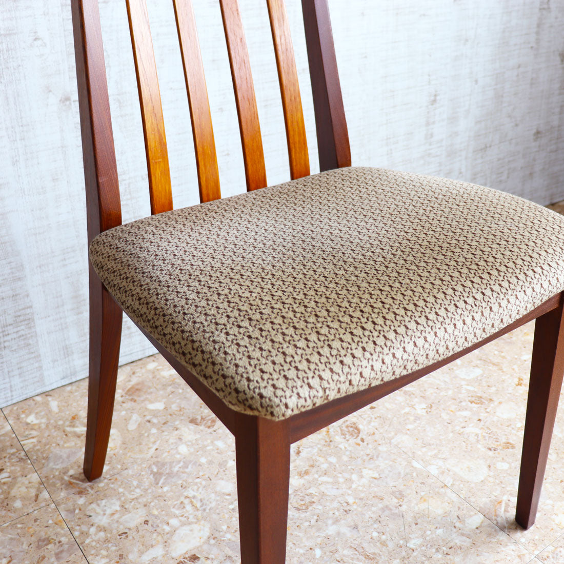 素材には艶やかなチーク材を使用し、温かみと深みのある木目が空間に上質な雰囲気をもたらします。座面にはブラウン系の幾何学模様ファブリック。柔らかなクッション性があり、日常使いにも快適な一脚です。