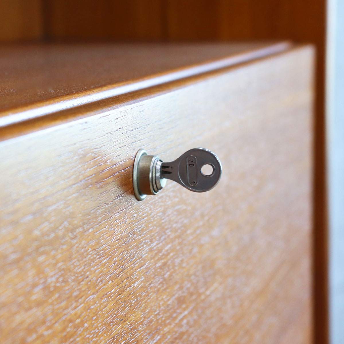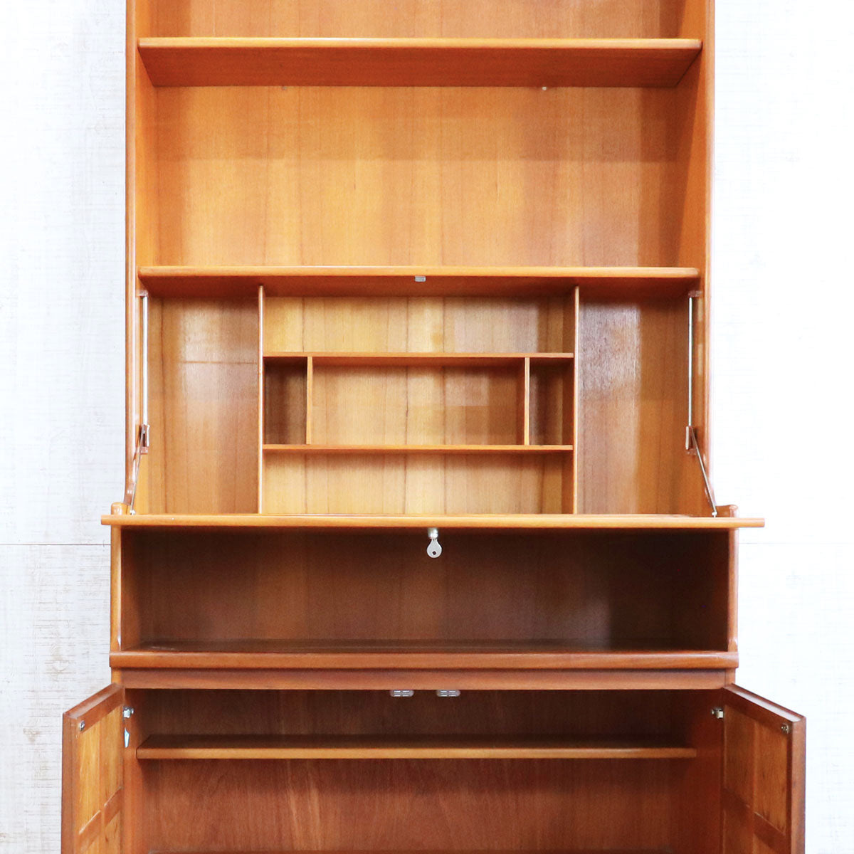 上部には棚板を備えたブックシェルフ、中央には鍵付きのビューロー(ライティングデスク)を配し、扉を開けると小物の収納に便利な仕切り棚付き。下部は開き戸タイプのキャビネット収納となっており、書類や雑貨、日用品などをすっきりと整理できます。