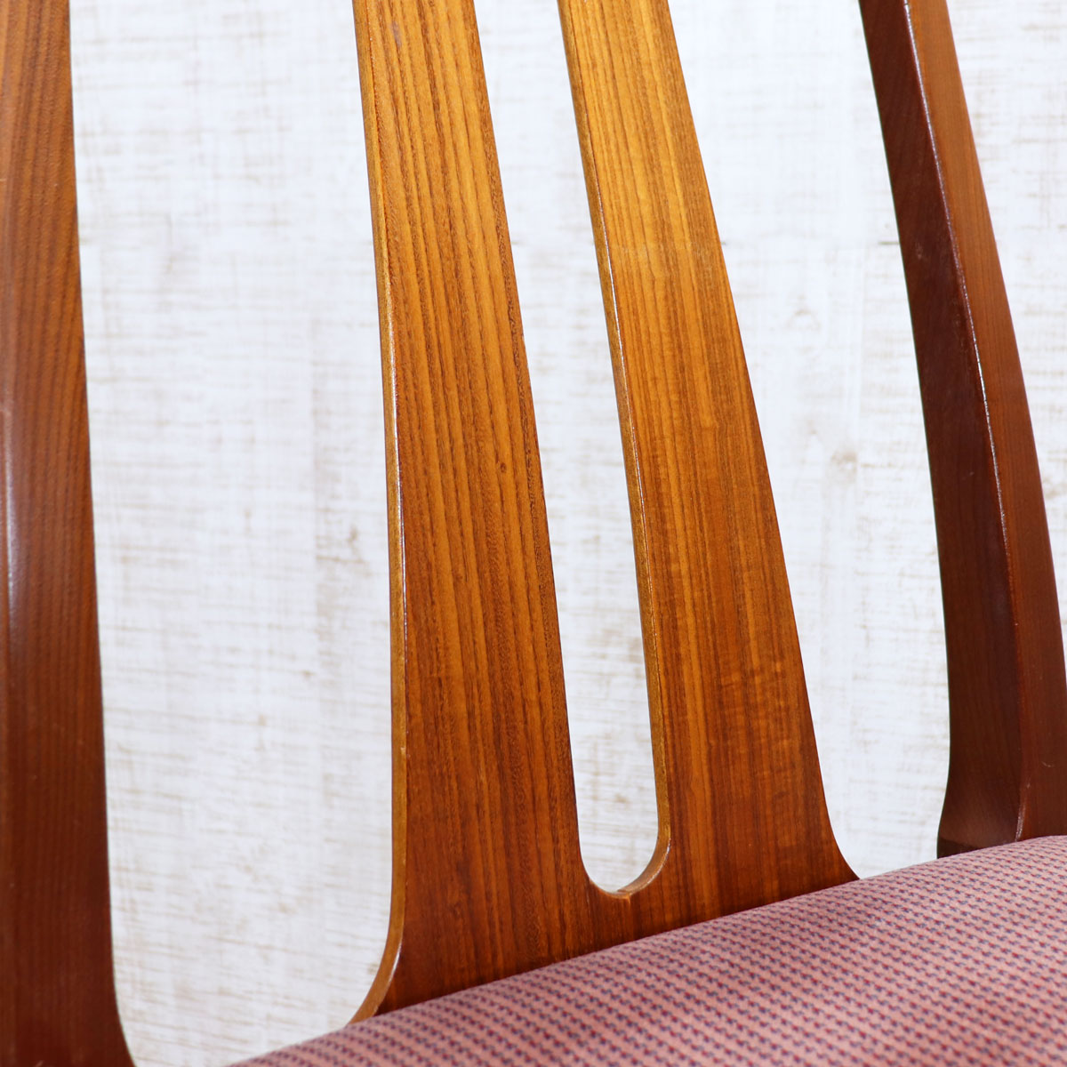美しい木目のチーク材フレームと、縦に伸びるスラットバックの軽やかなデザインが特徴で、空間に上品な抜け感を生み出します。背もたれは身体をやさしく支え、座面はクッション性のあるファブリック仕様で快適な座り心地。