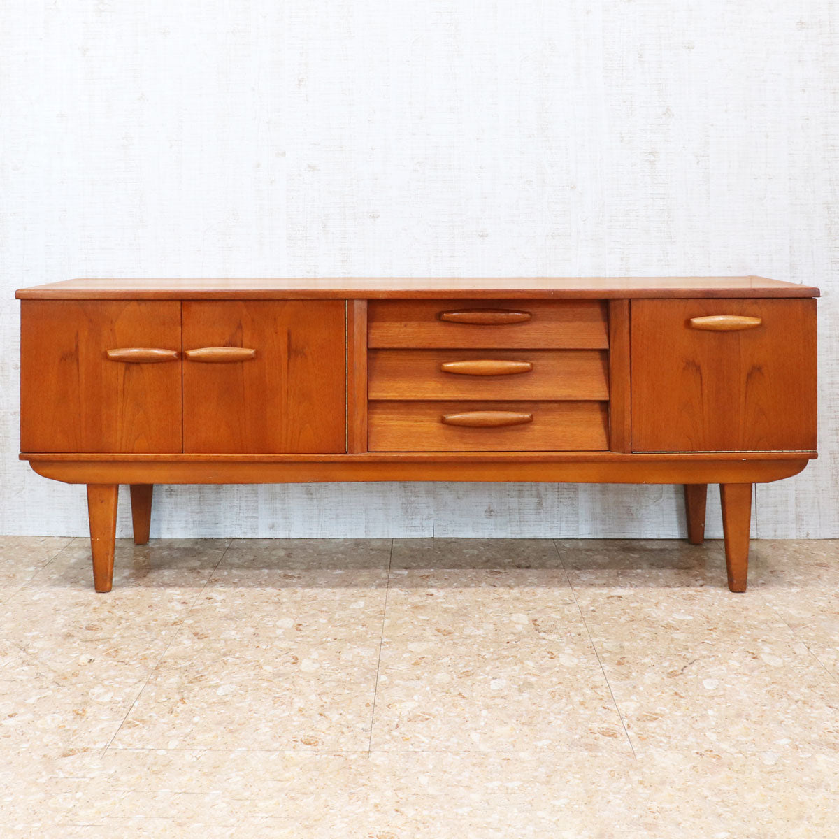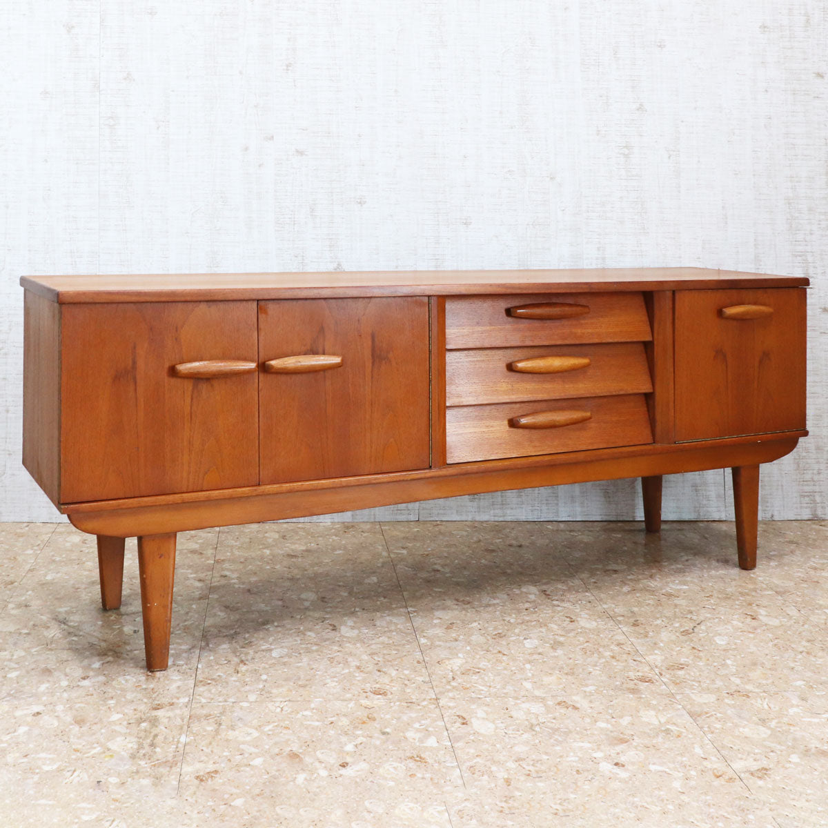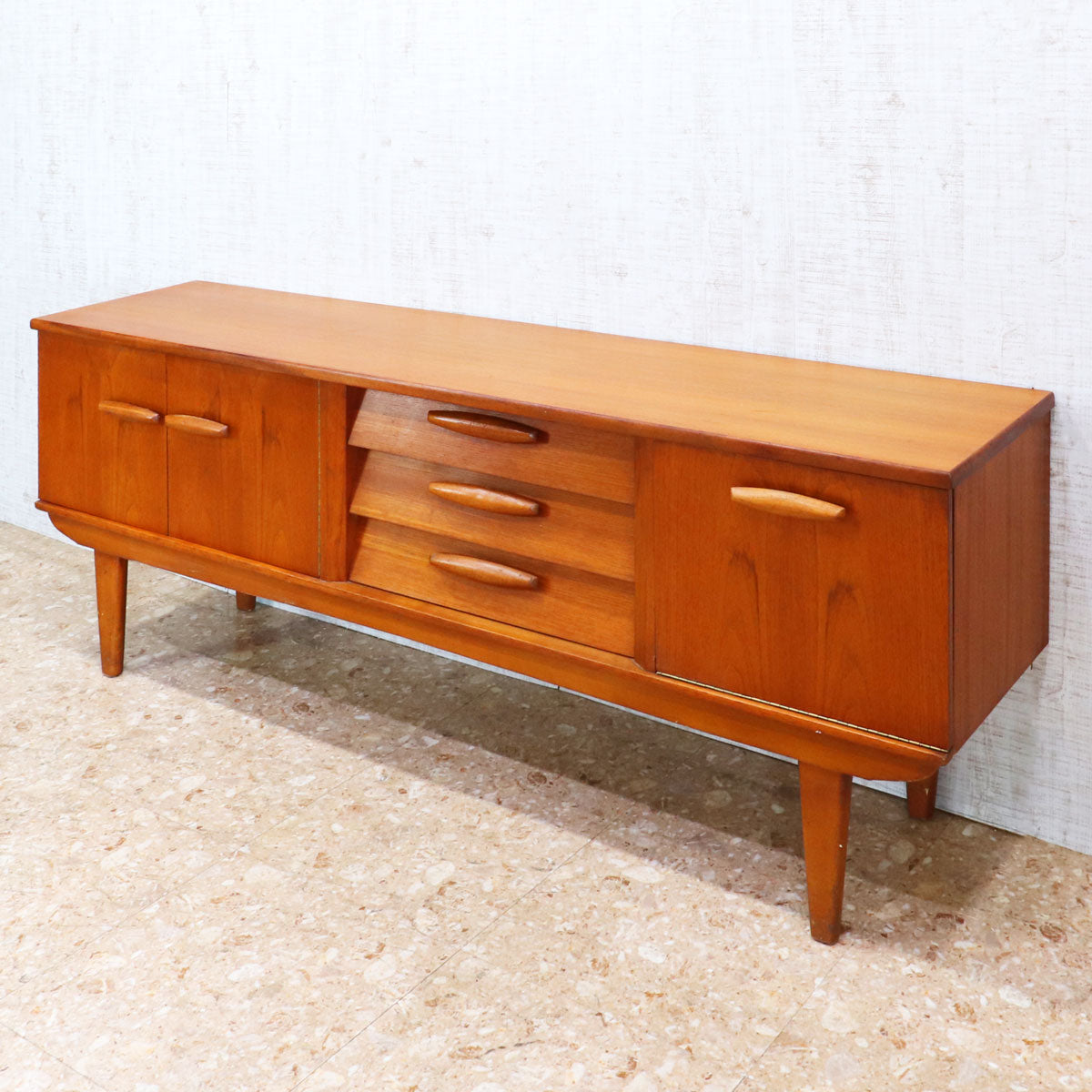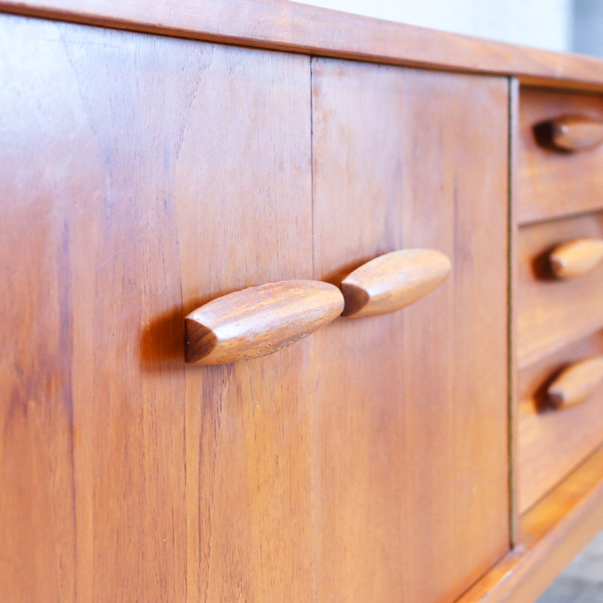 すっきりとした直線ラインと、丸みのあるオリジナルハンドル、軽快なテーパードレッグが空間をスタイリッシュに演出。ヴィンテージ家具ならではの存在感で、リビングやダイニングに温かみと上質さを加えてくれる一台です。