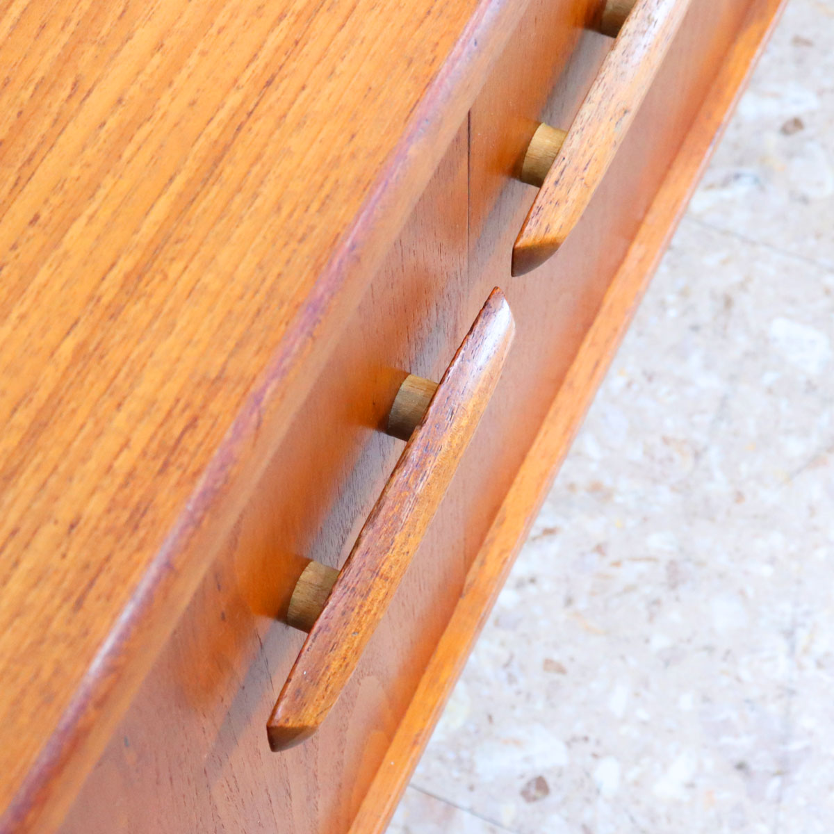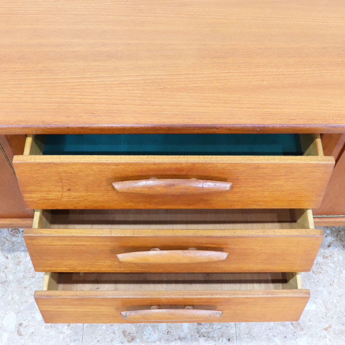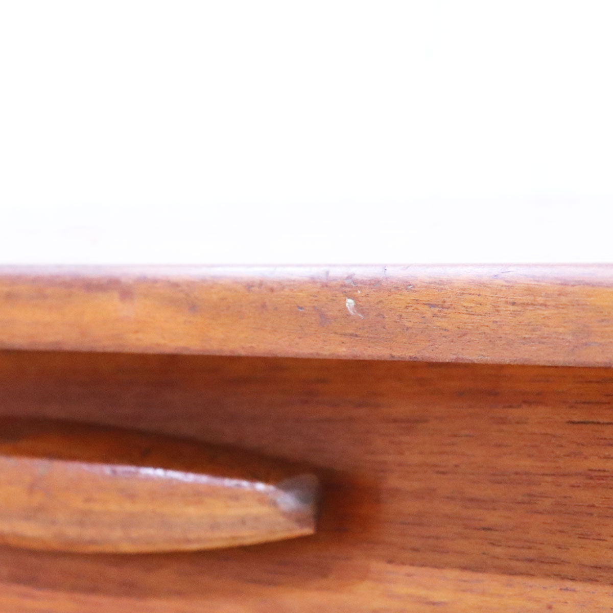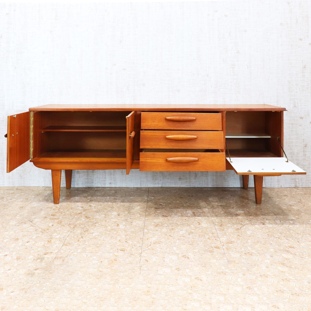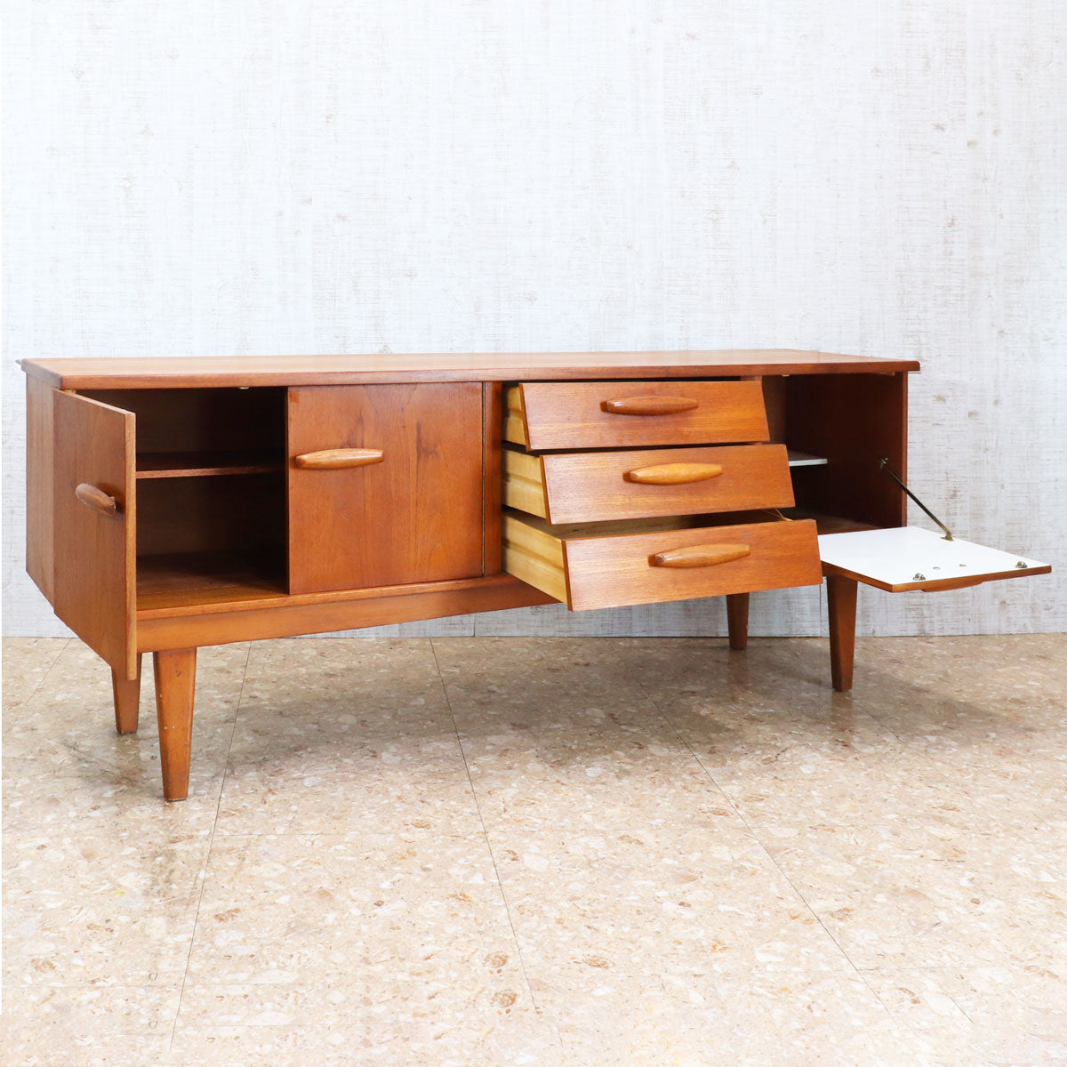 すっきりとした直線ラインと、丸みのあるオリジナルハンドル、軽快なテーパードレッグが空間をスタイリッシュに演出。ヴィンテージ家具ならではの存在感で、リビングやダイニングに温かみと上質さを加えてくれる一台です。