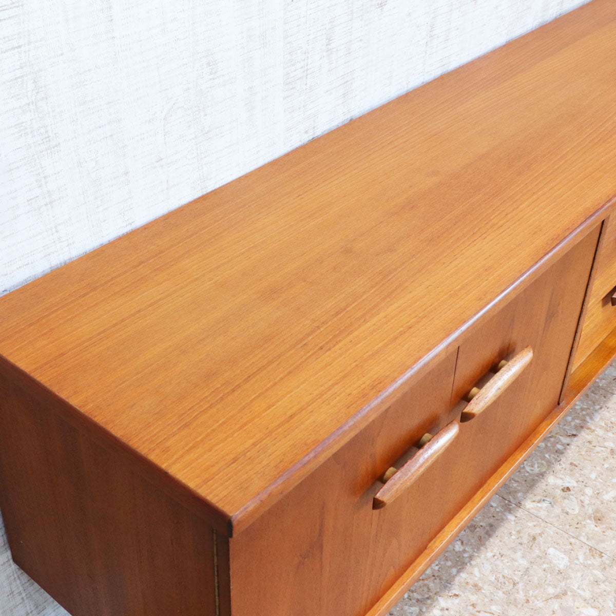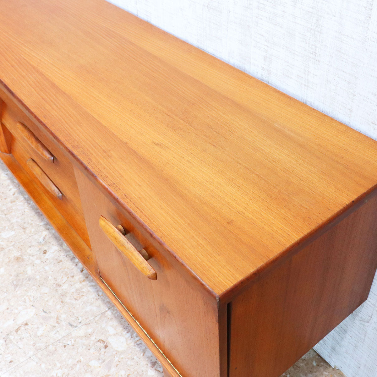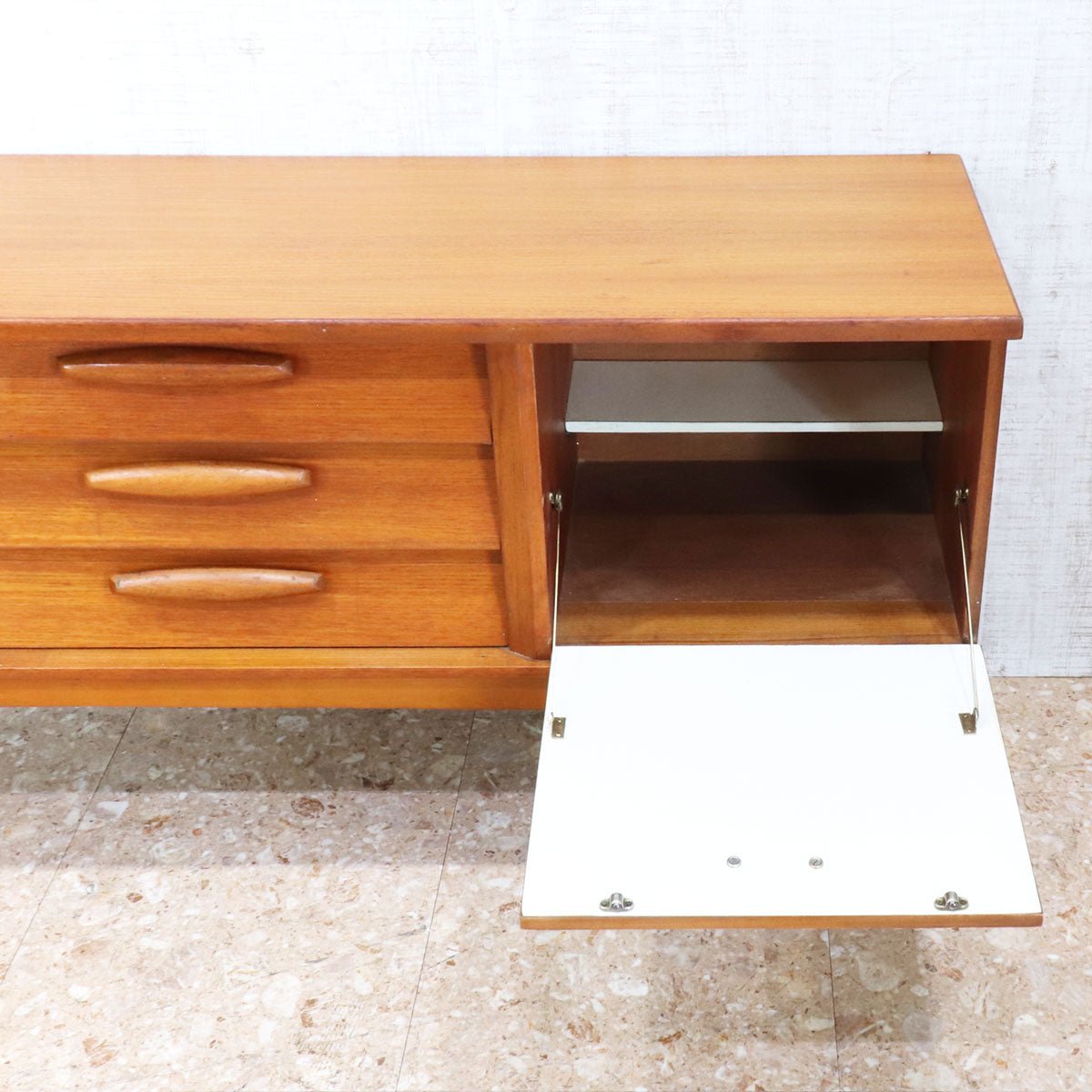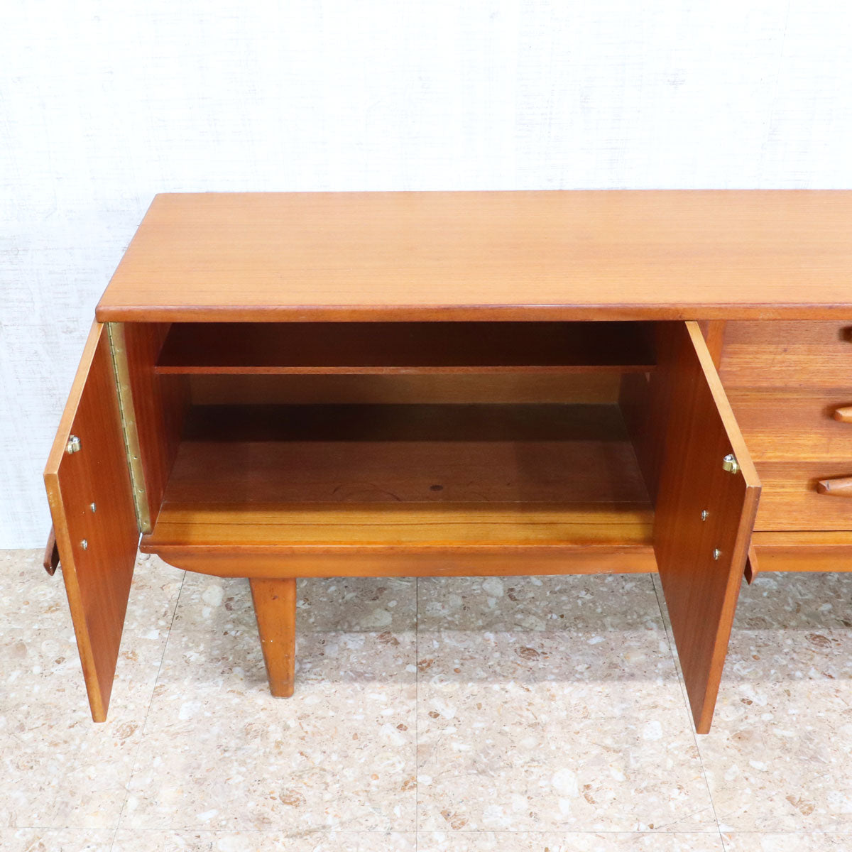 上質なチーク材を使用したミッドセンチュリーデザインが特徴で、北欧スタイルのインテリアとも相性抜群です。中央には引き出し3杯、両サイドには開き戸収納を備え、実用性とデザイン性を兼ね備えています。