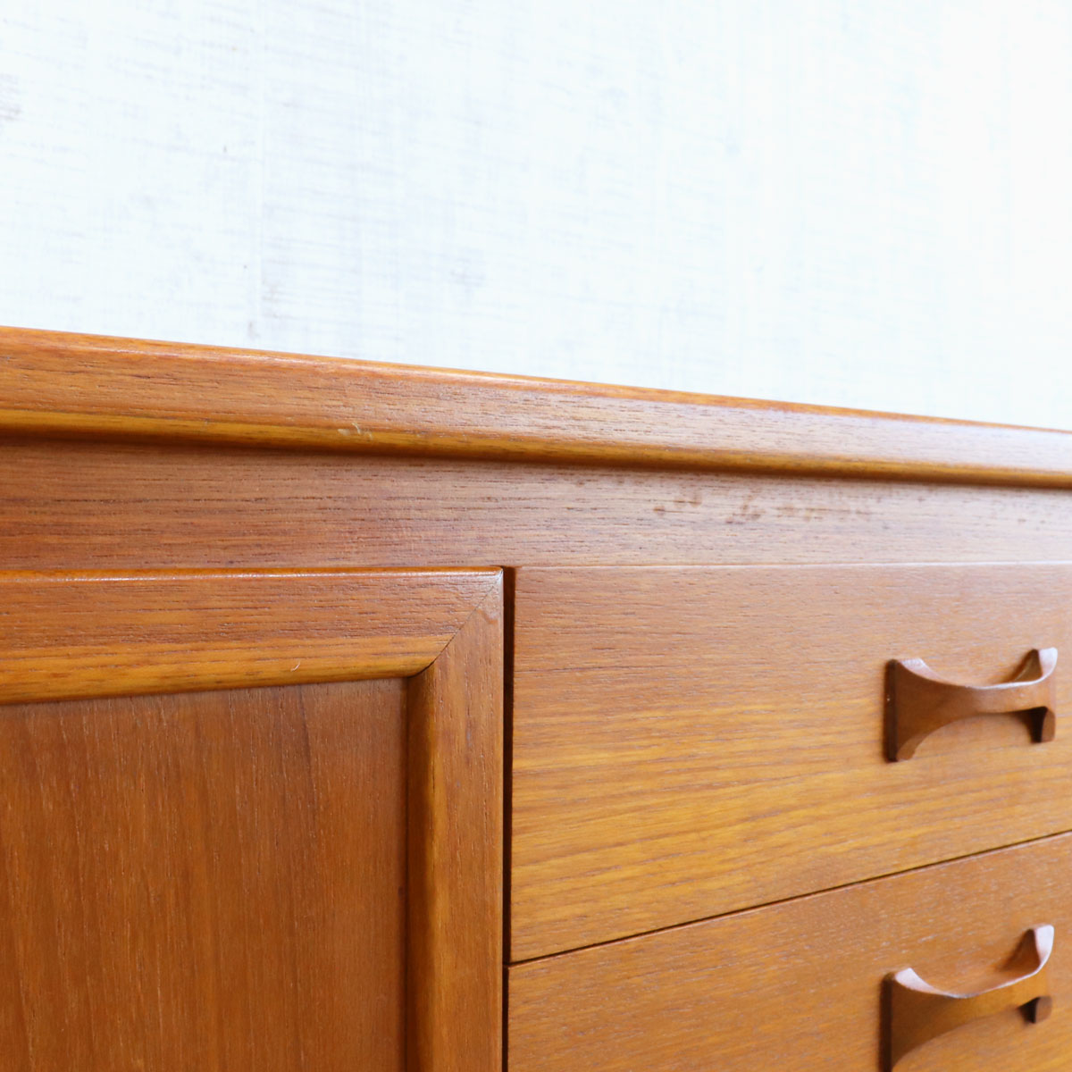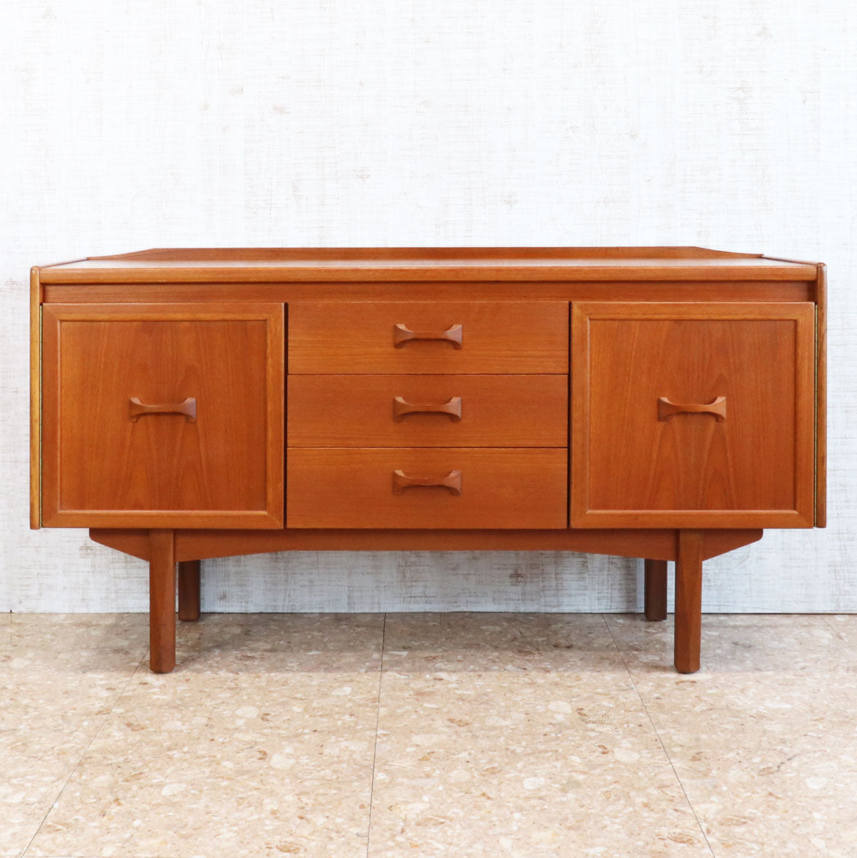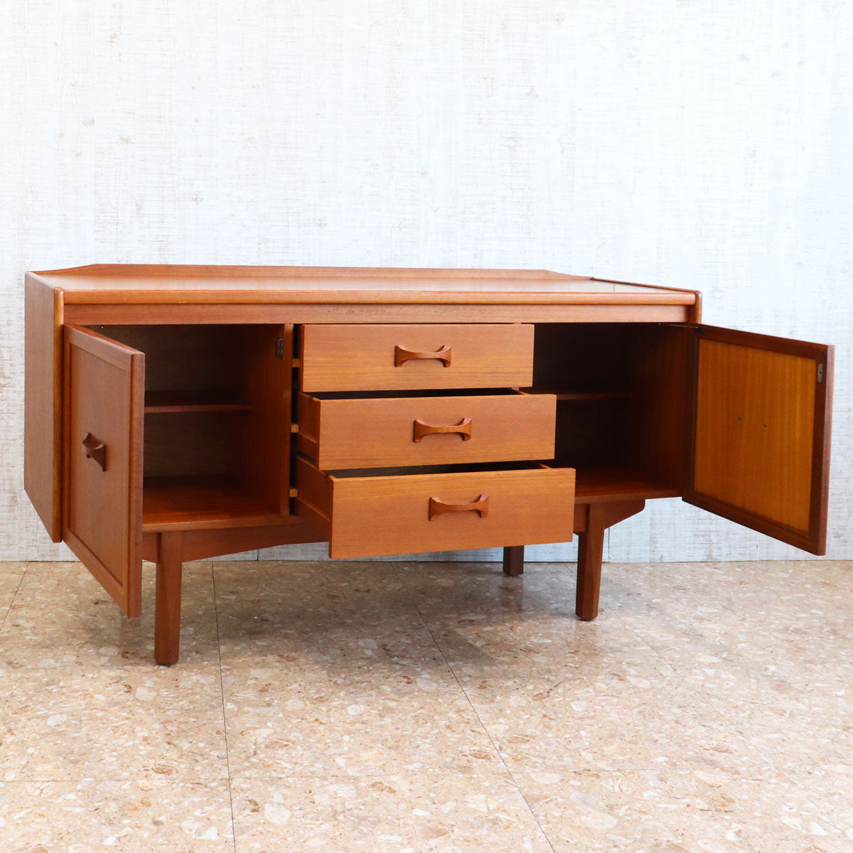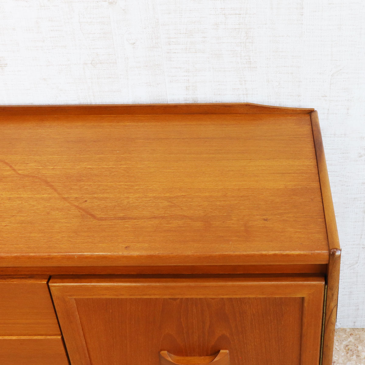 中央には3杯の引き出し、左右には広々とした開き戸収納を備え、食器類や日用品の収納にも実用的。脚部はすっきりとしたテーパードレッグで、空間に軽やかさをもたらします。 シンプルでありながらディテールまでこだわり抜かれた、時代を超えて愛される英国ミッドセンチュリー家具の逸品です。