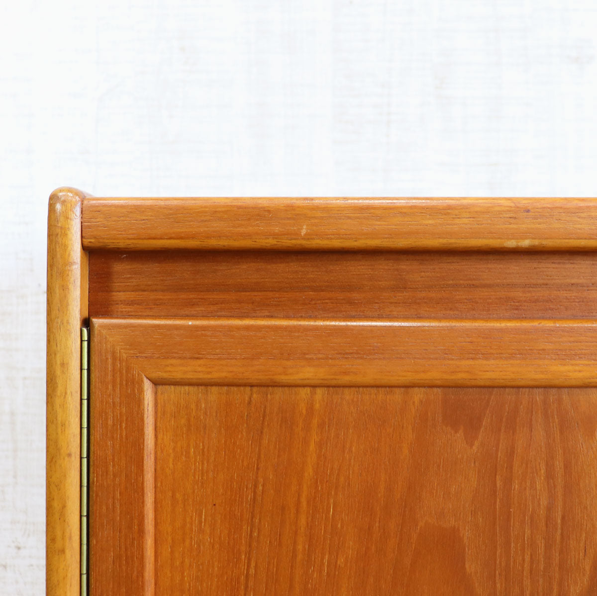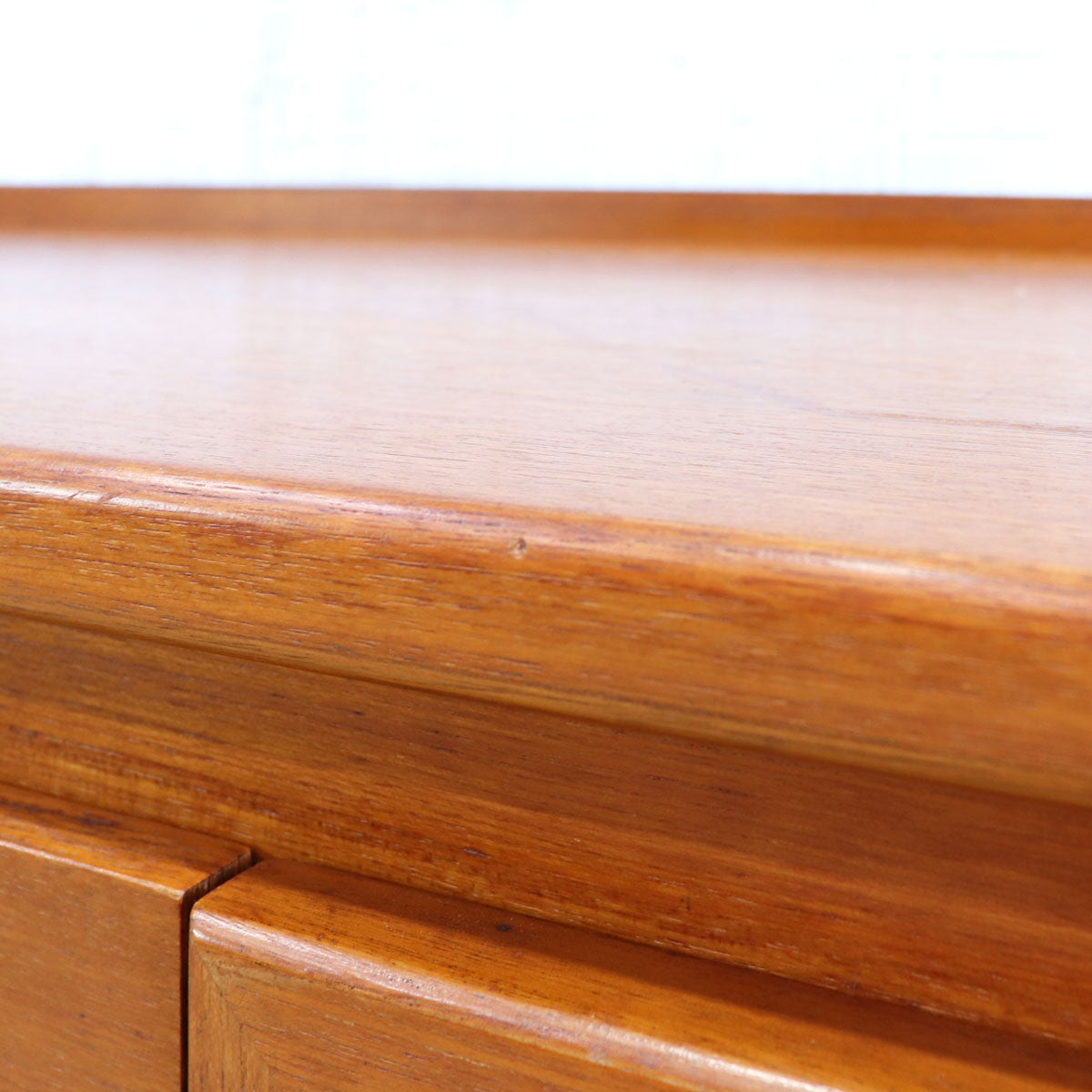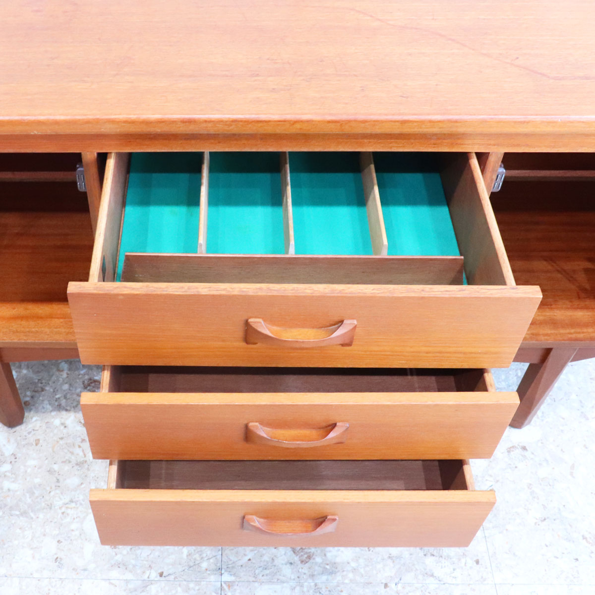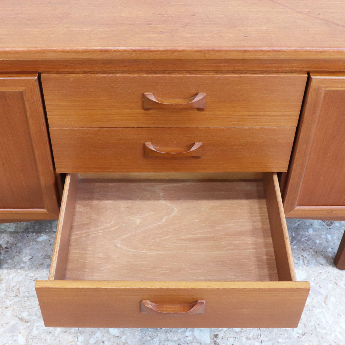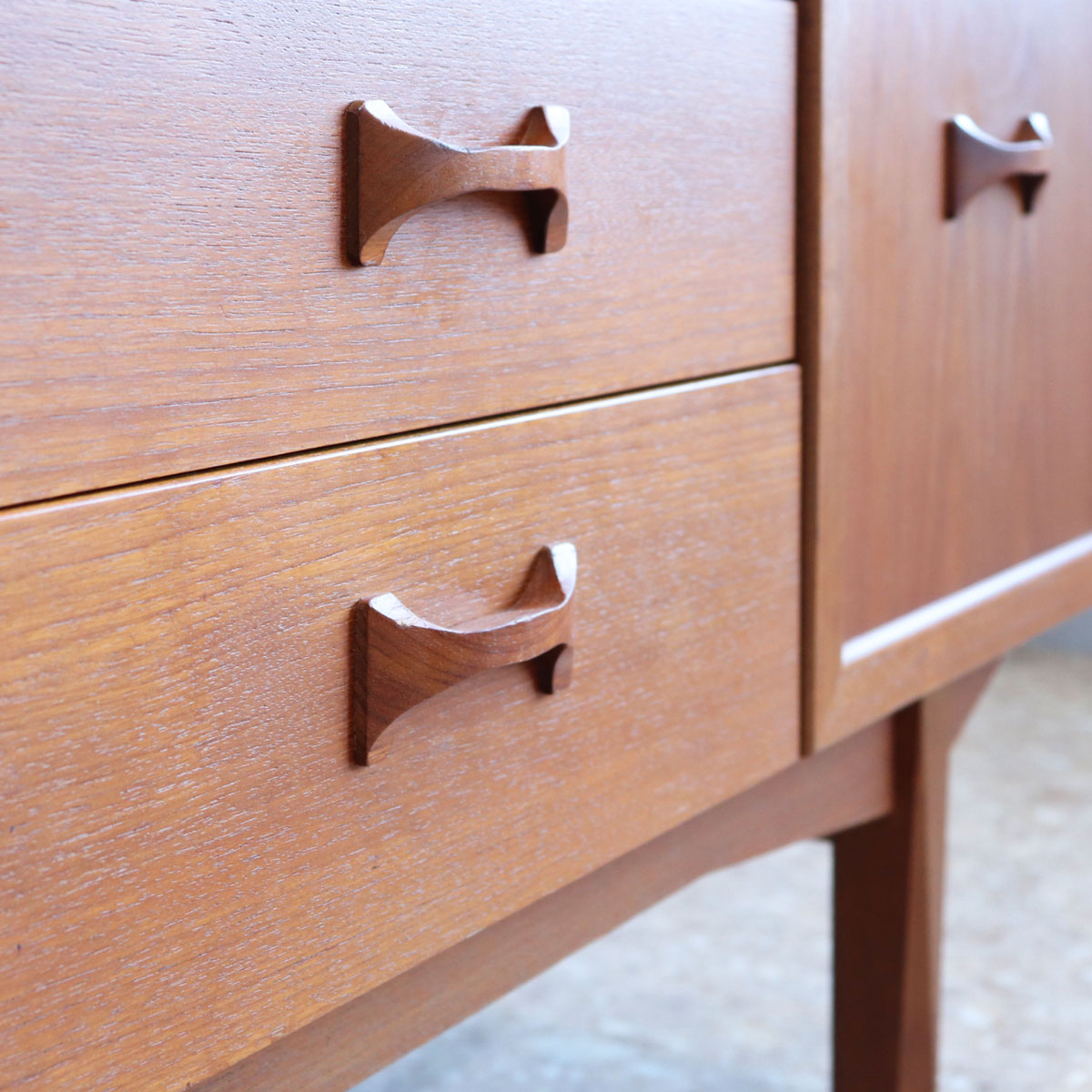 中央には3杯の引き出し、左右には広々とした開き戸収納を備え、食器類や日用品の収納にも実用的。脚部はすっきりとしたテーパードレッグで、空間に軽やかさをもたらします。 シンプルでありながらディテールまでこだわり抜かれた、時代を超えて愛される英国ミッドセンチュリー家具の逸品です。