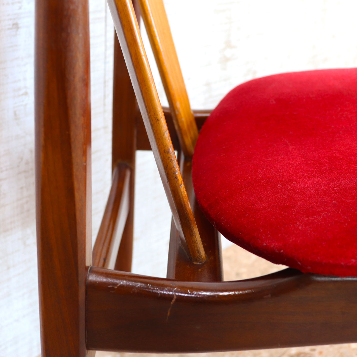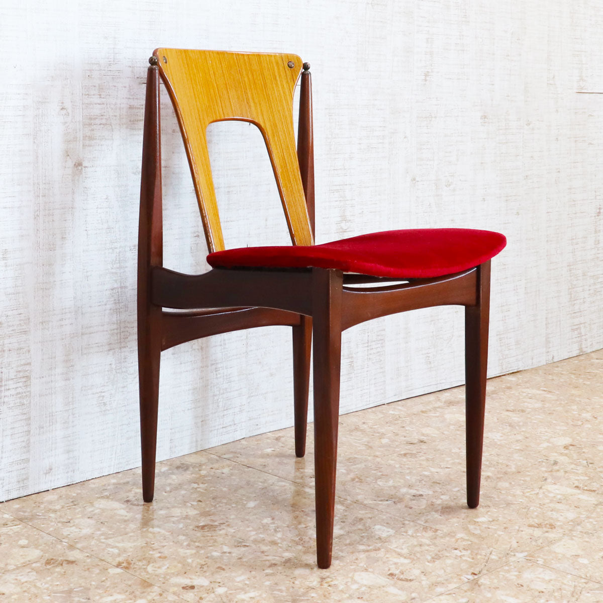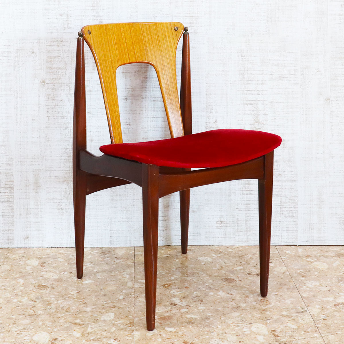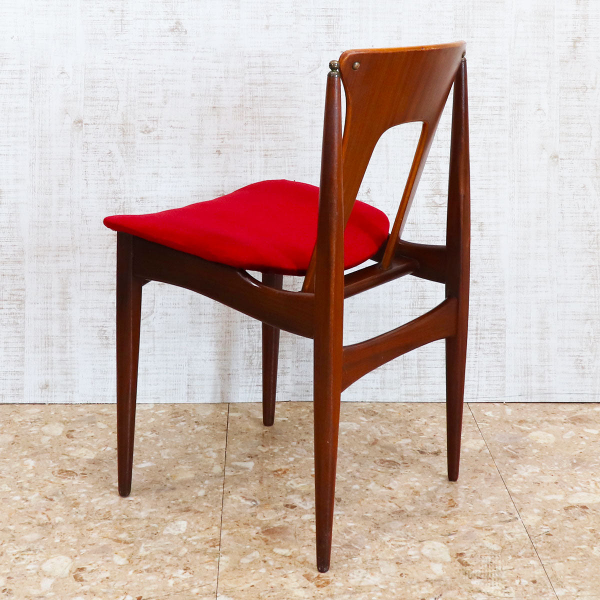 鮮やかなレッドファブリックの座面は空間のアクセントとなり、ダイニングやリビングを華やかに演出。ミッドセンチュリーモダンの洗練されたデザインと、ヴィンテージ家具ならではの味わいを兼ね備えた一脚です。