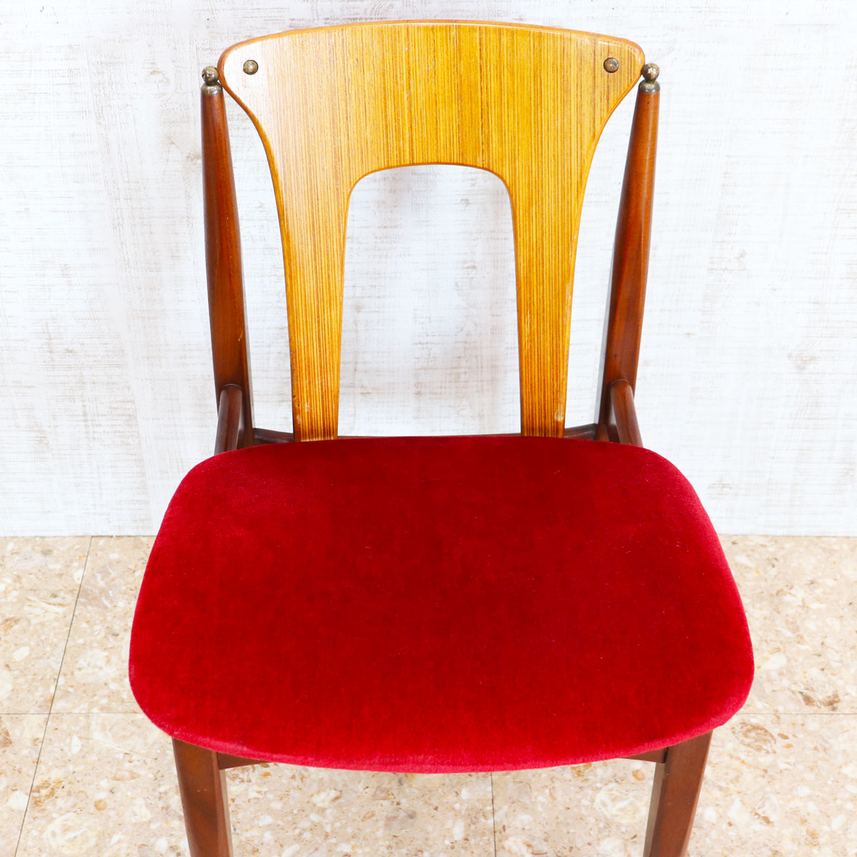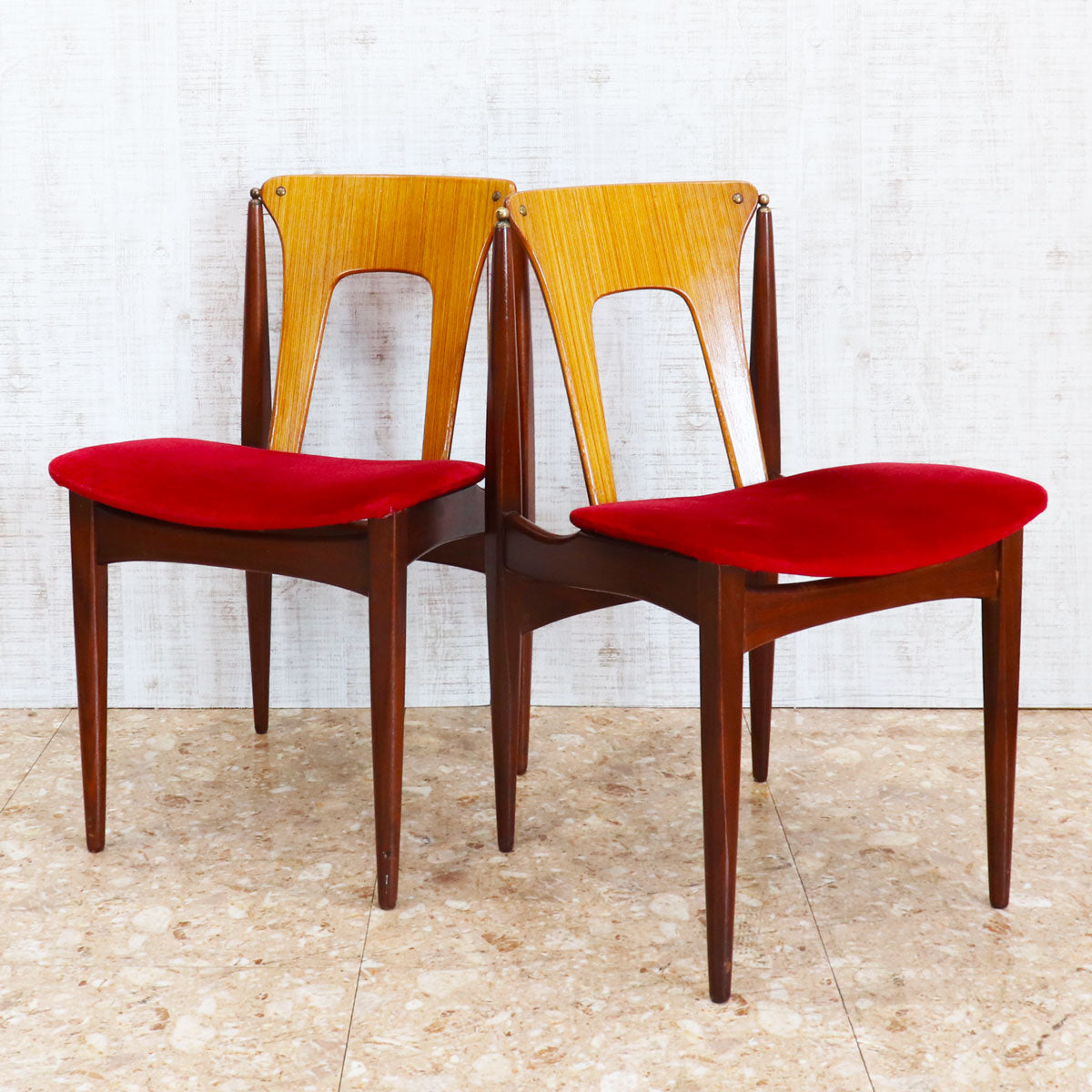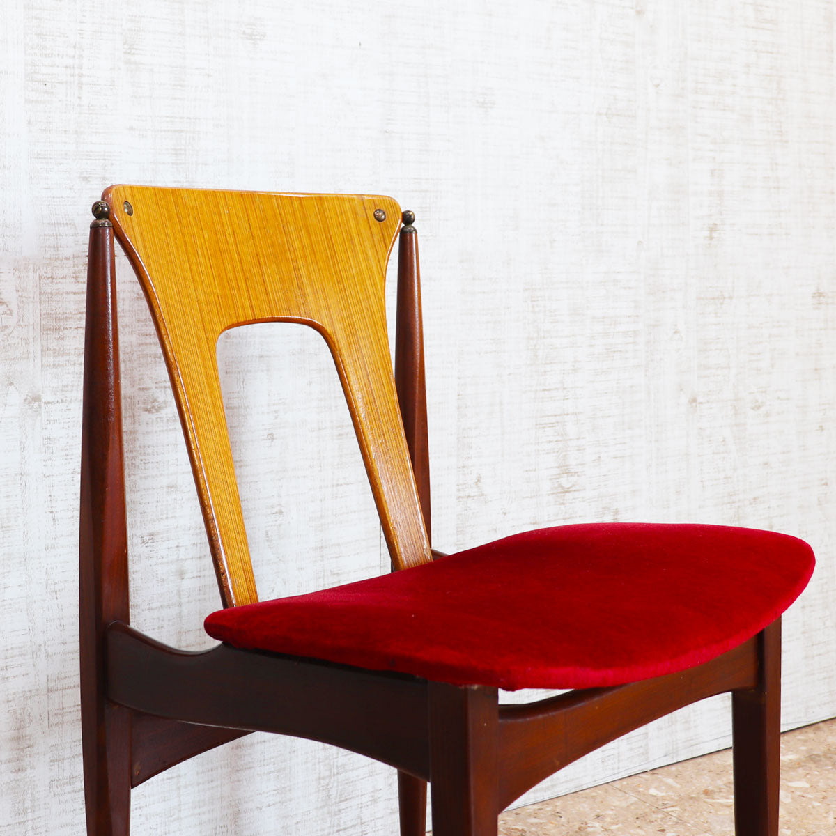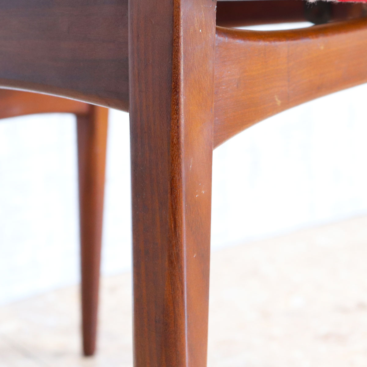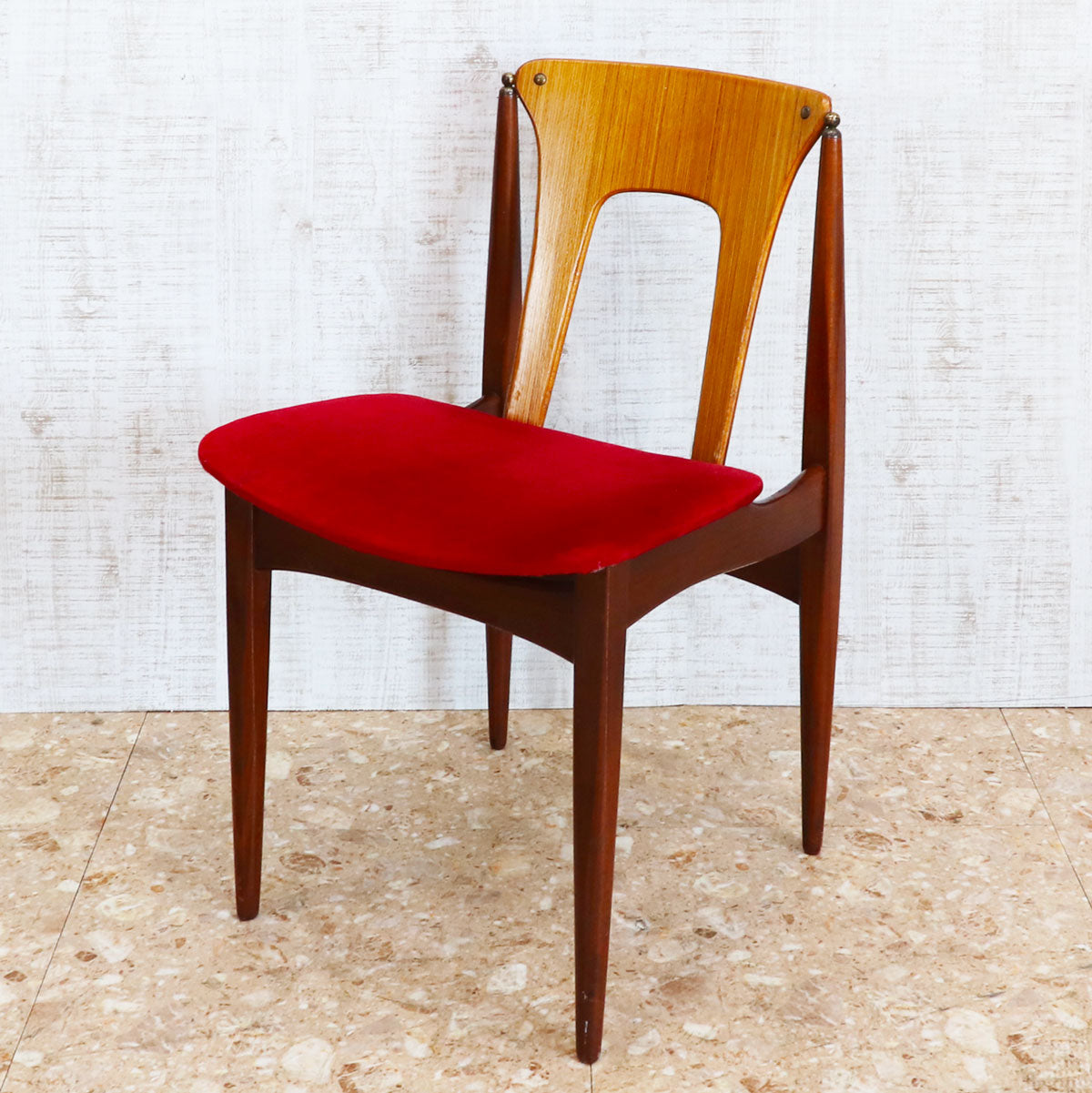 鮮やかなレッドファブリックの座面は空間のアクセントとなり、ダイニングやリビングを華やかに演出。ミッドセンチュリーモダンの洗練されたデザインと、ヴィンテージ家具ならではの味わいを兼ね備えた一脚です。