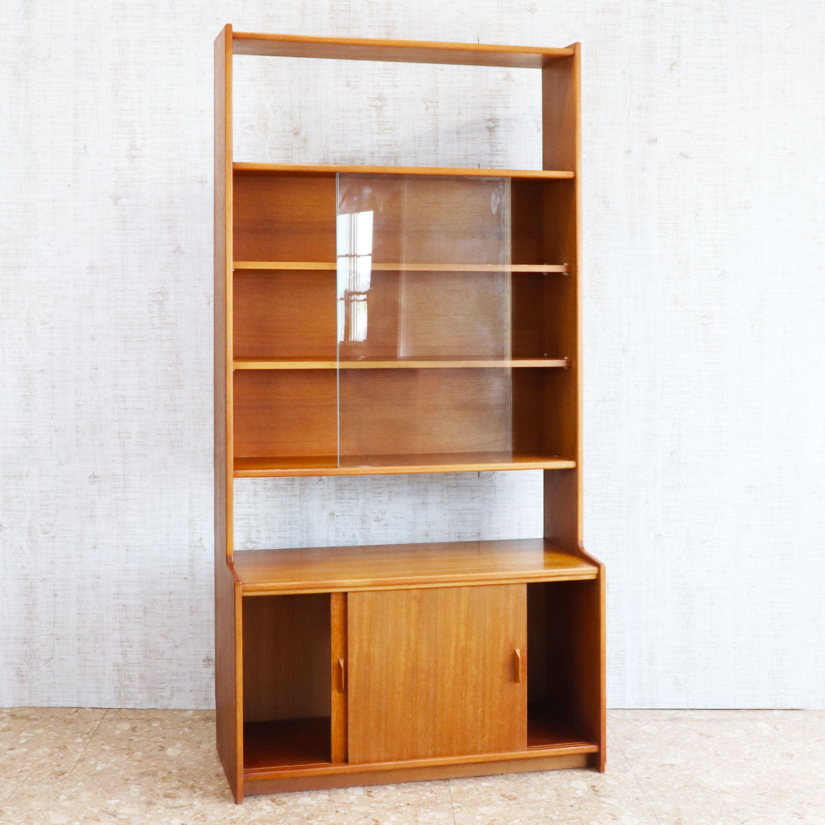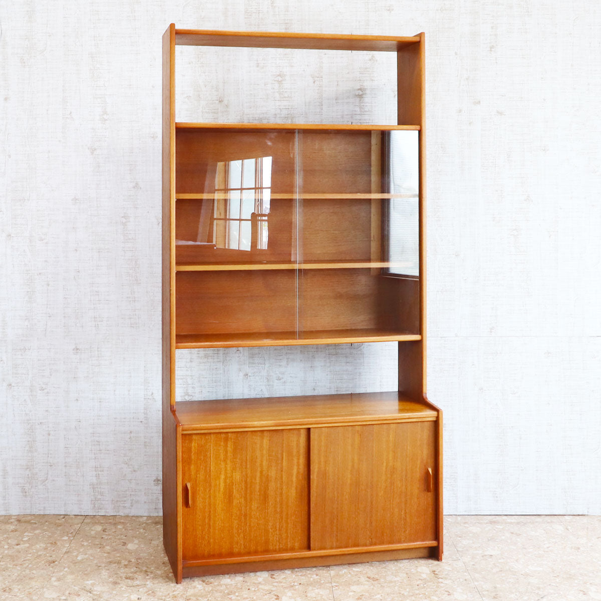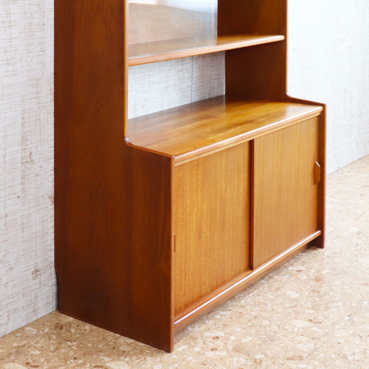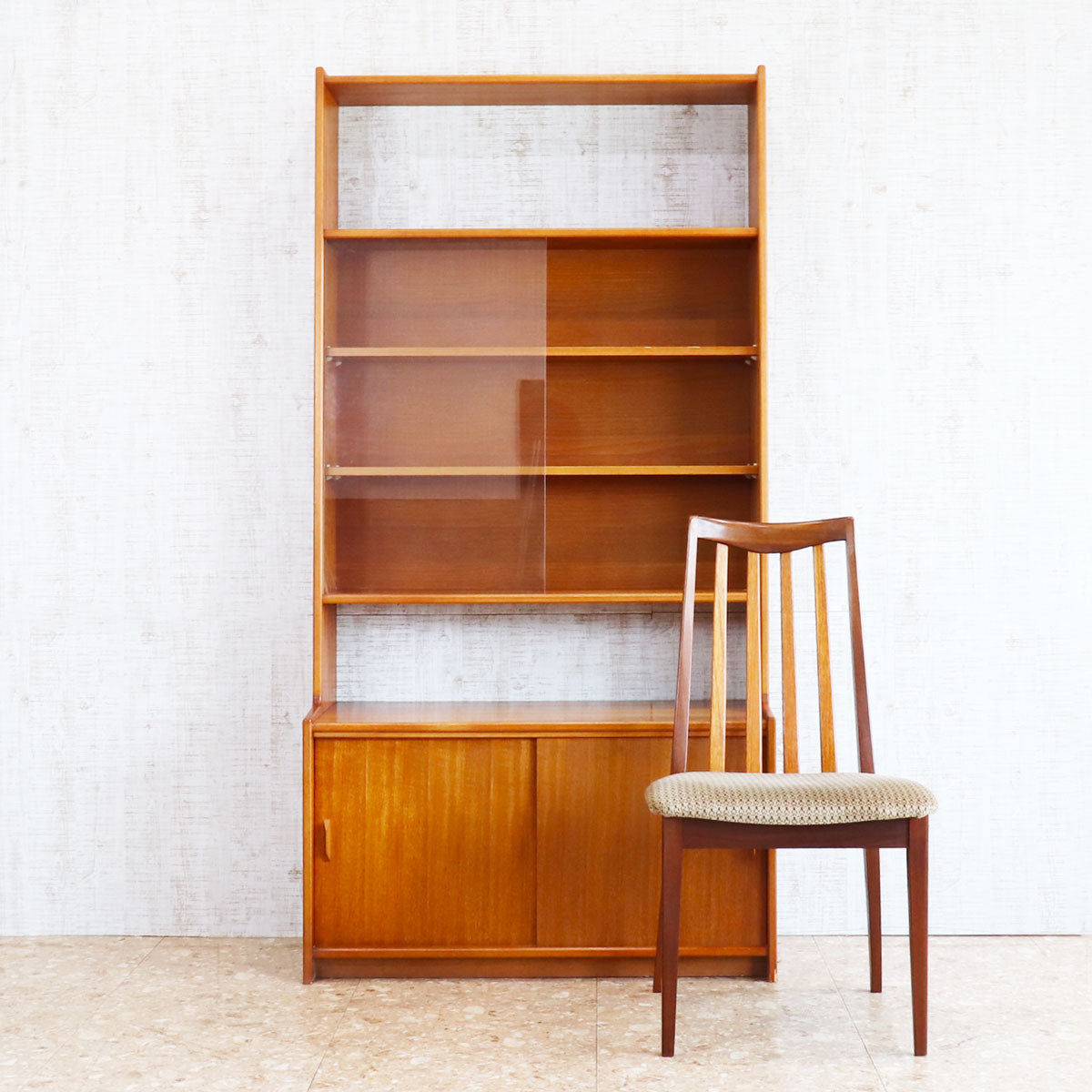 英国Herbert E. Gibbsによるヴィンテージ・ガラスキャビネット。1950〜60年代頃のミッドセンチュリーデザインを象徴する一台です。チーク材の美しい木目と、直線を基調とした端正なフォルムが魅力で、空間に上品な落ち着きをもたらします。