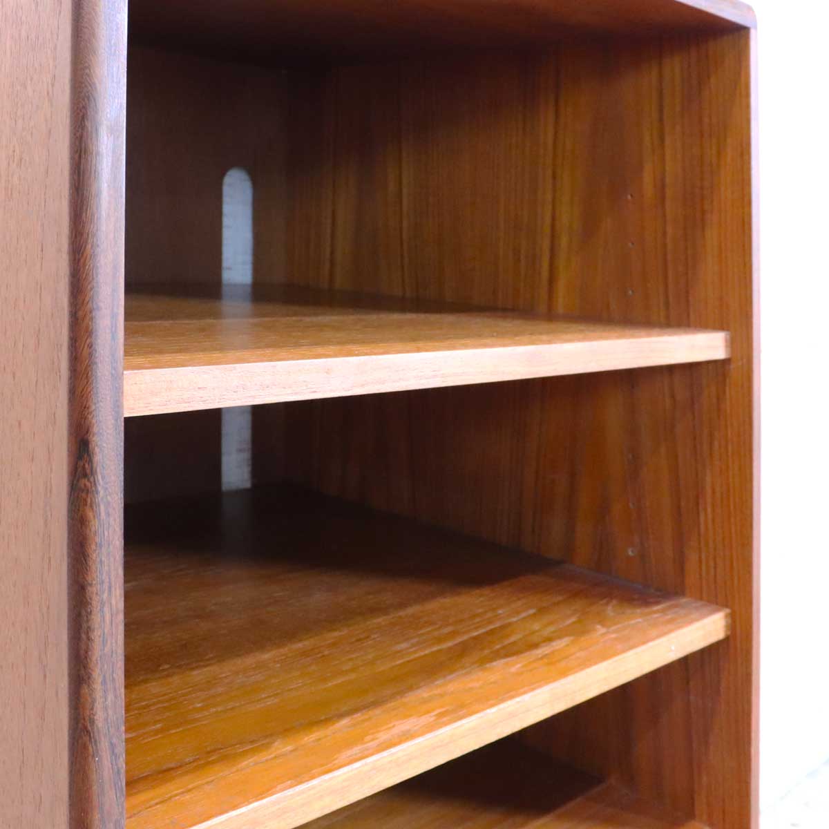 上段には本や雑貨をディスプレイできるオープンシェルフを備え、棚板は高さ調整が可能。背面にはHi-Fi機器用の通気口が施され、オーディオ収納としての機能性も兼ね備えています。下段の扉付きキャビネットにはレコード収納用の金属製の仕切りが付属。機能性と美しさを両立したヴィンテージ家具ならではの一台です。