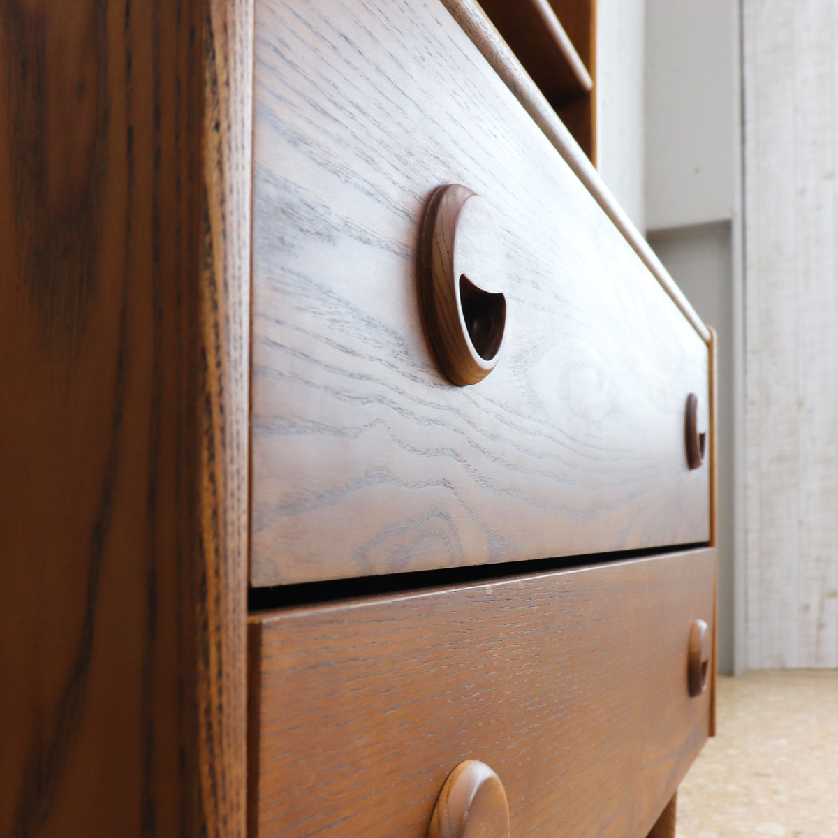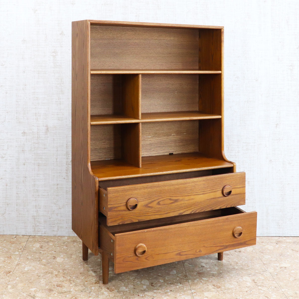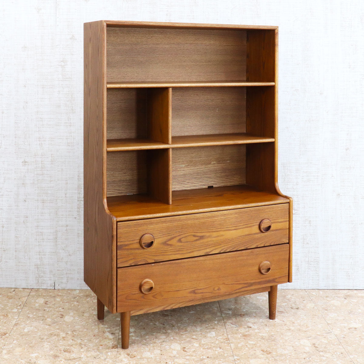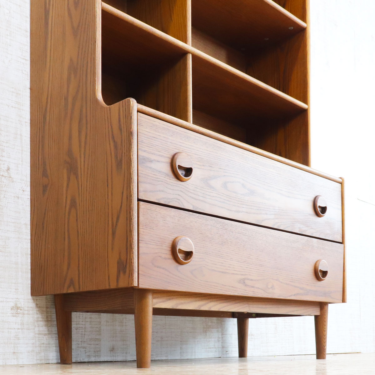 上段には大小の仕切り棚が配置され、本や小物、ディスプレイアイテムをすっきりと収納可能。下段には丸い取っ手が特徴的な引き出しが2杯付き、日用品や書類の整理にも便利です。すらりとした丸脚が軽やかな印象を与え、北欧デザインの影響を感じさせる佇まい。リビングから書斎まで幅広く活躍する一点です。