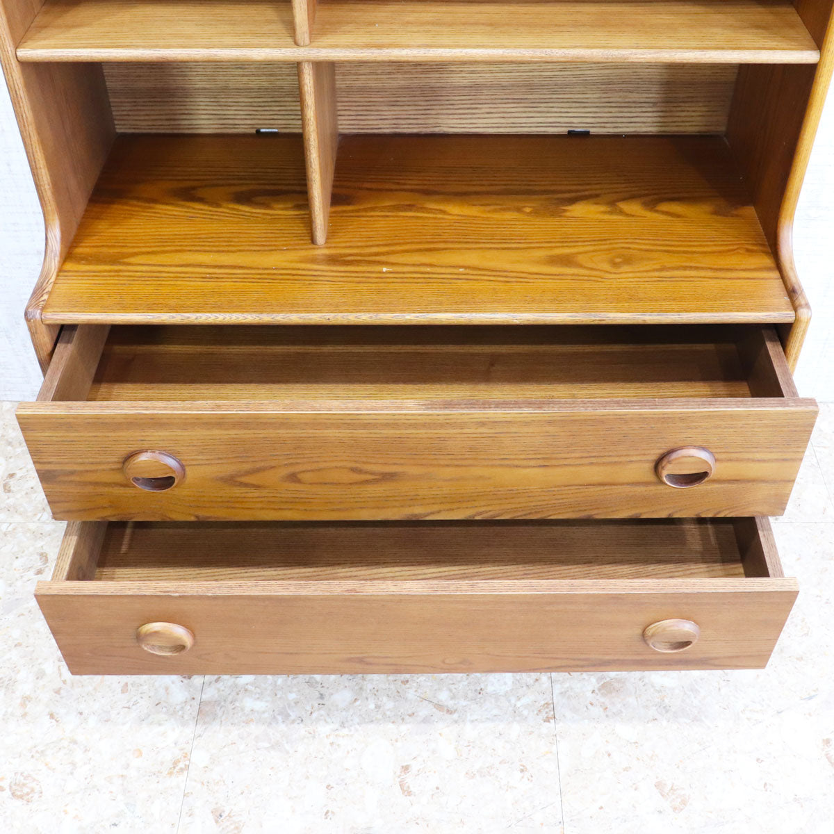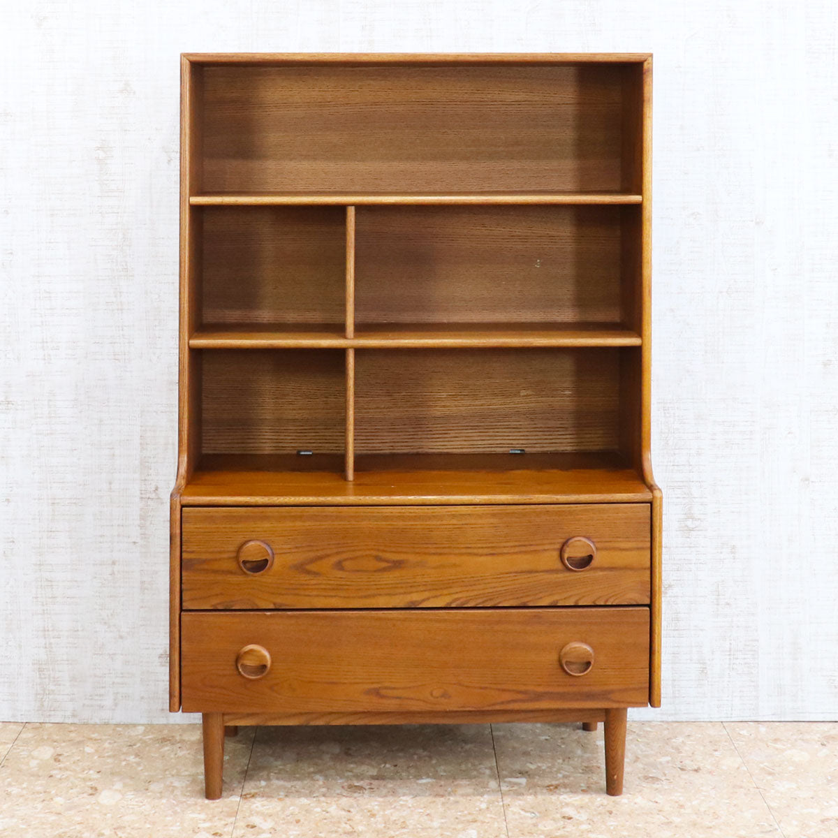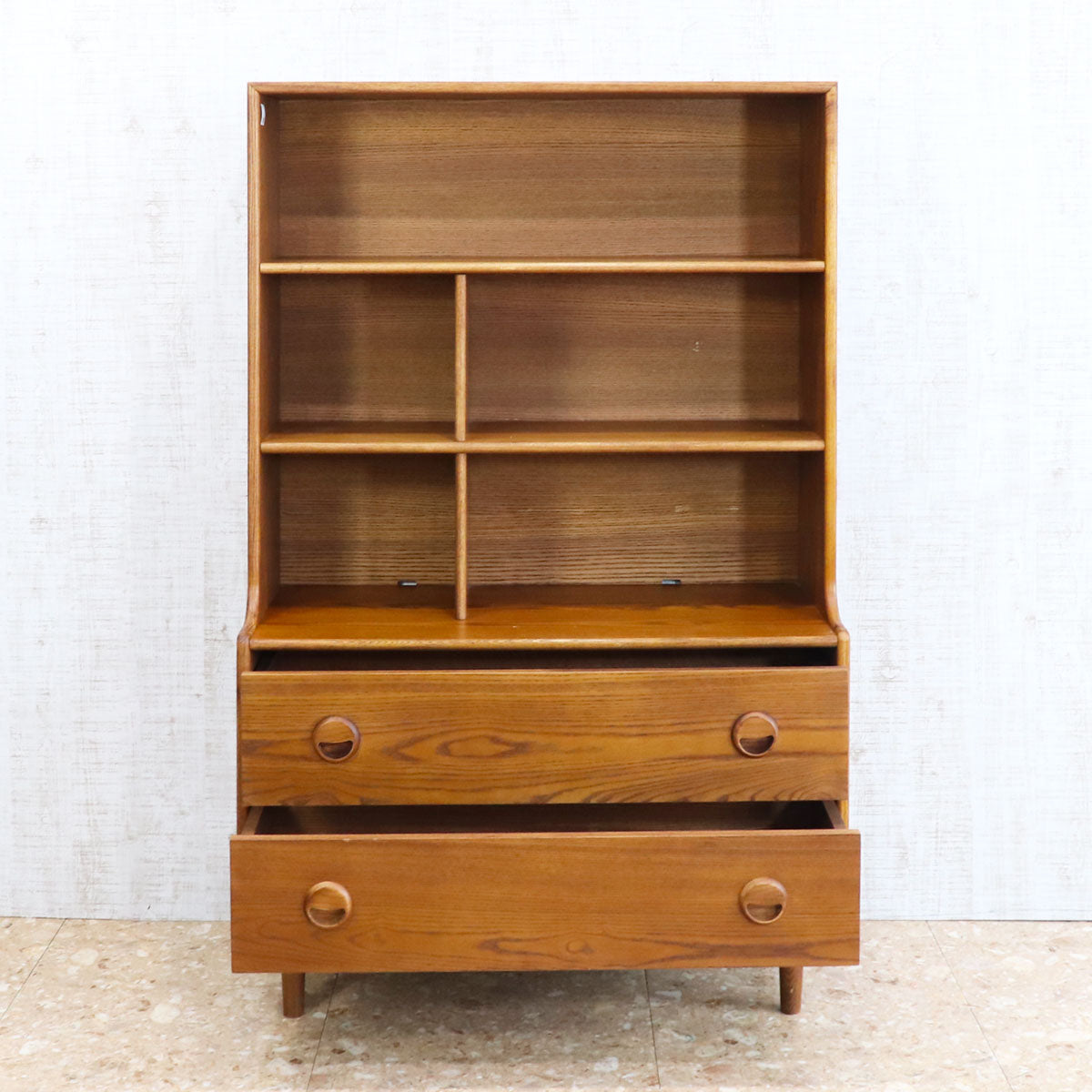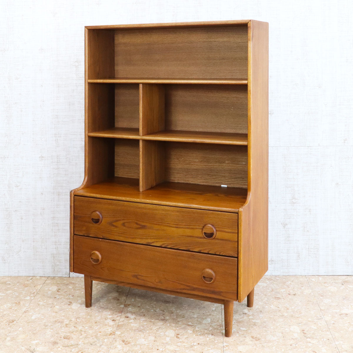 上段には大小の仕切り棚が配置され、本や小物、ディスプレイアイテムをすっきりと収納可能。下段には丸い取っ手が特徴的な引き出しが2杯付き、日用品や書類の整理にも便利です。すらりとした丸脚が軽やかな印象を与え、北欧デザインの影響を感じさせる佇まい。リビングから書斎まで幅広く活躍する一点です。