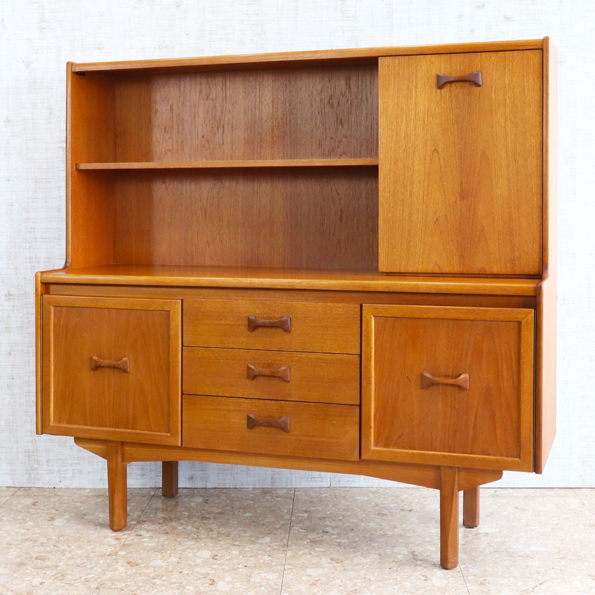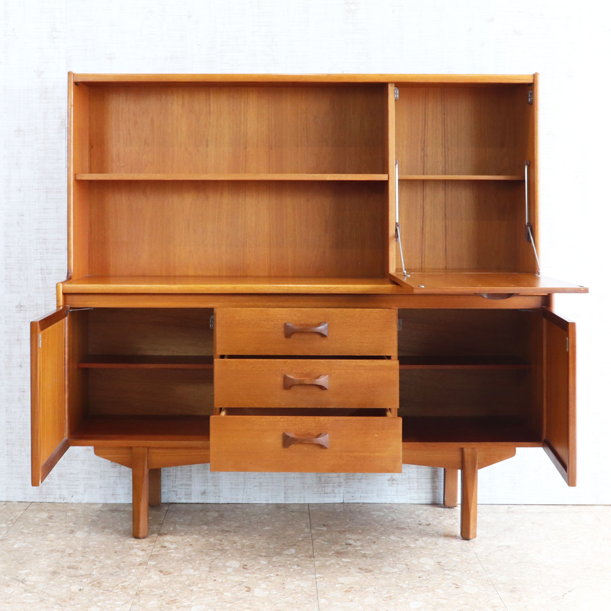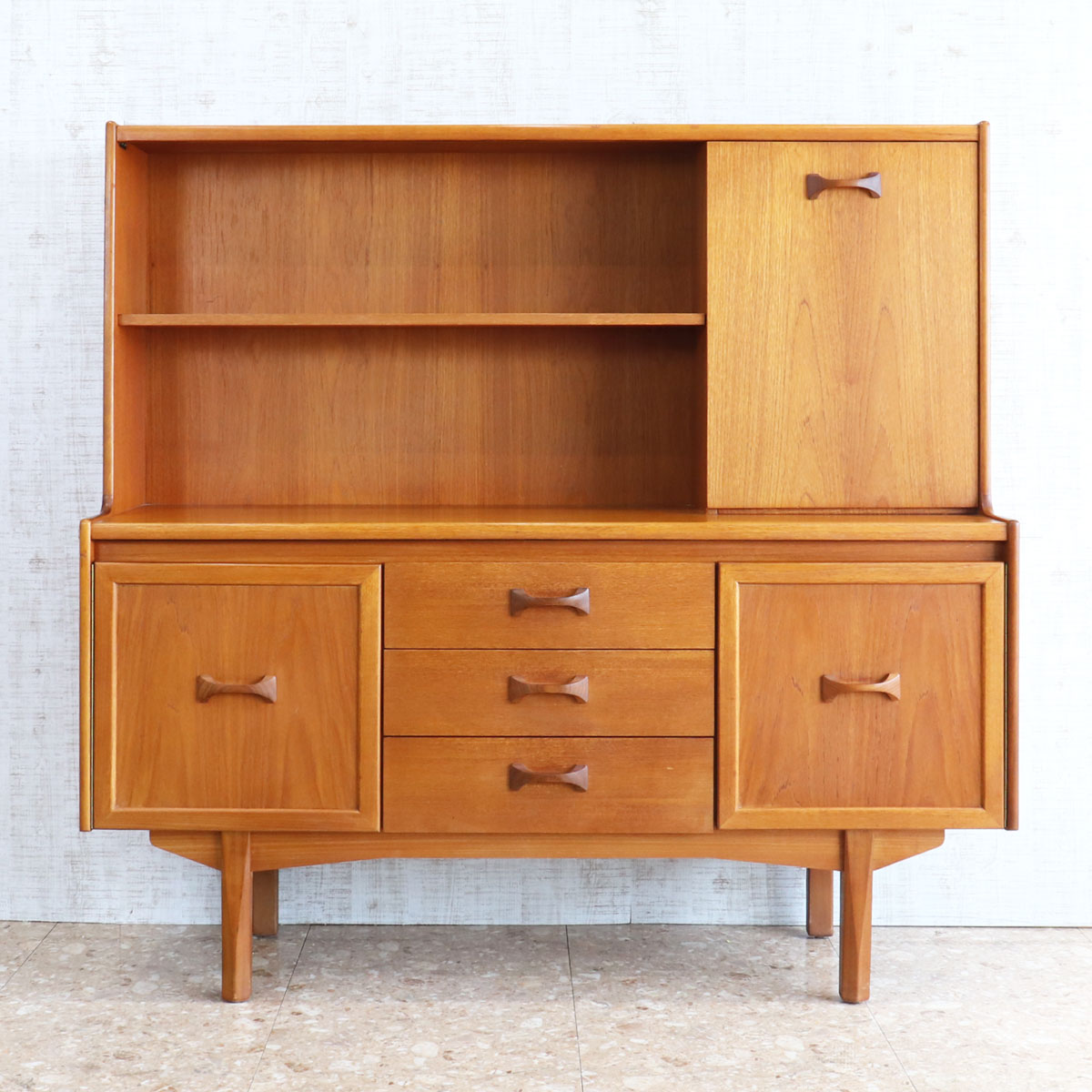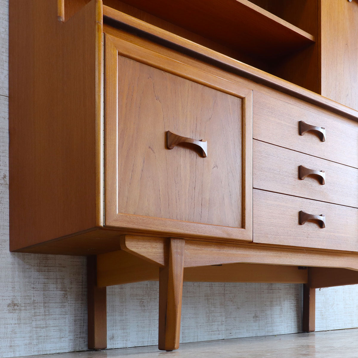 英国William Lawrence(ウィリアム・ローレンス)社による、上質なチーク材を用いたヴィンテージキャビネット。1960年代らしいミッドセンチュリーモダンの要素を取り入れた、洗練されたデザインが魅力です。バタフライ型の木製ハンドルがアクセントになっており、直線的なフォルムの中に柔らかな個性を添えています。