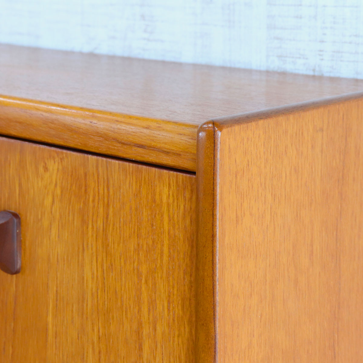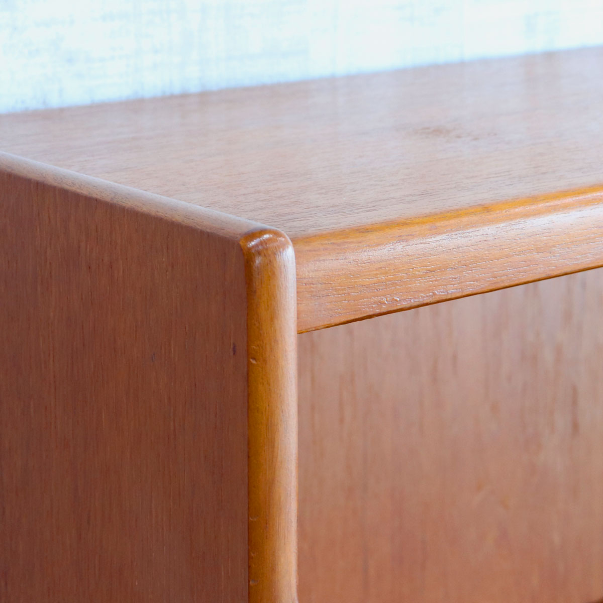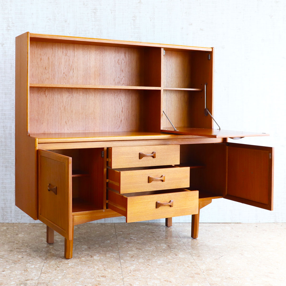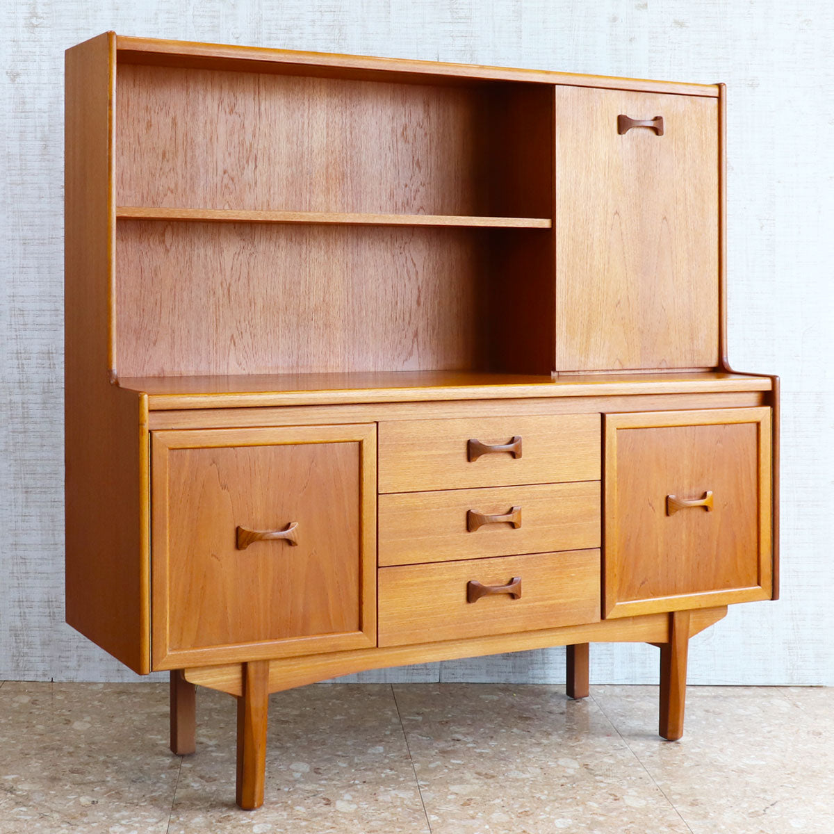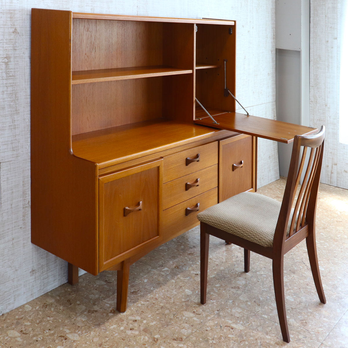英国William Lawrence(ウィリアム・ローレンス)社による、上質なチーク材を用いたヴィンテージキャビネット。1960年代らしいミッドセンチュリーモダンの要素を取り入れた、洗練されたデザインが魅力です。バタフライ型の木製ハンドルがアクセントになっており、直線的なフォルムの中に柔らかな個性を添えています。