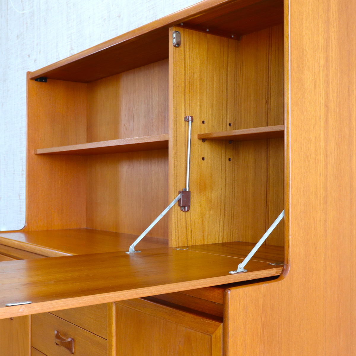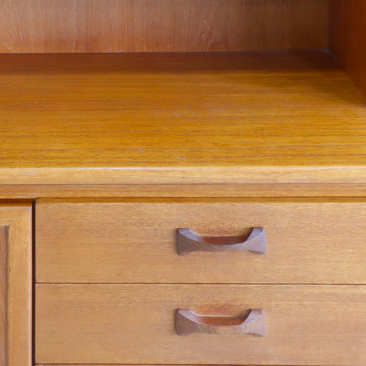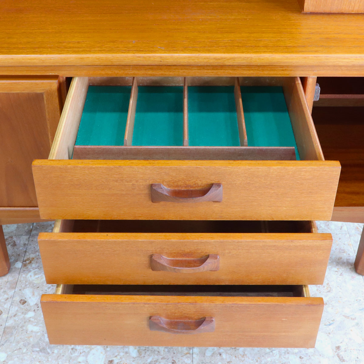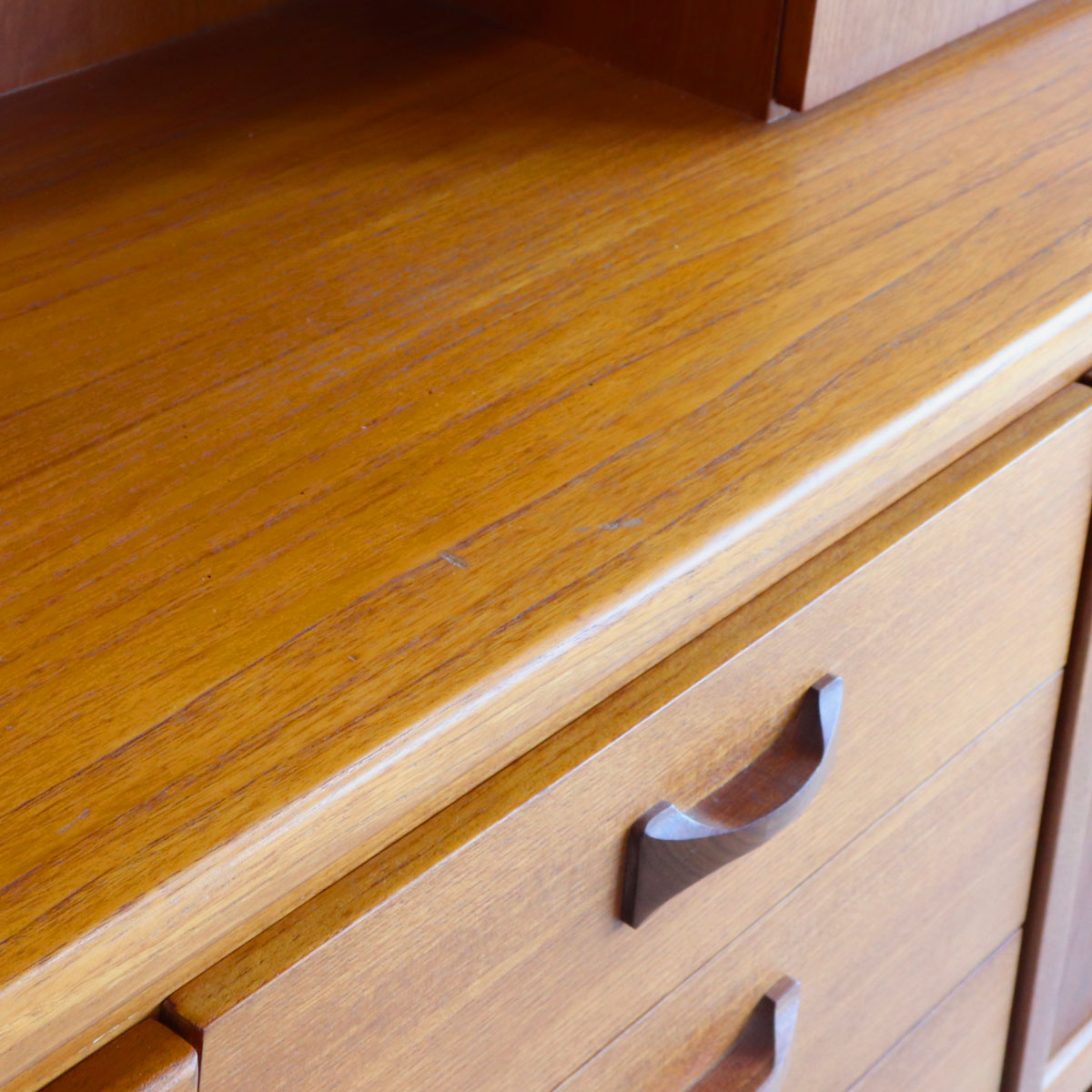 英国William Lawrence(ウィリアム・ローレンス)社による、上質なチーク材を用いたヴィンテージキャビネット。1960年代らしいミッドセンチュリーモダンの要素を取り入れた、洗練されたデザインが魅力です。バタフライ型の木製ハンドルがアクセントになっており、直線的なフォルムの中に柔らかな個性を添えています。