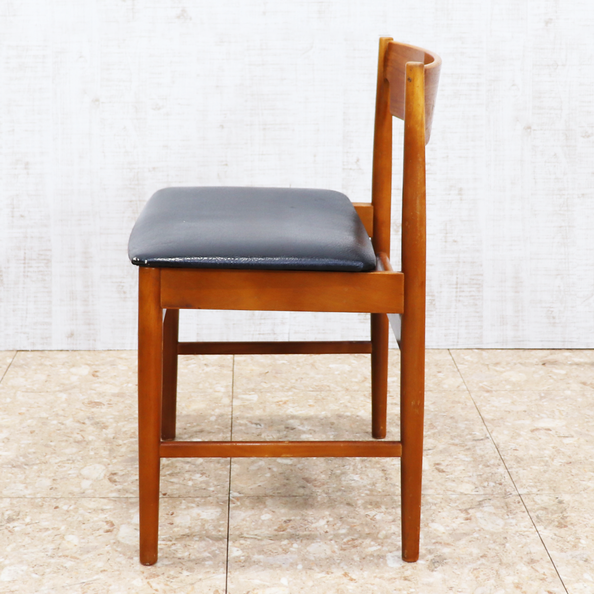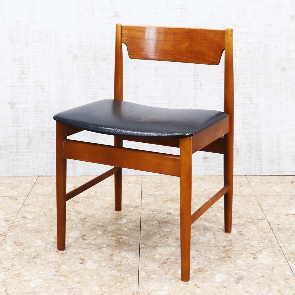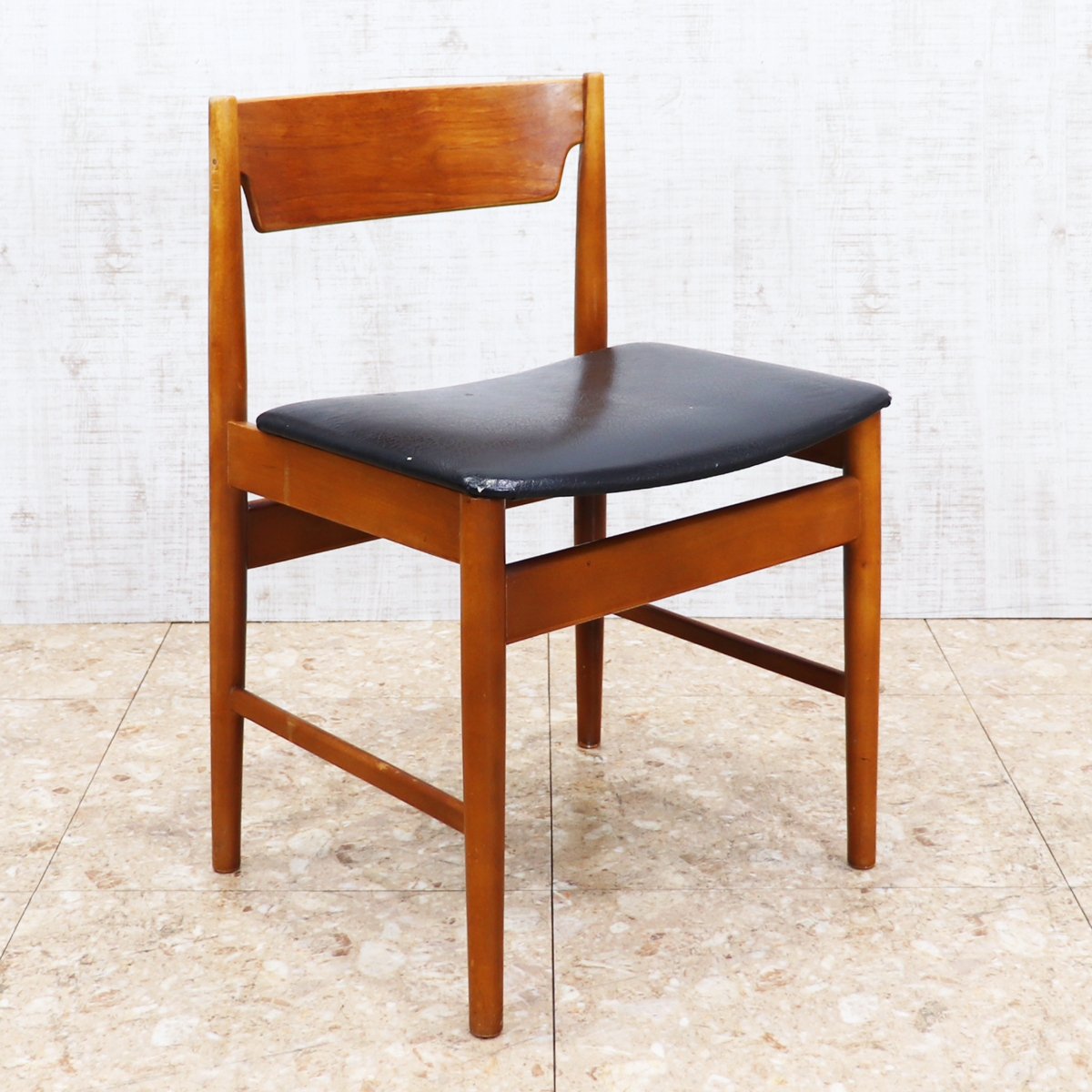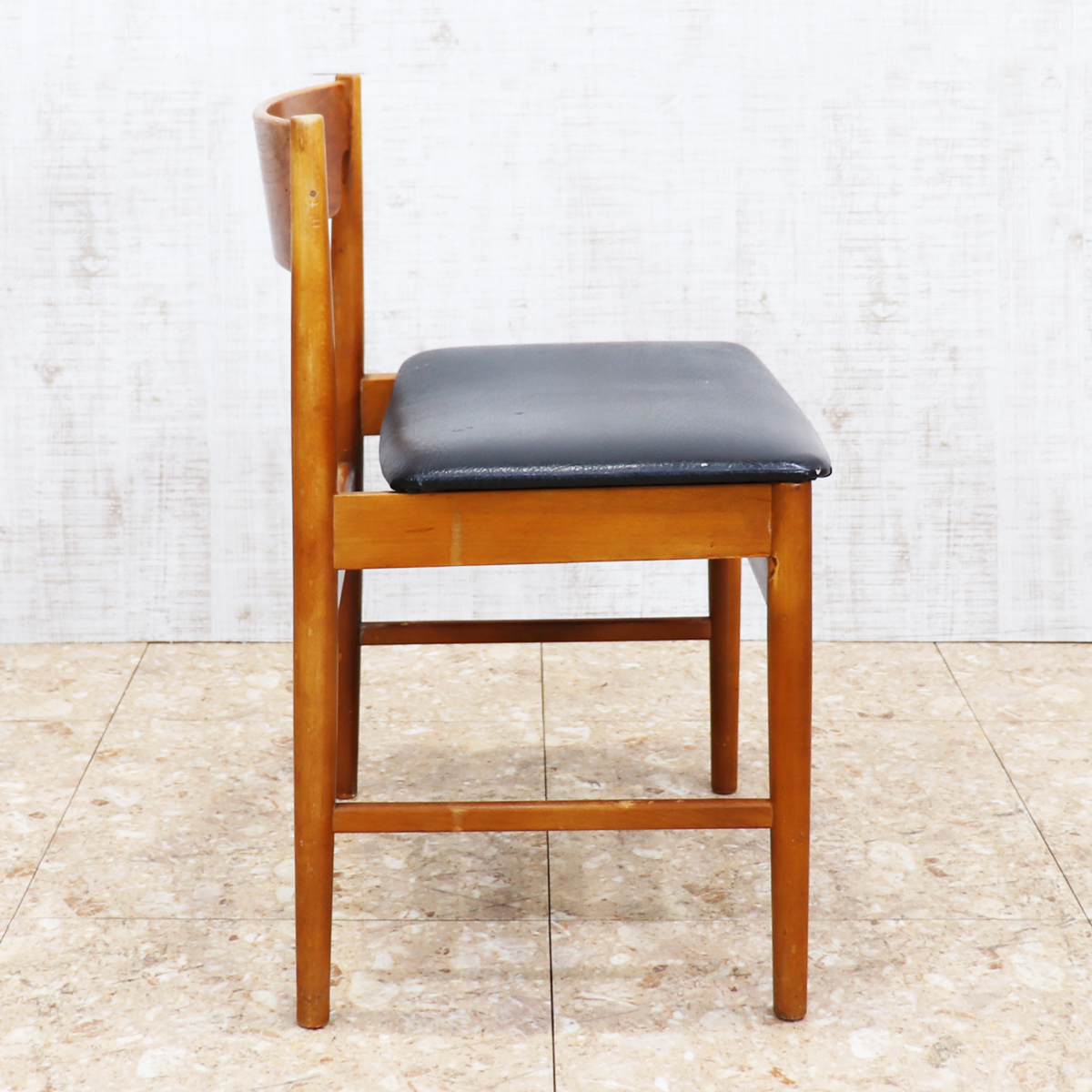 あたたかみのある木製フレームは、経年によって深みを増した色合いが魅力です。ブラックの座面とのコントラストが印象的で、ナチュラルインテリアや北欧スタイル、カフェ風の空間とも相性良く馴染みます。ダイニングチェアとしてはもちろん、デスクチェアやショップ什器、来客用チェアとしても活躍する一脚です。