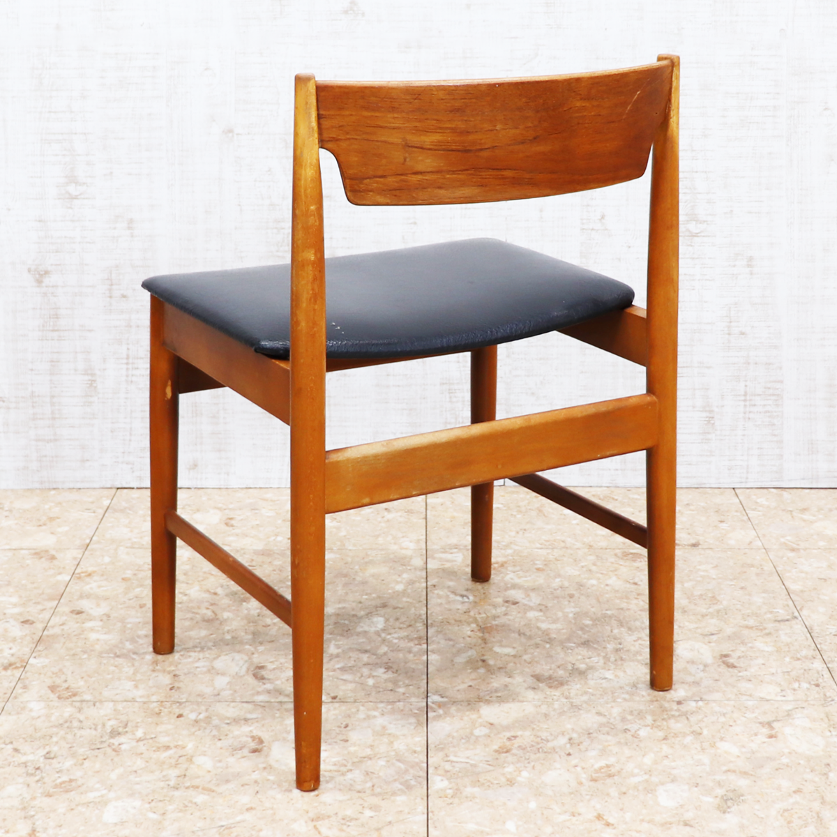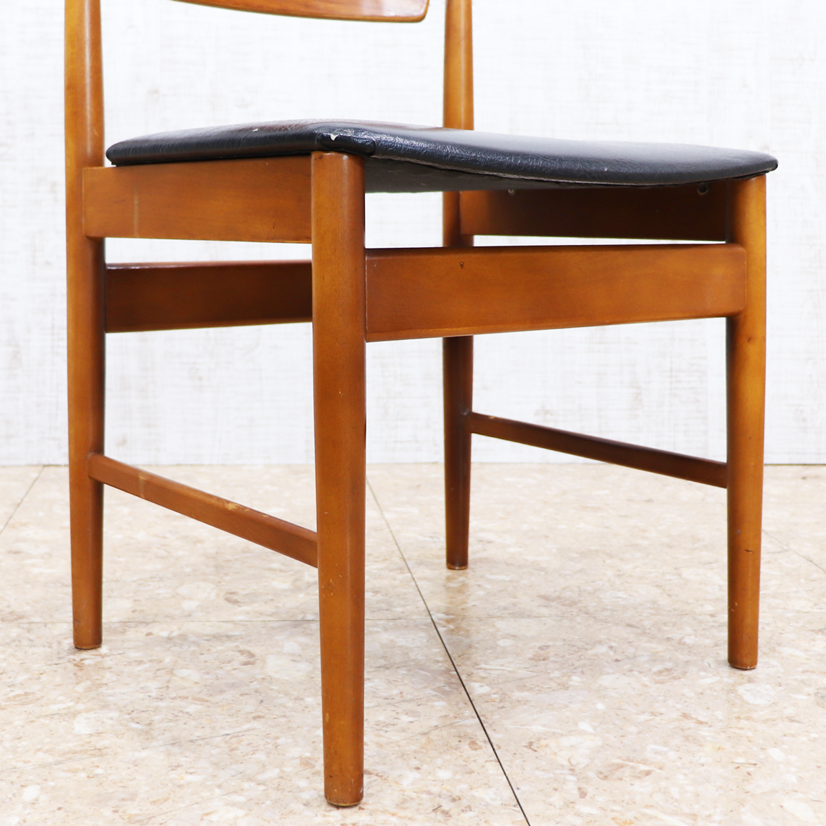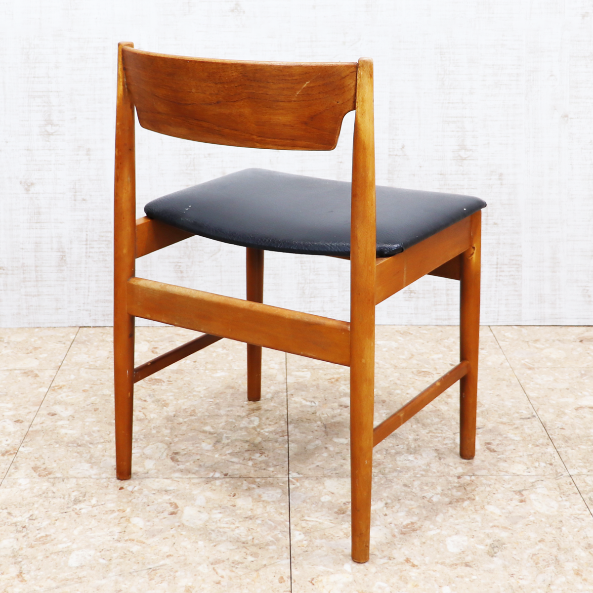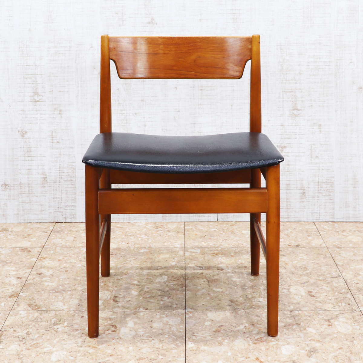 あたたかみのある木製フレームは、経年によって深みを増した色合いが魅力です。ブラックの座面とのコントラストが印象的で、ナチュラルインテリアや北欧スタイル、カフェ風の空間とも相性良く馴染みます。ダイニングチェアとしてはもちろん、デスクチェアやショップ什器、来客用チェアとしても活躍する一脚です。