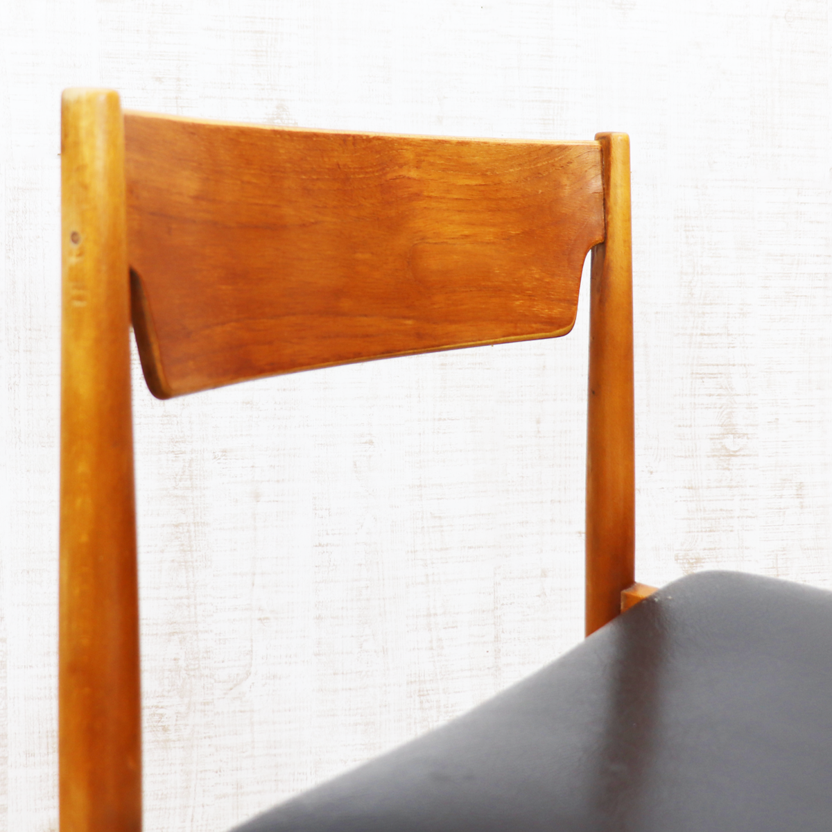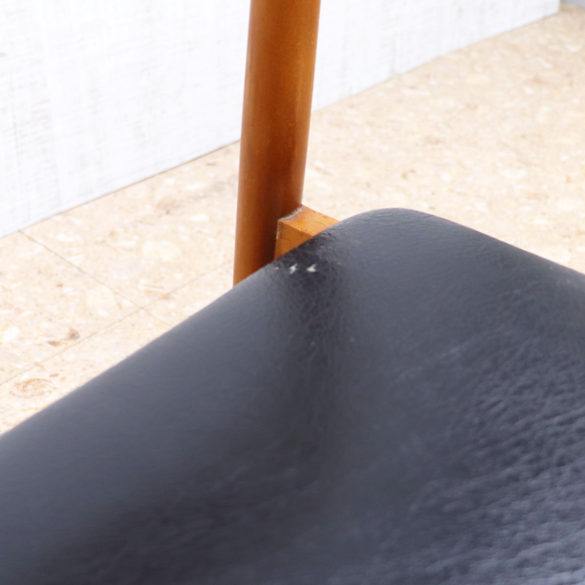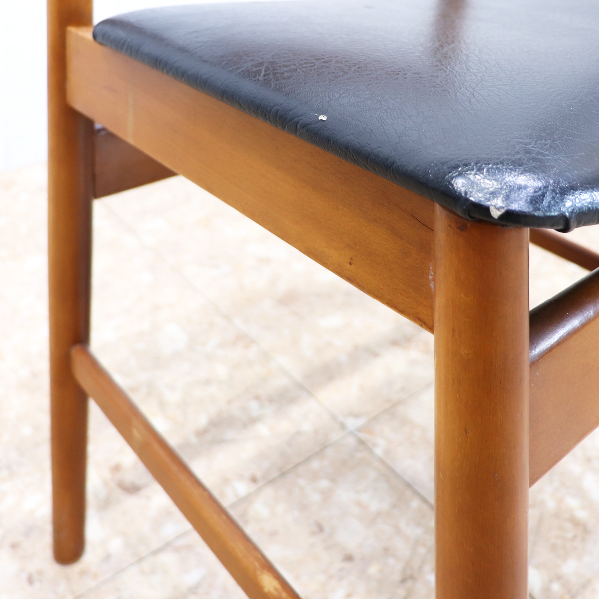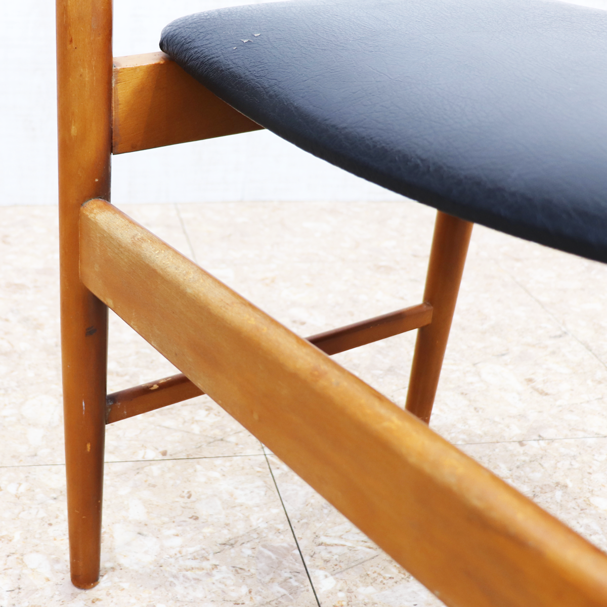 あたたかみのある木製フレームは、経年によって深みを増した色合いが魅力です。ブラックの座面とのコントラストが印象的で、ナチュラルインテリアや北欧スタイル、カフェ風の空間とも相性良く馴染みます。ダイニングチェアとしてはもちろん、デスクチェアやショップ什器、来客用チェアとしても活躍する一脚です。
